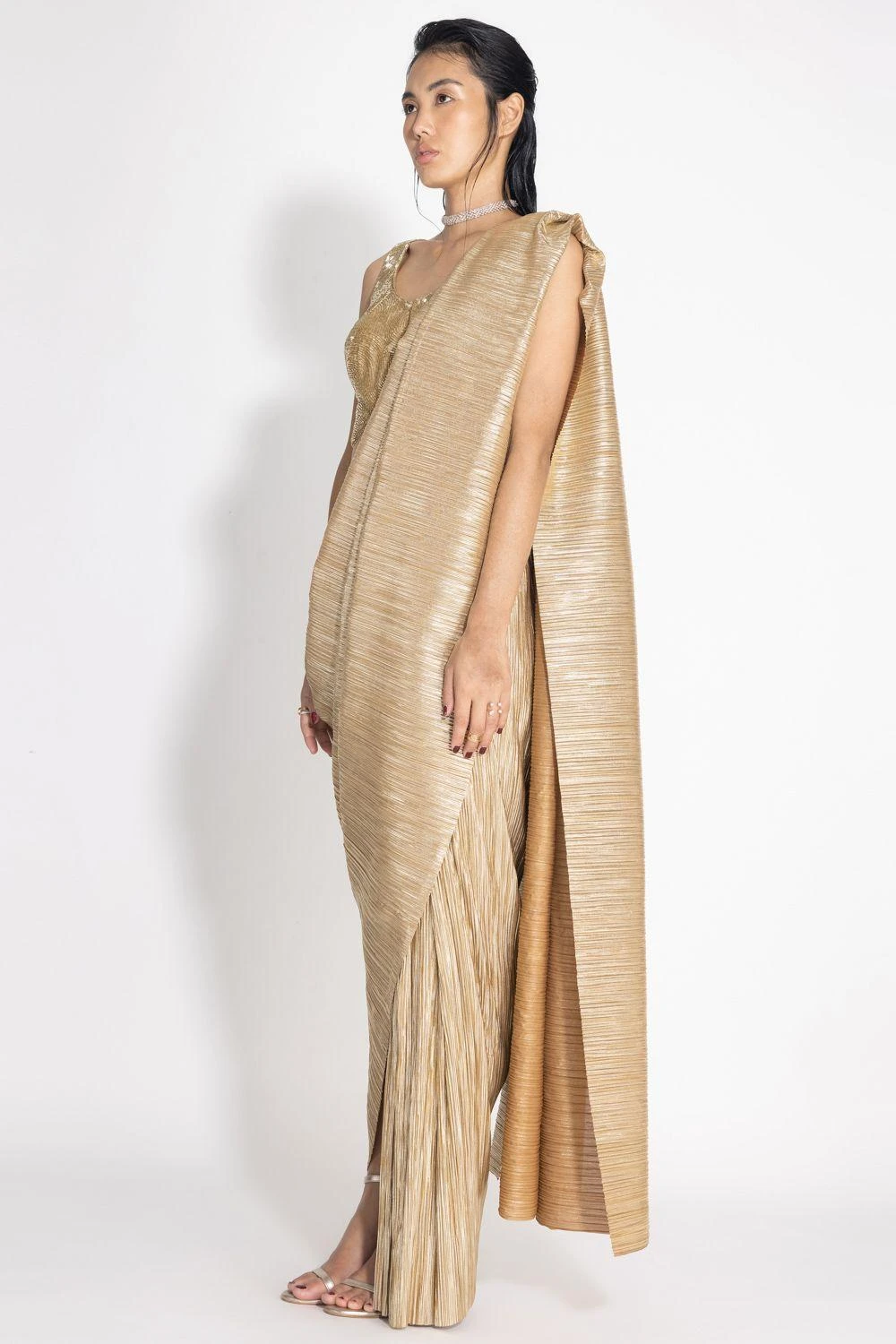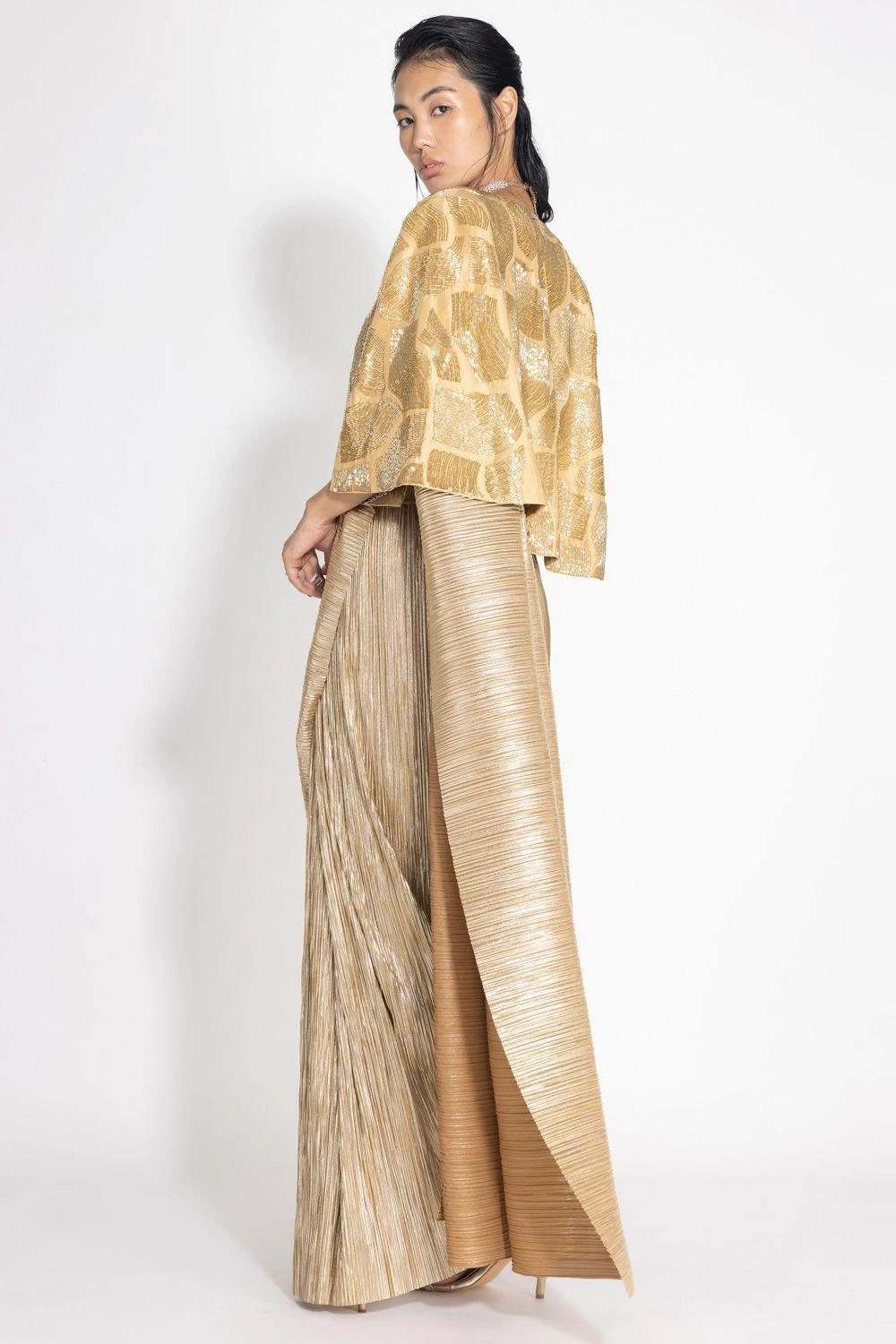 Luxe fabrication & flattering silhouette of this cape makes it a party essential. This gold blouse features embroidered details with a cut out back detail. Pair it with a concept sari from the collection to complete the set.