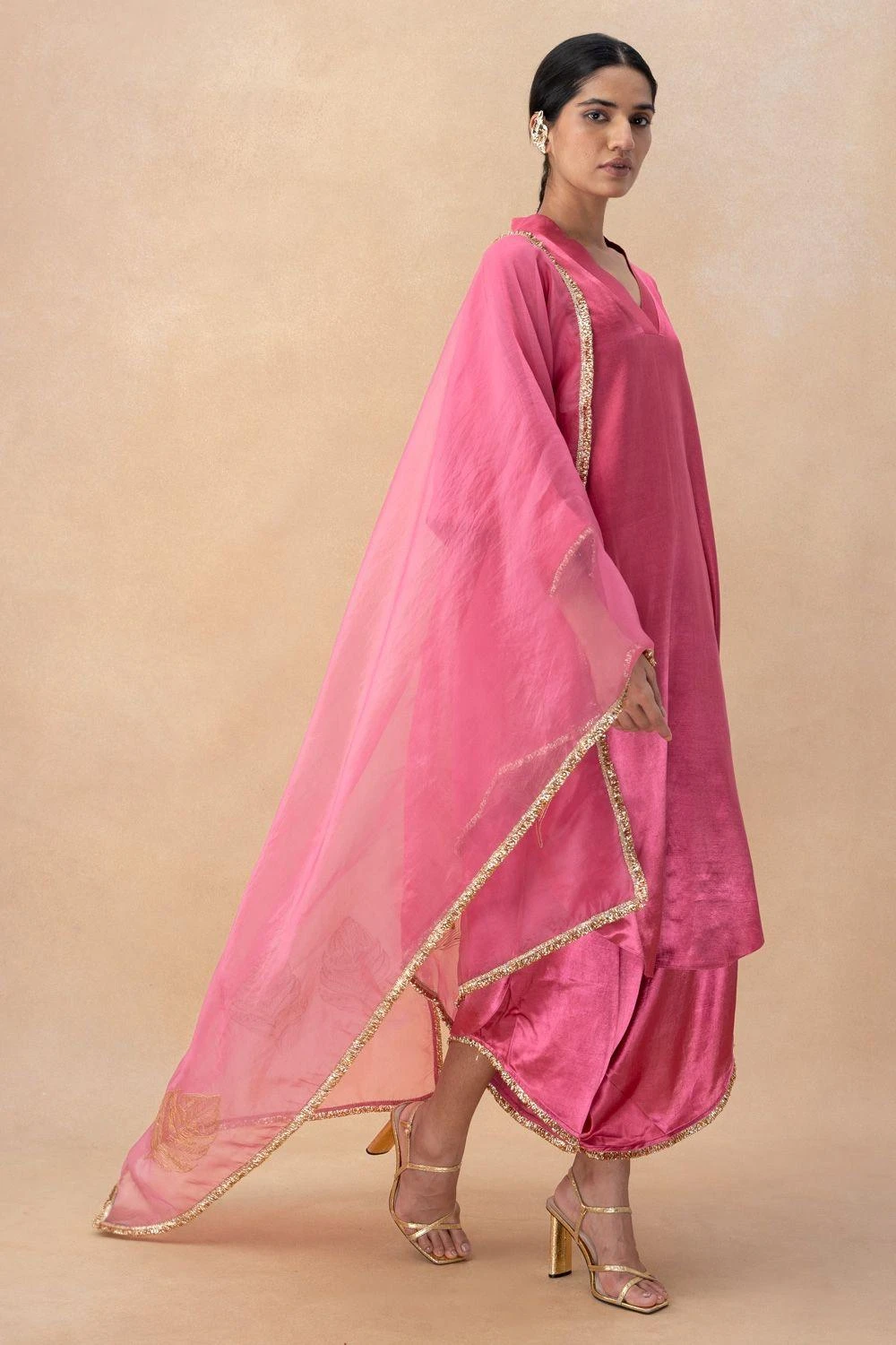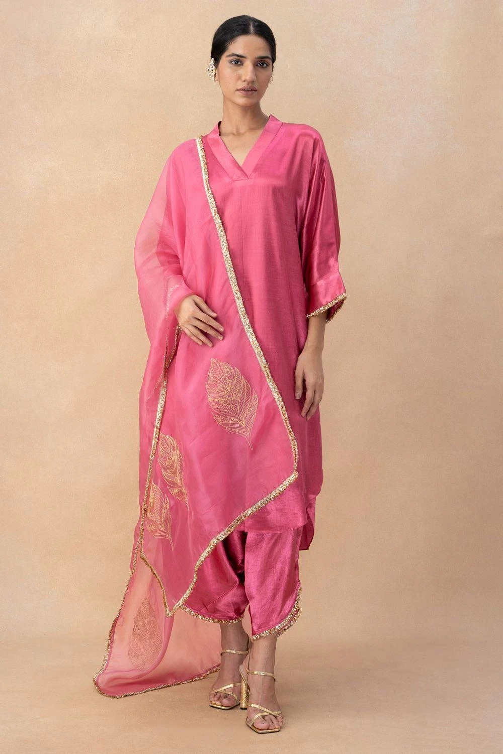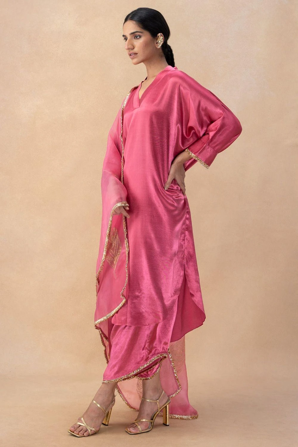 Immerse yourself in opulence with this Mashru silk kaftan tunic, accentuated by intricate gold kiran detailing. Paired effortlessly with low-crotch pants & adorned with an exquisite organza embroidered dupatta, this ensemble redefines luxury & style.