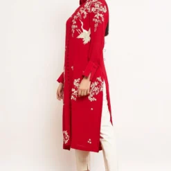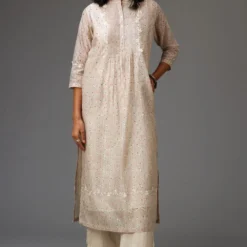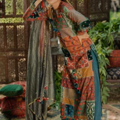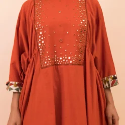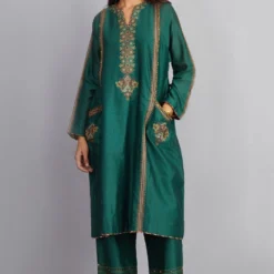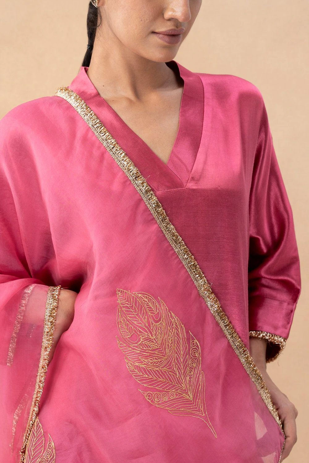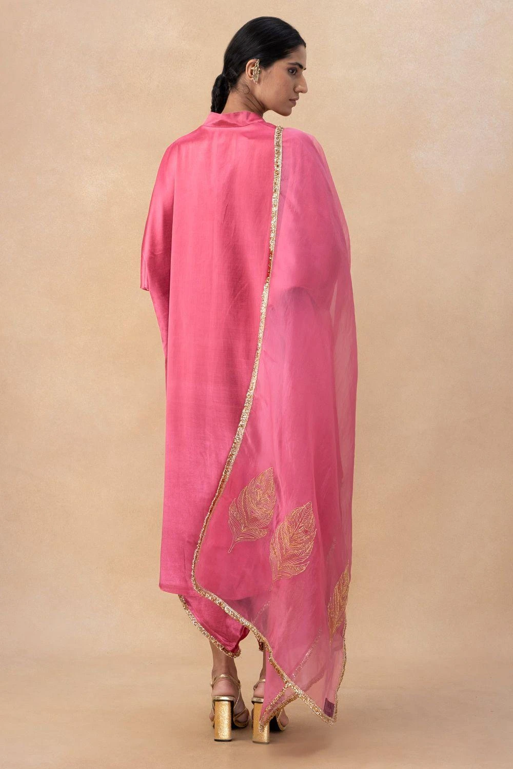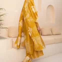 Immerse yourself in opulence with this Mashru silk kaftan tunic, accentuated by intricate gold kiran detailing. Paired effortlessly with low-crotch pants & adorned with an exquisite organza embroidered dupatta, this ensemble redefines luxury & style.
