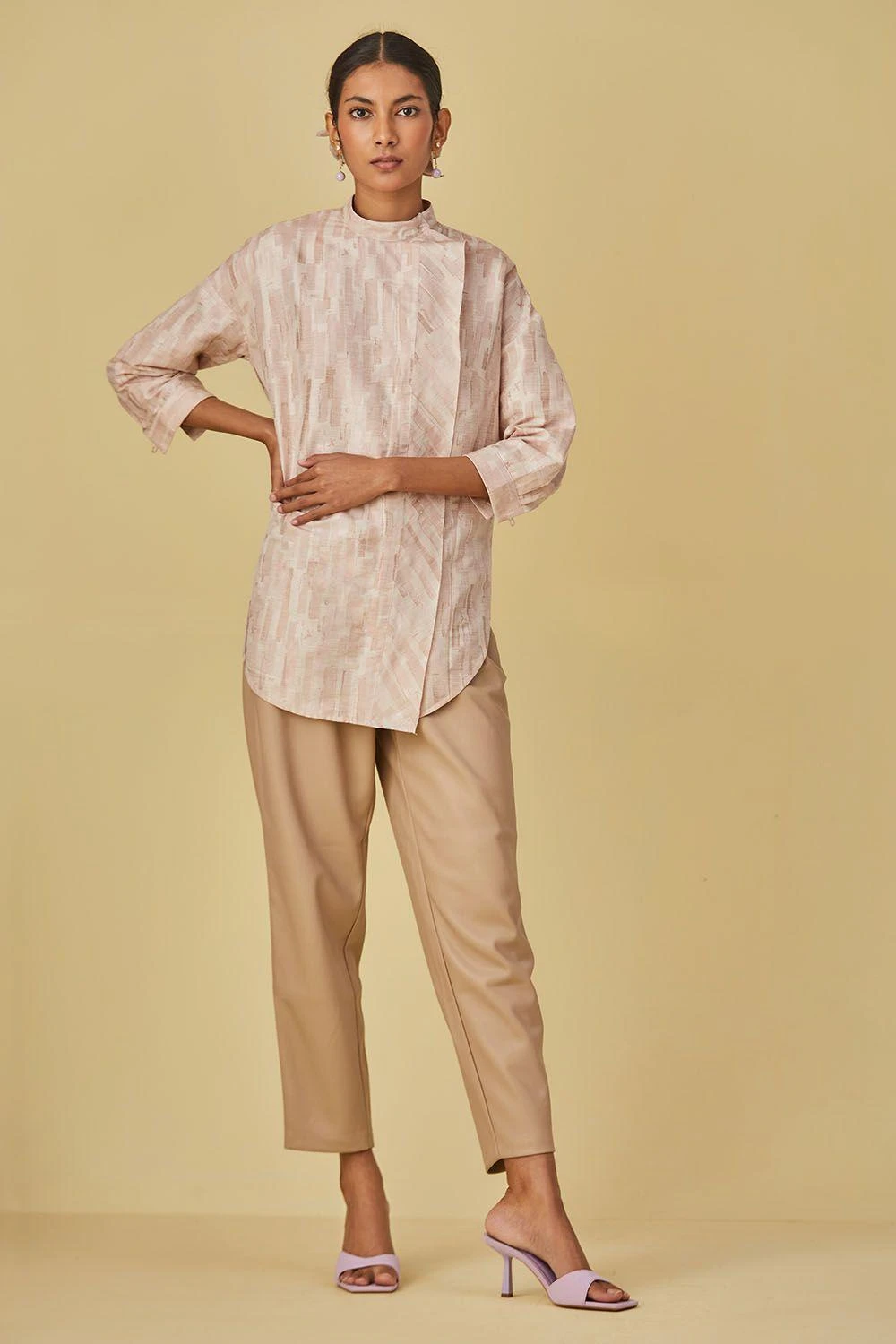 Made in signature silk linen fabric and brush stroke design, this short shirt is detailed with off centred placket making it a versatile pick for your formal and informal morsels.
