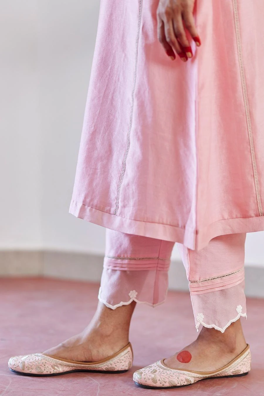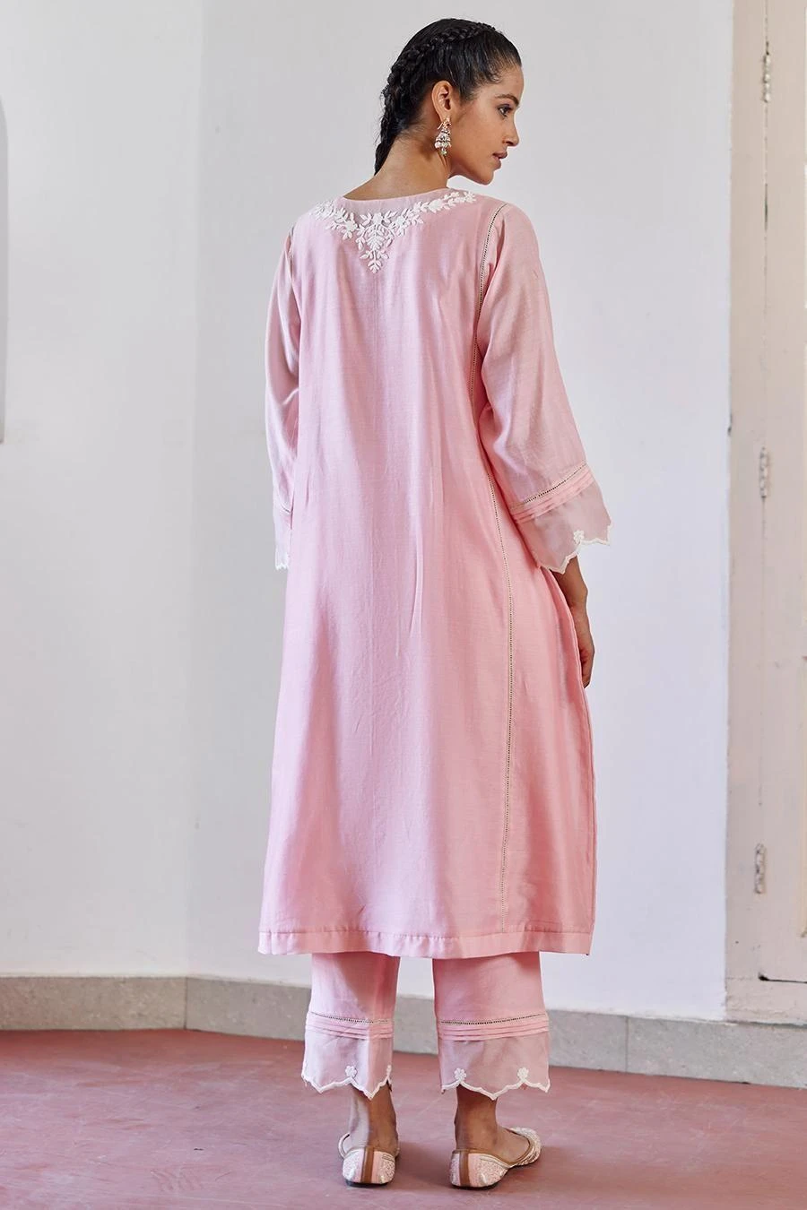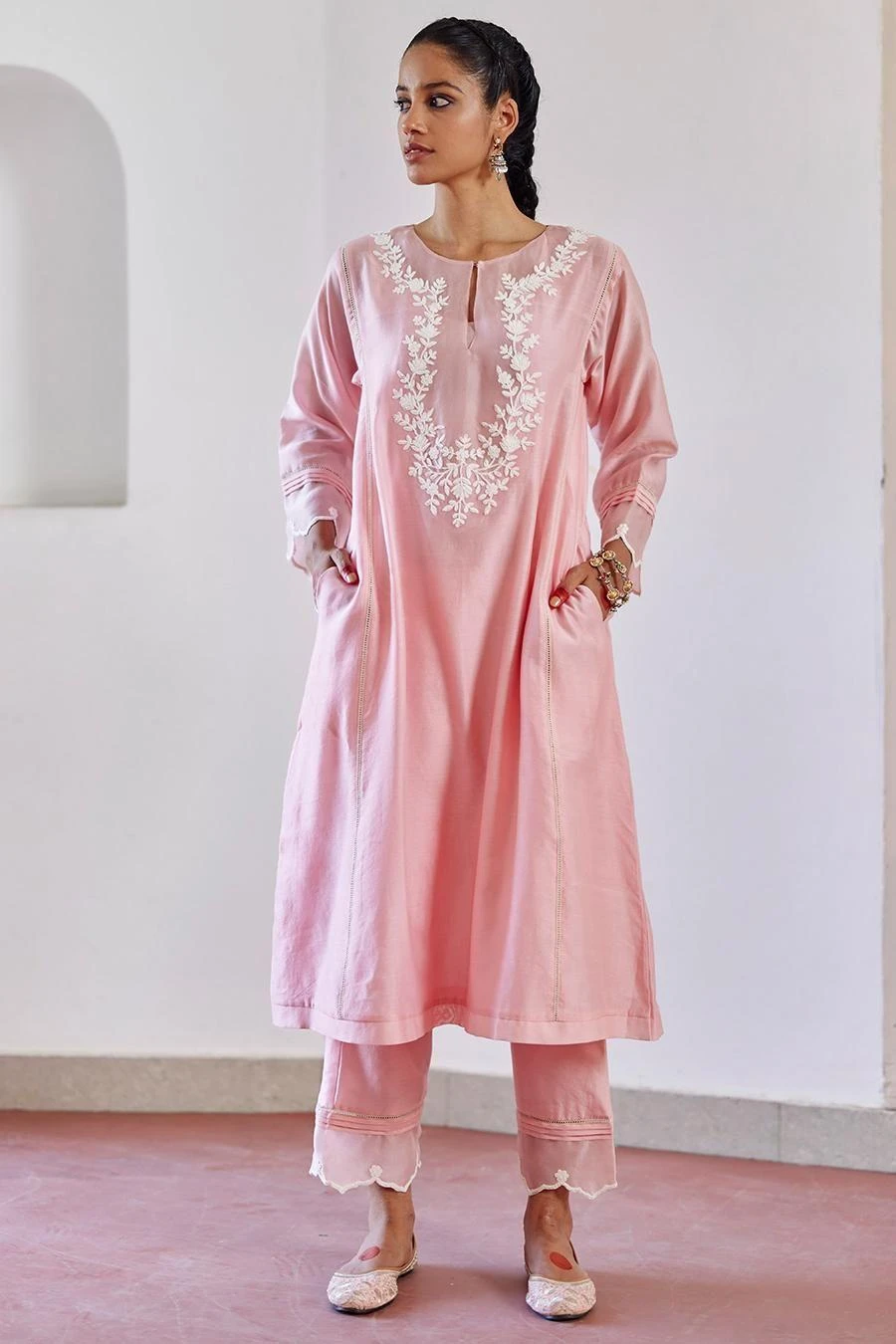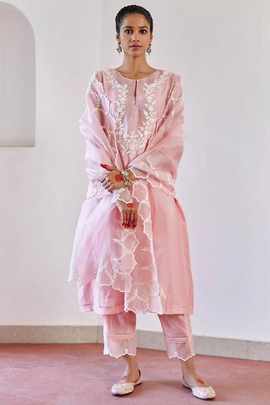 Adorned with intricate floral ivory cord embroidery on the neckline, sleeves, this kurta is paired with a wispy organza dupatta with a delicate floral scallop on the edge & straight pants.