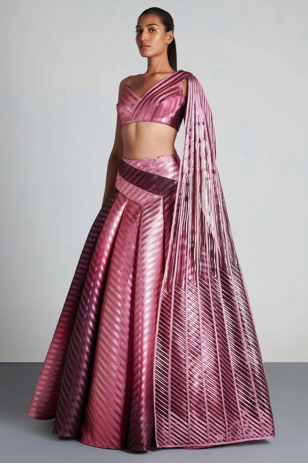 This plum & pink ombre metallic lehenga set by Amit Aggarwal incorporates art and innovation. It features a voluminous panelled lehenga paired with an asymmetric blouse accentuated with an attached sunray drape.