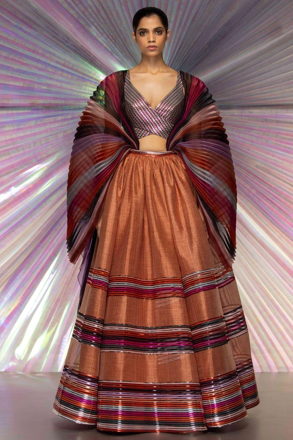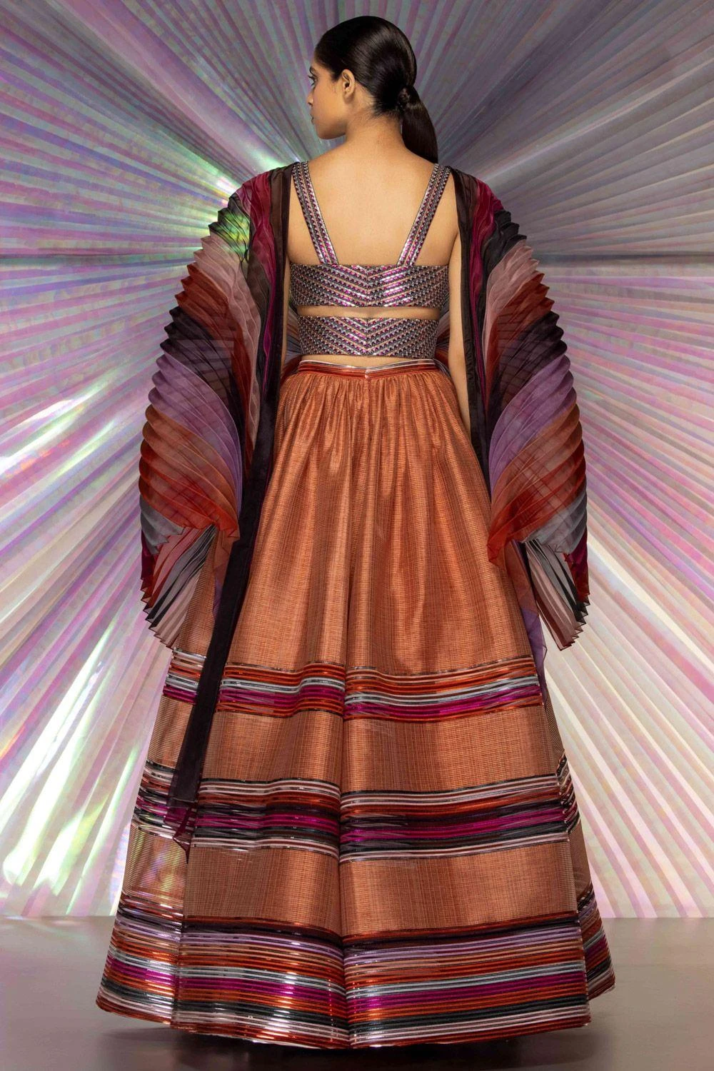 Indian couture takes on a whole new meaning with this avant-garde rust ensemble. It features a gathered striped lehenga, paired with metallic moulded hand woven blouse in polymer and a unique plisse drape which finishes the look.