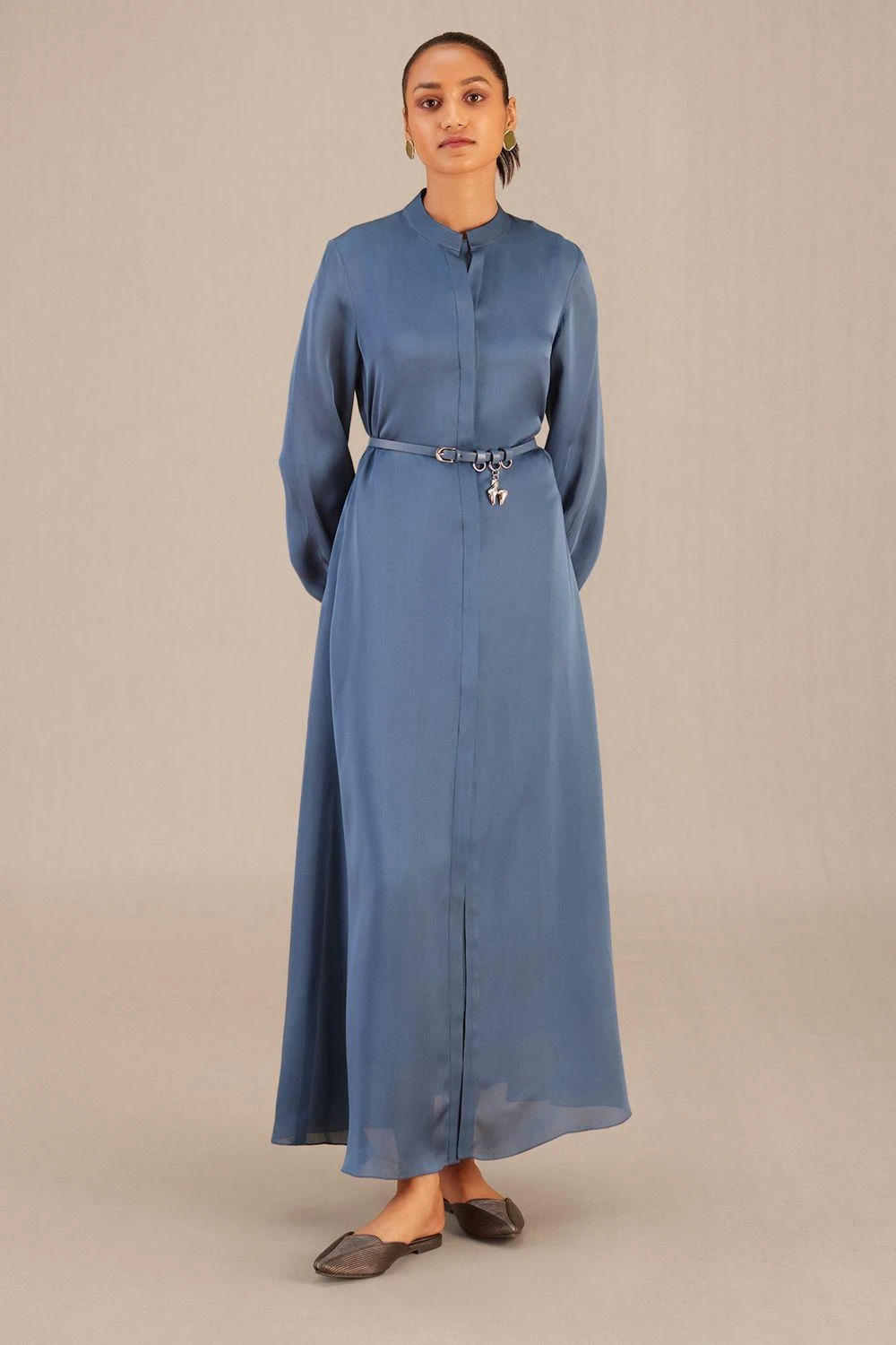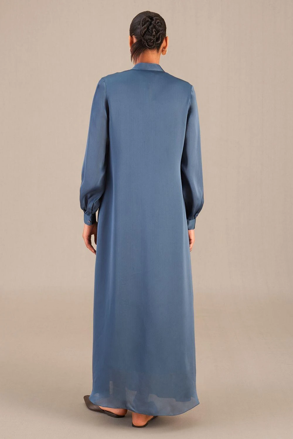 Elevate your style with this blue satin-organza abaya, perfect for special occasions like weddings or upscale events. Paired with a belt and scarf, it adds a touch of sophistication & unique flair. Ideal for making a statement at formal gatherings.