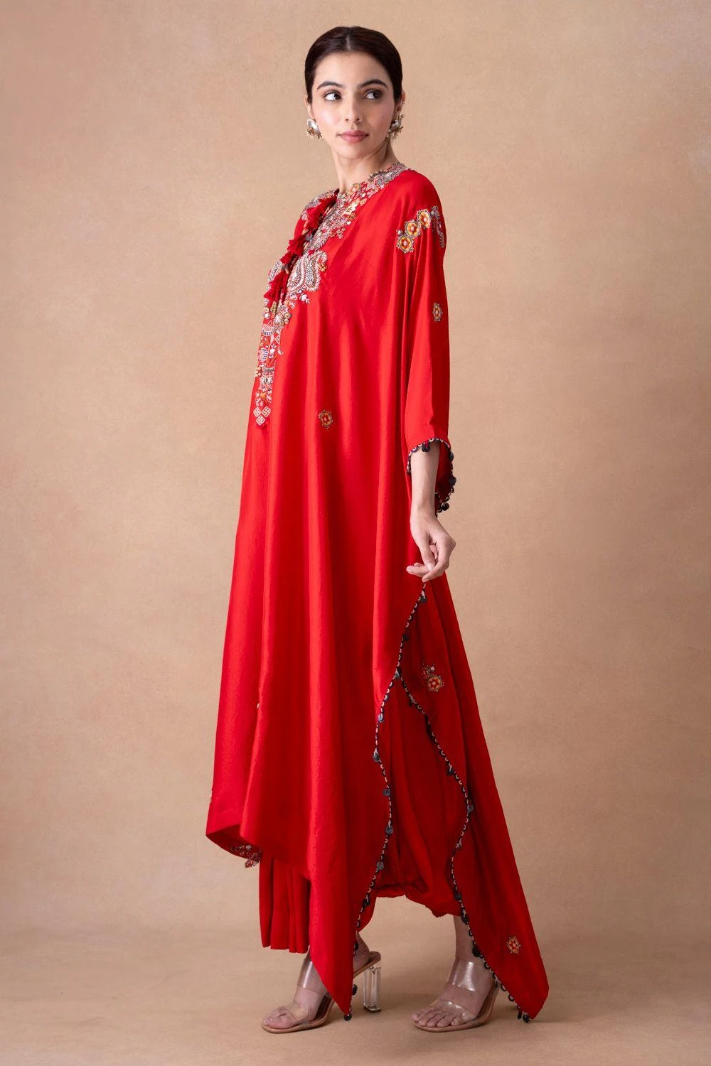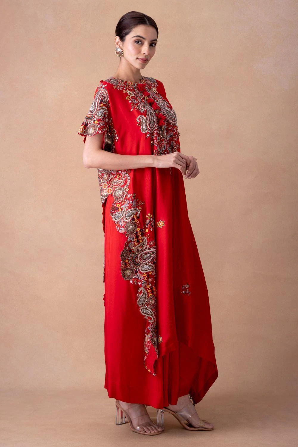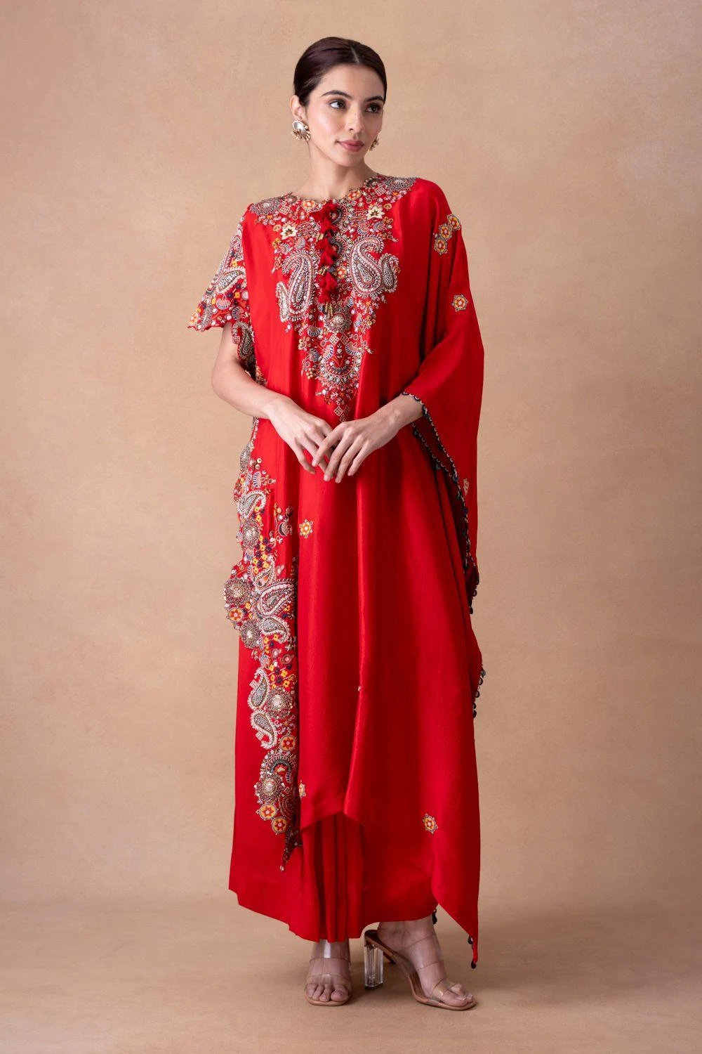 Embark on a sartorial journey with the silk kaftan-skirt set. Adorned with floral, paisley & sequin motifs, enhanced by elegant tassels. Effortlessly transition from sunlit soirÒes to moonlit galas. Elevate every occasion with grace & glamour.