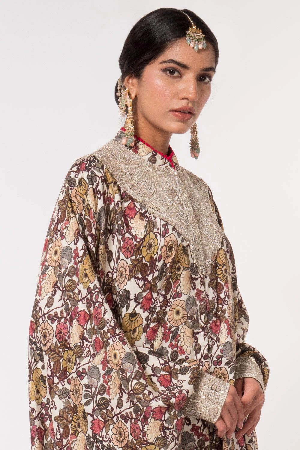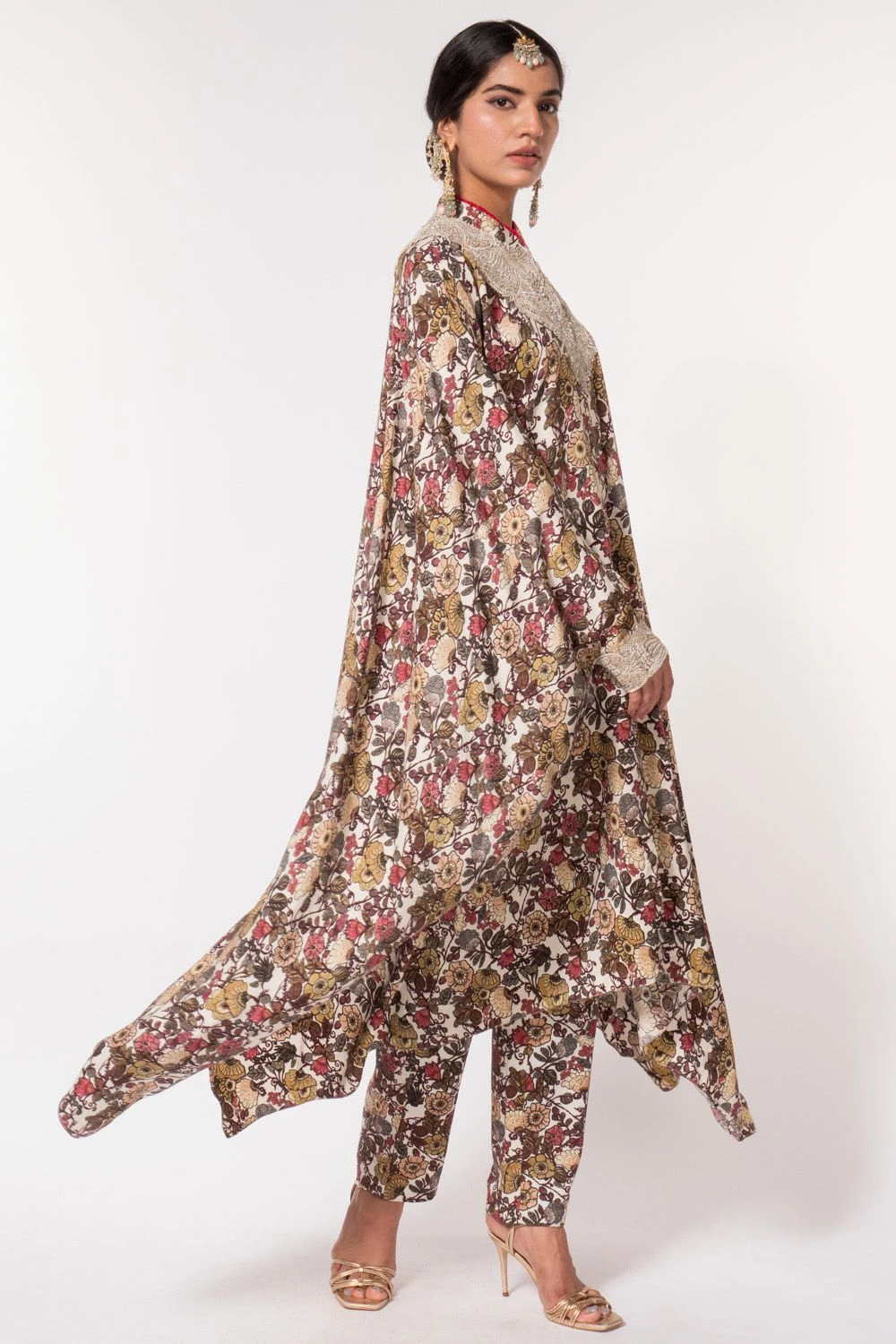 For your pre-wedding functions, this printed kaftan set is all you need to stay comfortable all the way through. It is cut in sumptuous silk and features understated embroidery details on the neckline & cuffs.