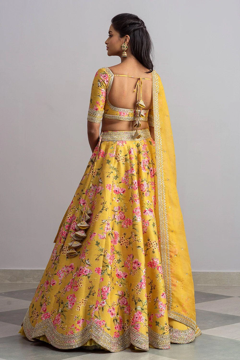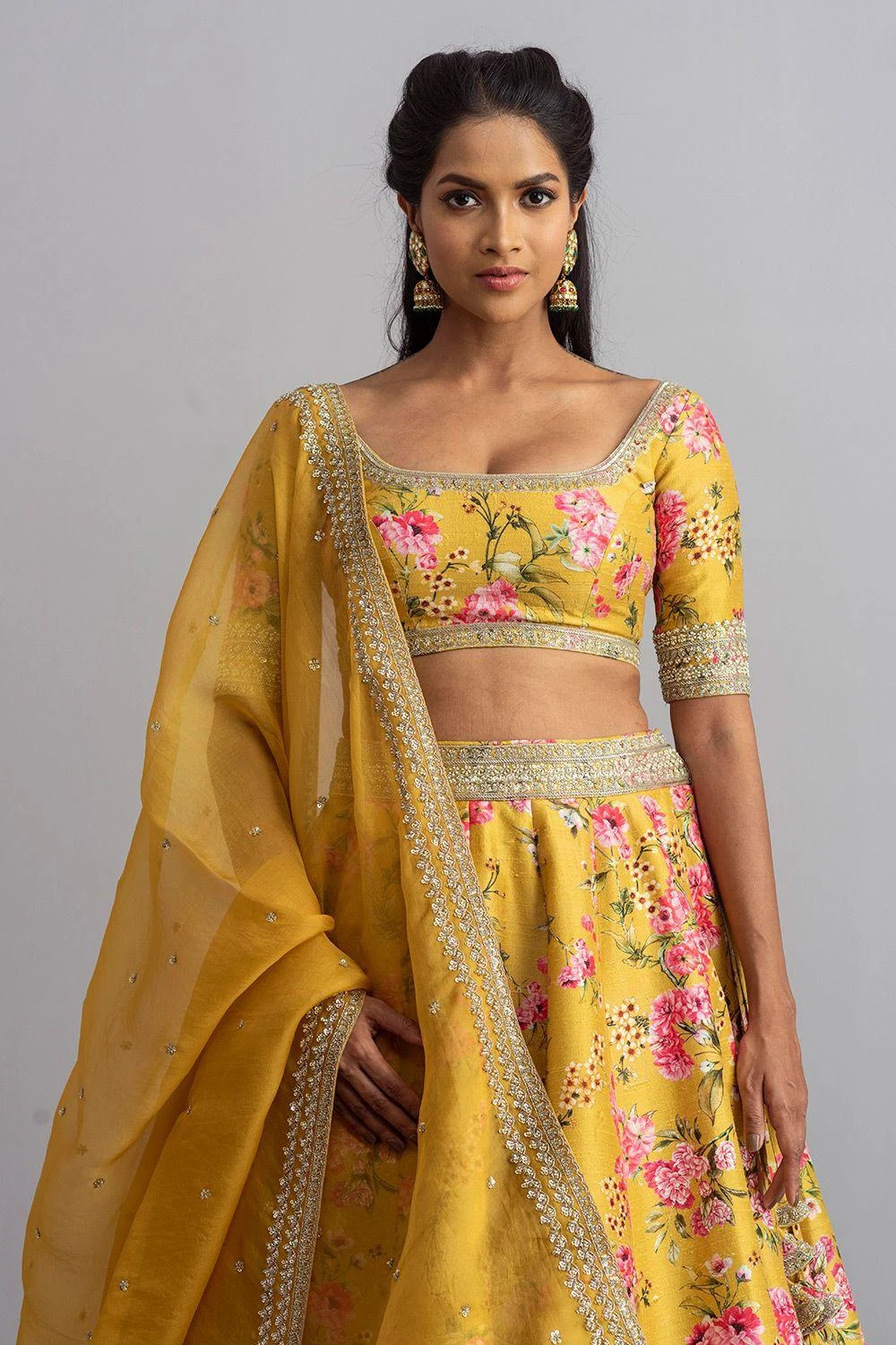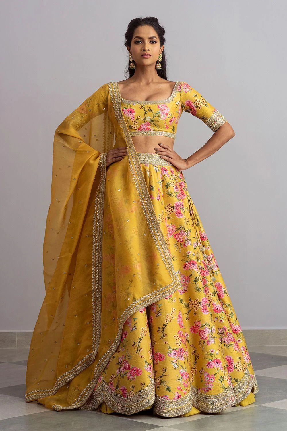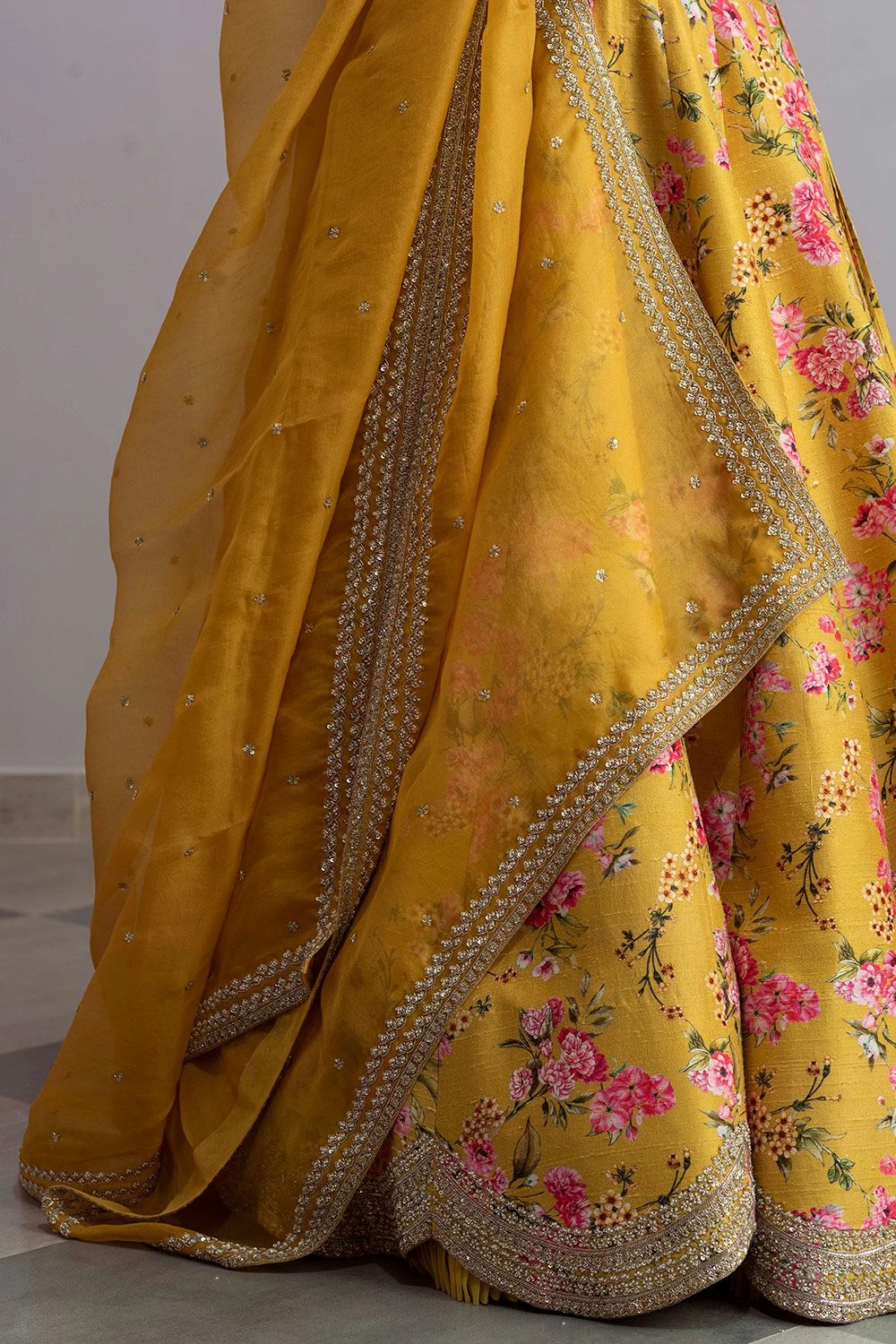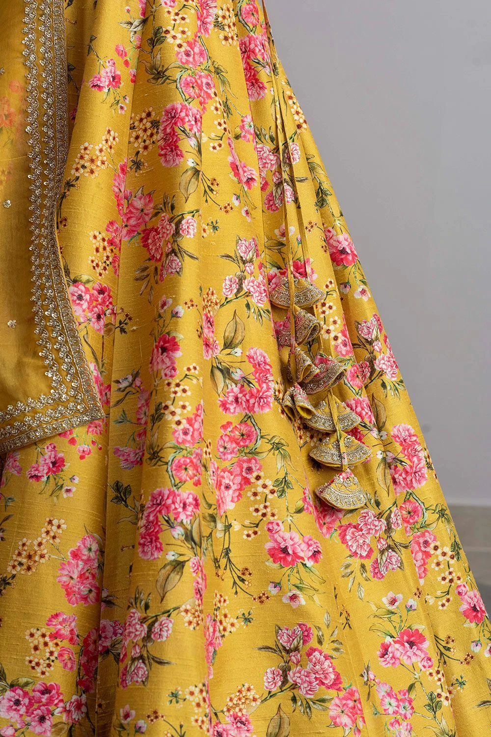 Radiate sheer vibrance in this mustard yellow embellished lehenga set. It is designed in floral printed luxe raw silk base and adorned with intricate cutdana embroidery. It is paired with an elegant organza scalloped dupatta.