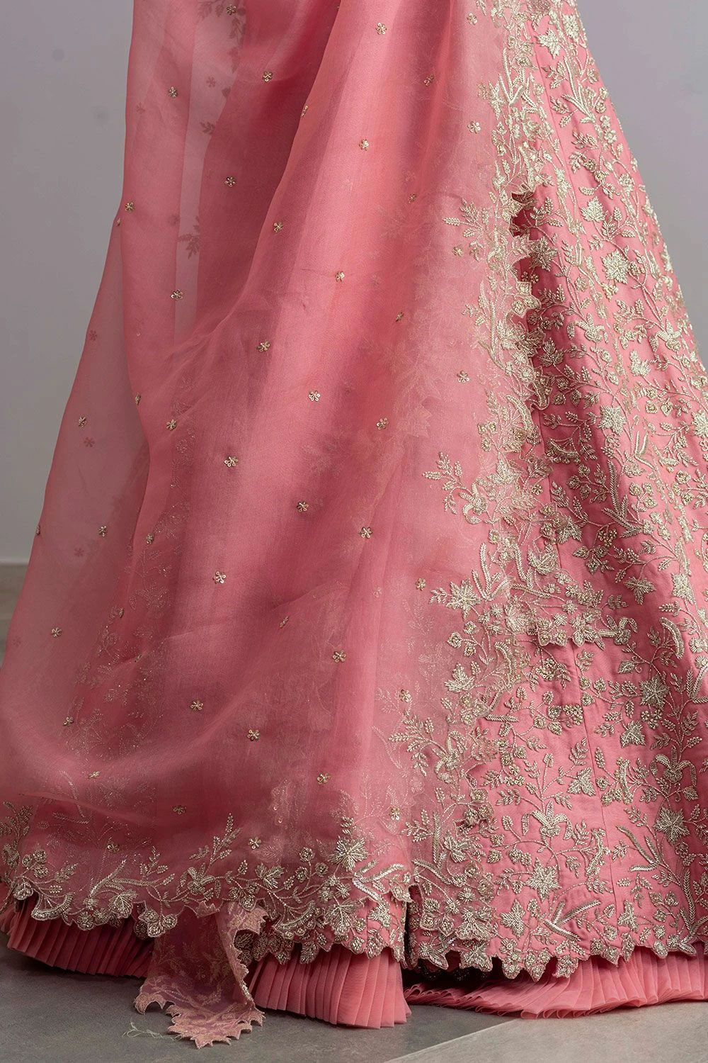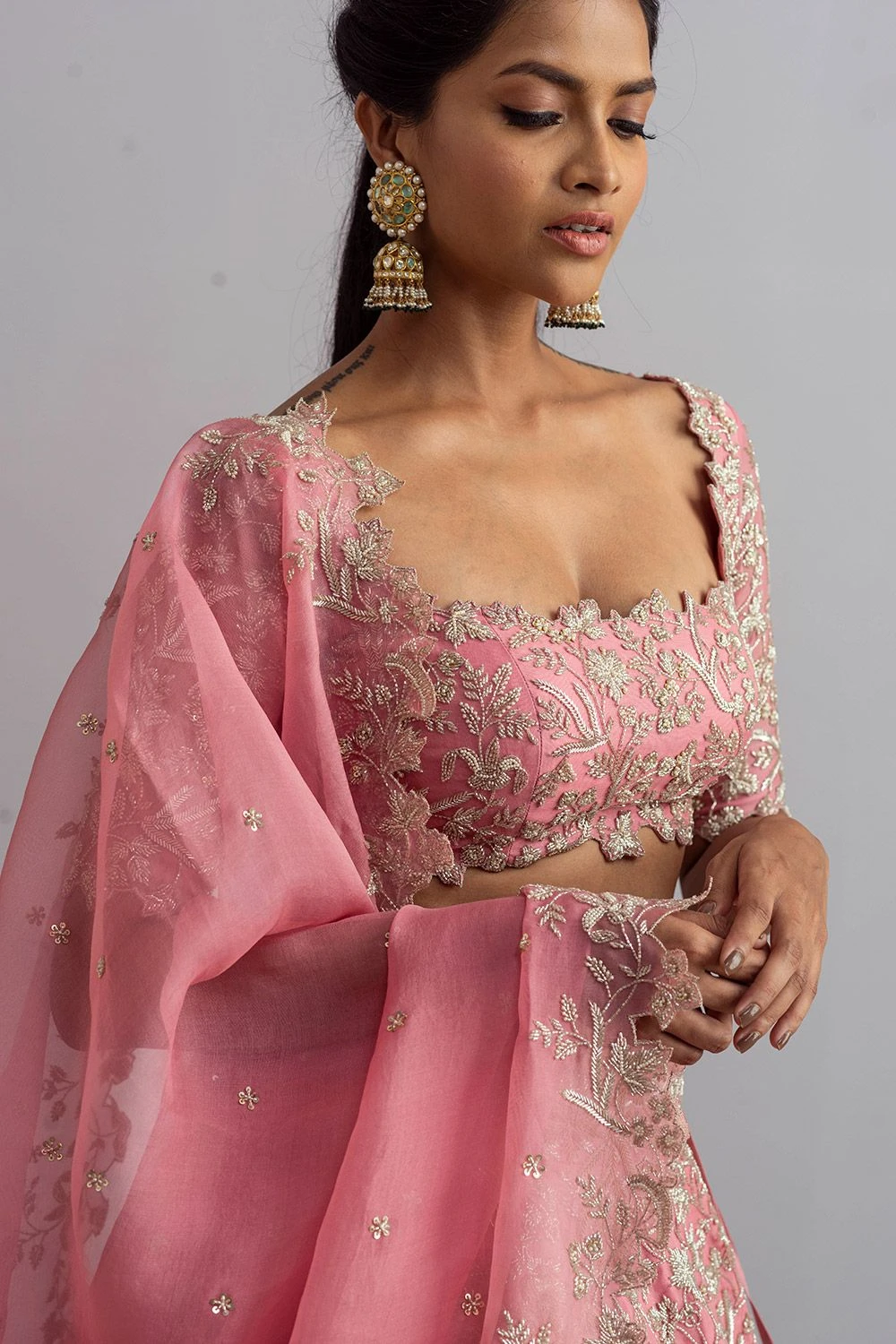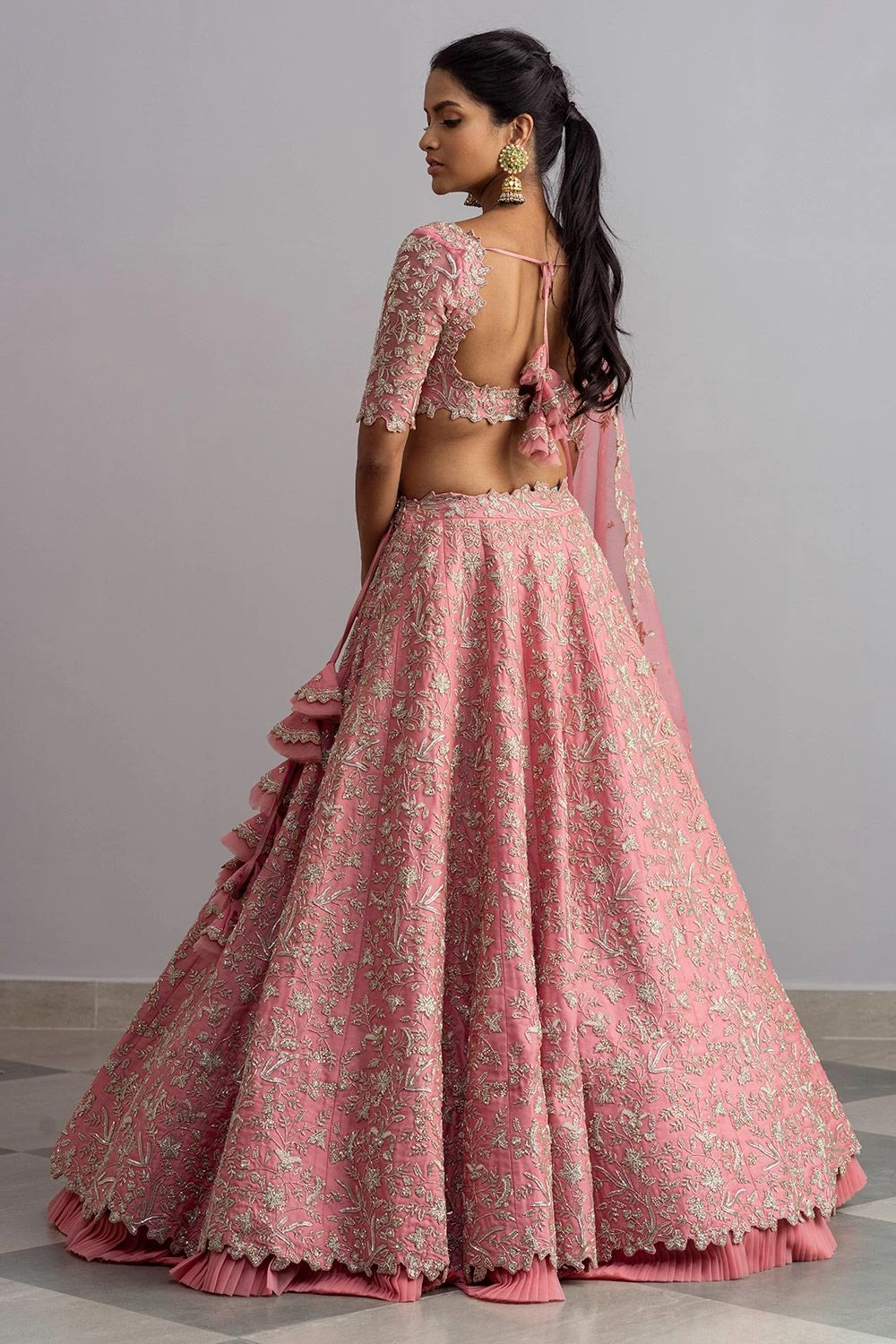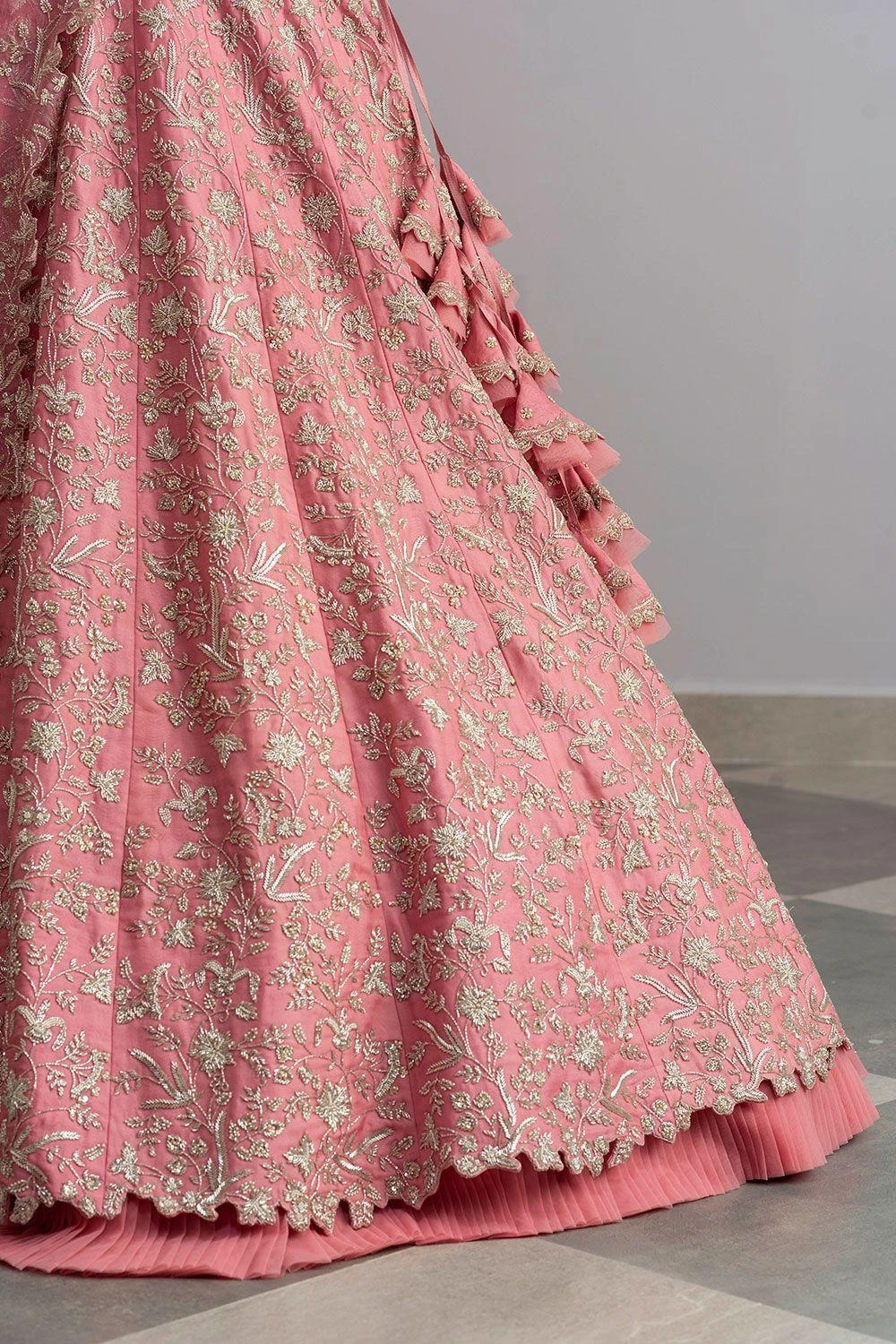 Your wedding trousseau definitely deserves a grandeur & majestic lehenga set. This rose pink lehenga is made in organza and adorned with full creeper cutdana work. You can adorn a polki necklace with this look.