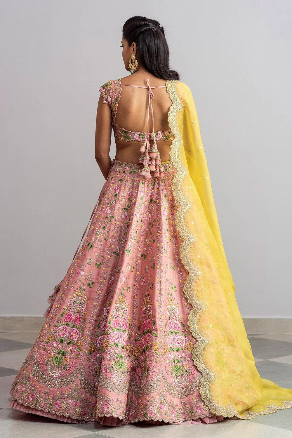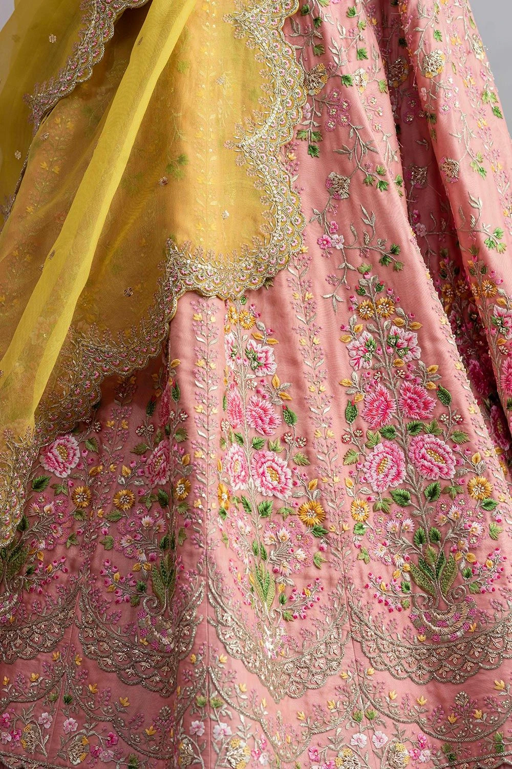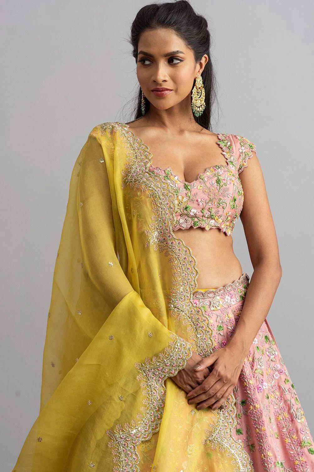 Nothing can beat the splendidness of a soft rose pink lehenga set. It is made in organza base and adorned with intricate thread work embellishments. The set is complemented with a scalloped organza yellow dupatta.