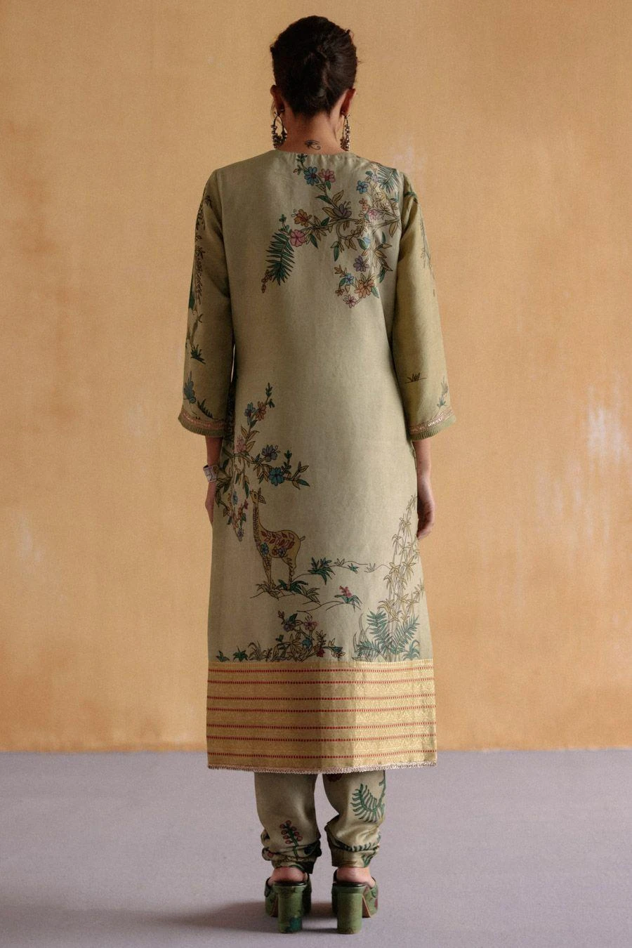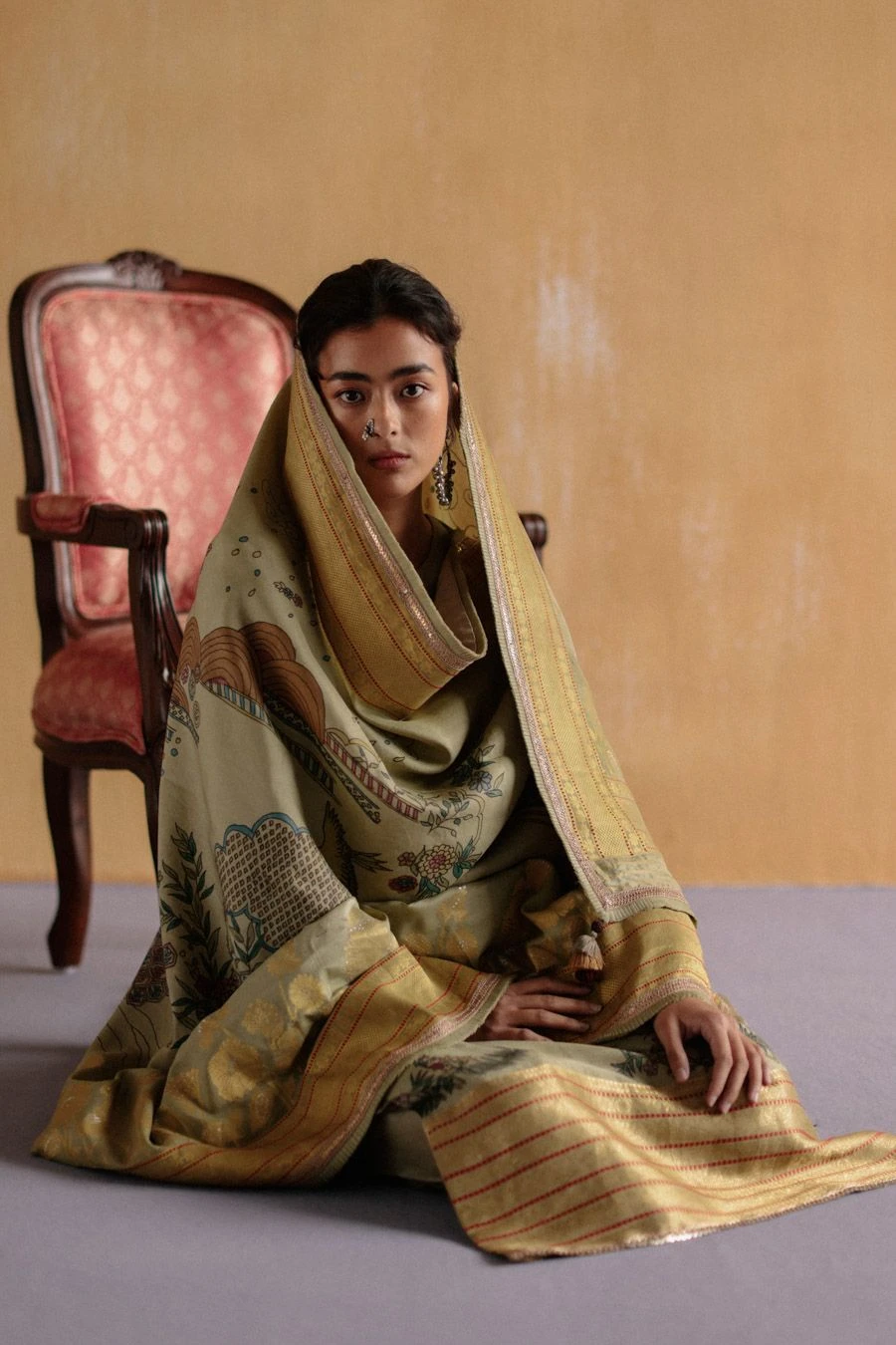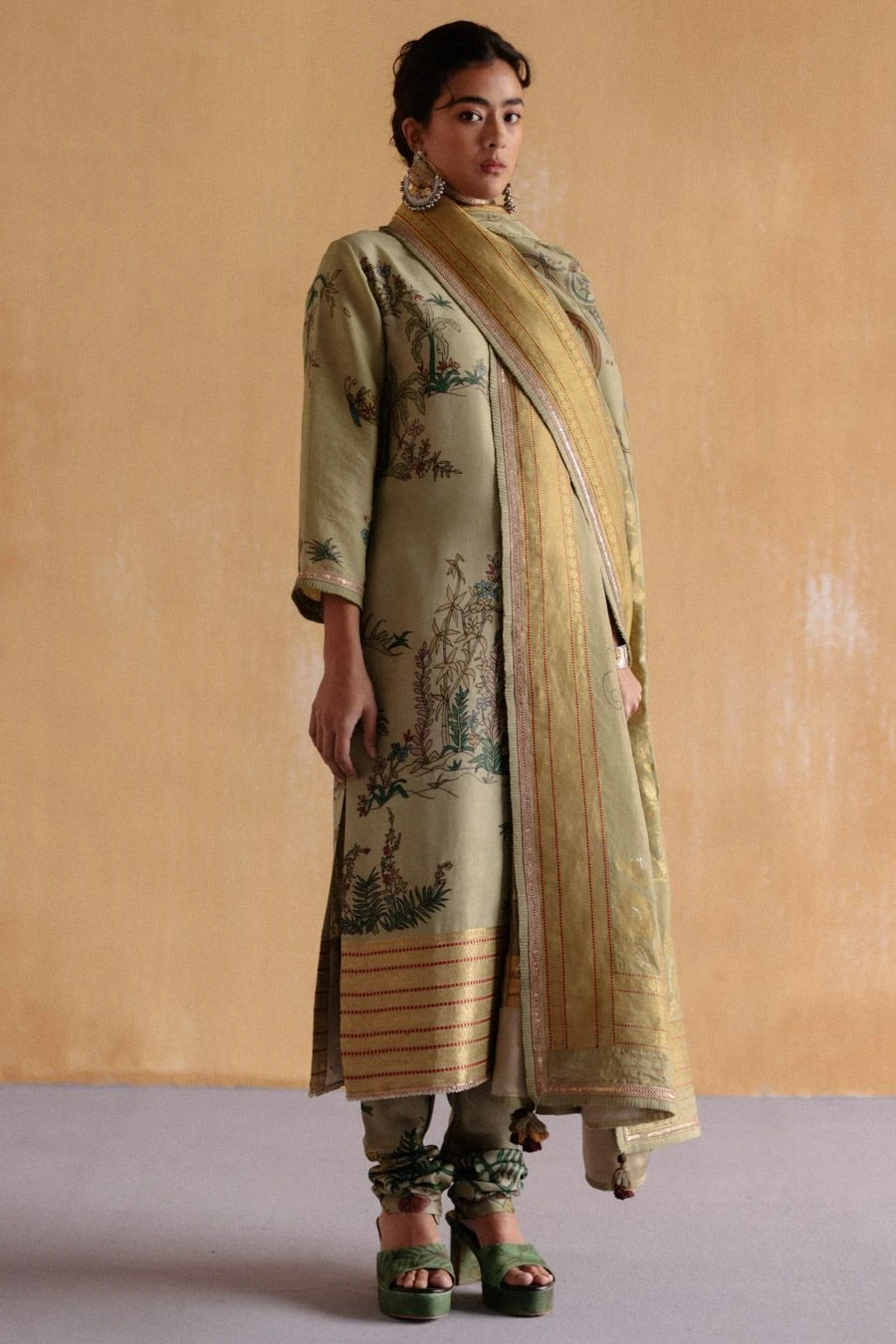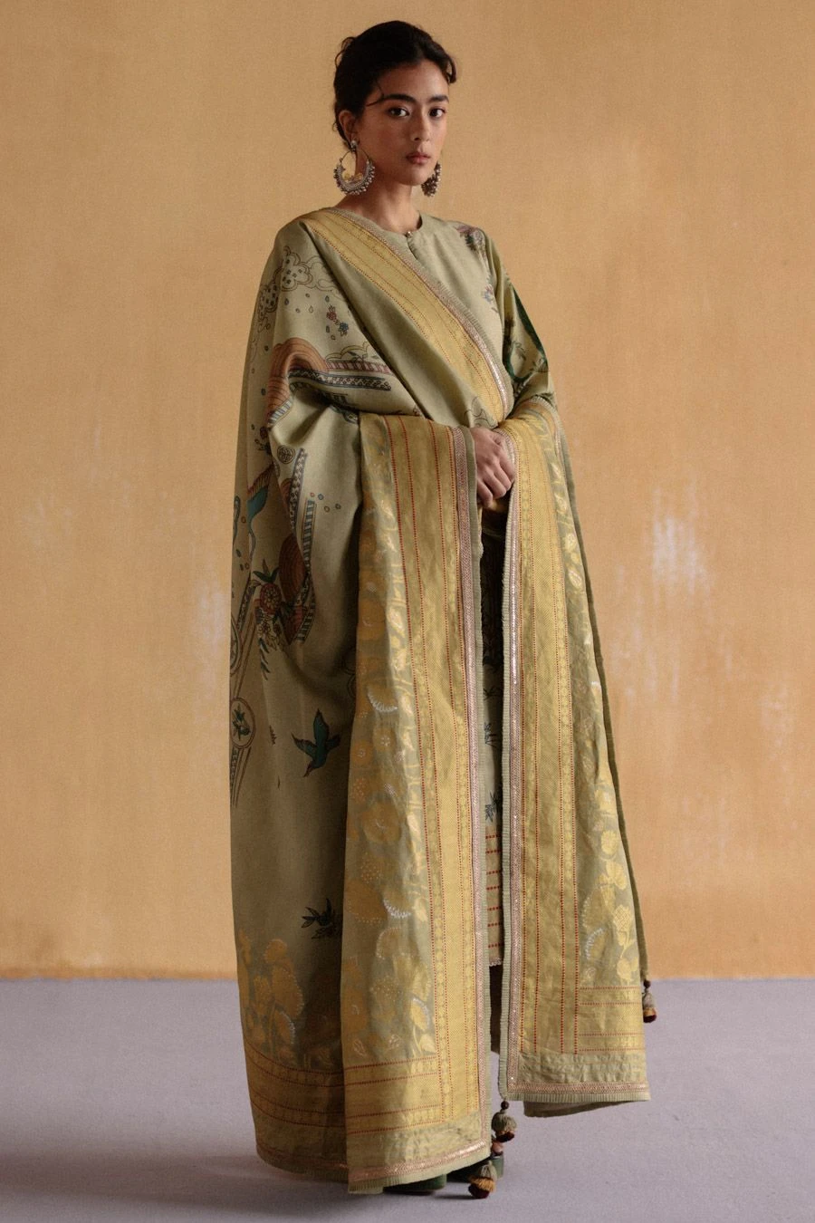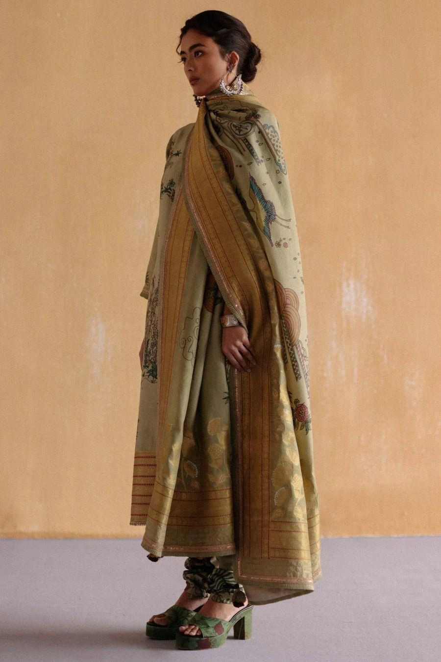 Make a resplendent statement in this ethnic marvel and let your sartorial elegance speak volumes. Crafted in handwoven kanchi silk, this set features a handpainted kalamkari kurta paired with coordinating pants & dupatta.