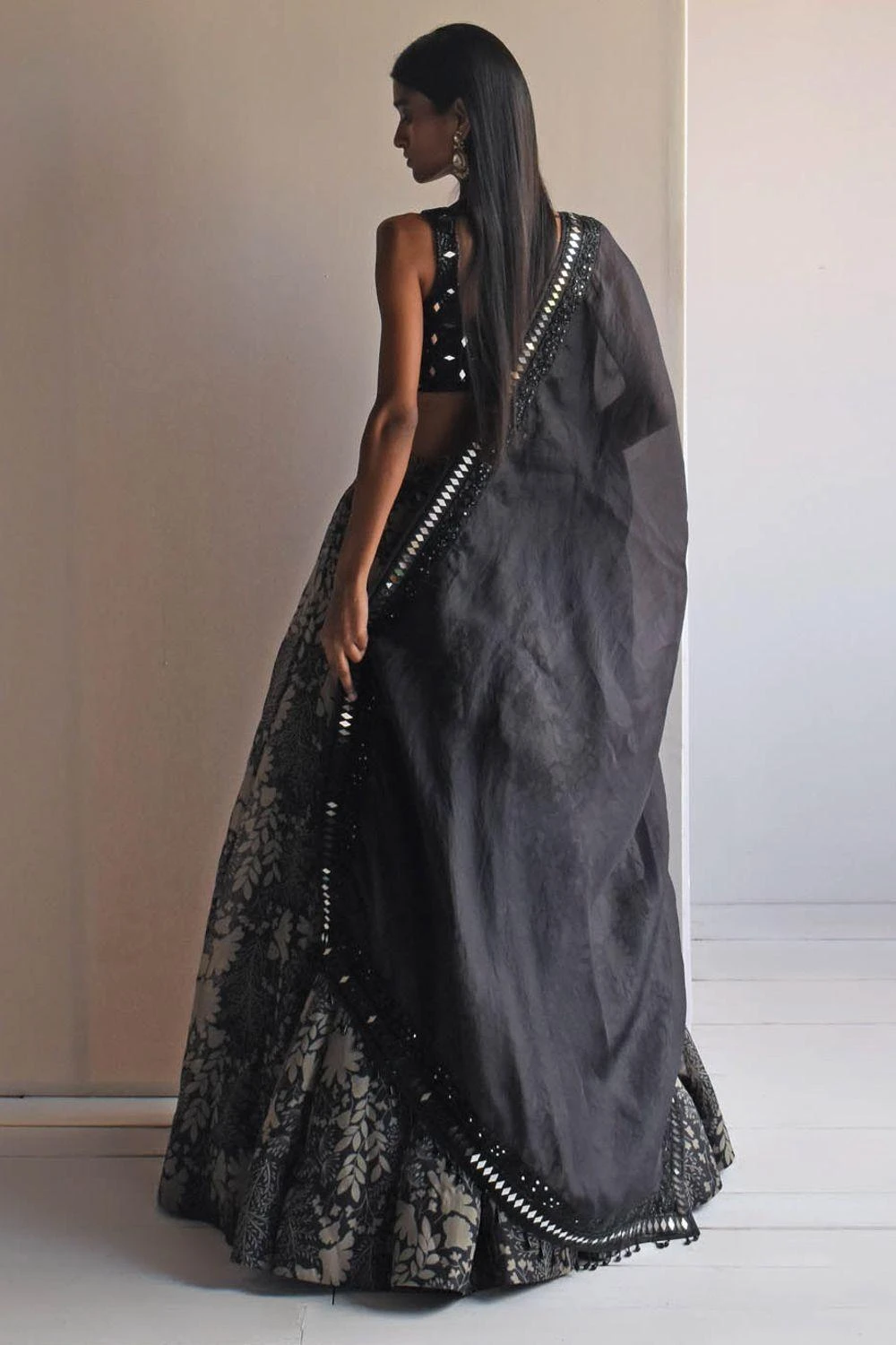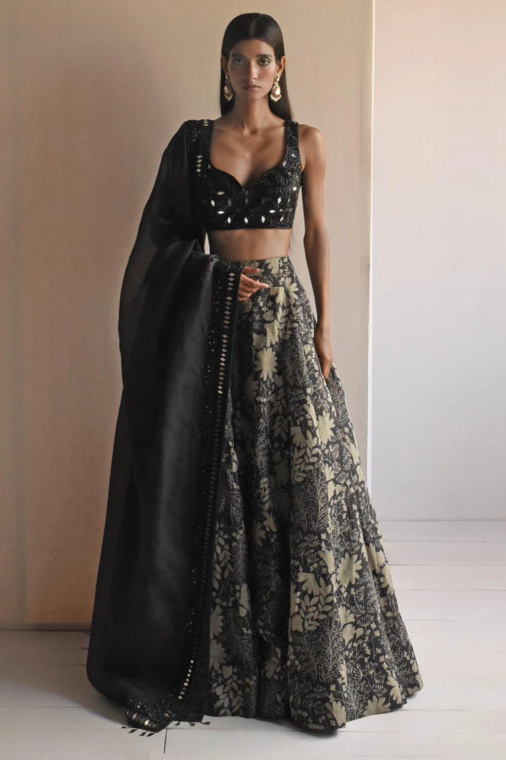 Indulge in the enchanting beauty of this black garden printed lehenga. Paired with a meticulously hand-embroidered blouse & dupatta, this ensemble is a masterpiece of elegance.