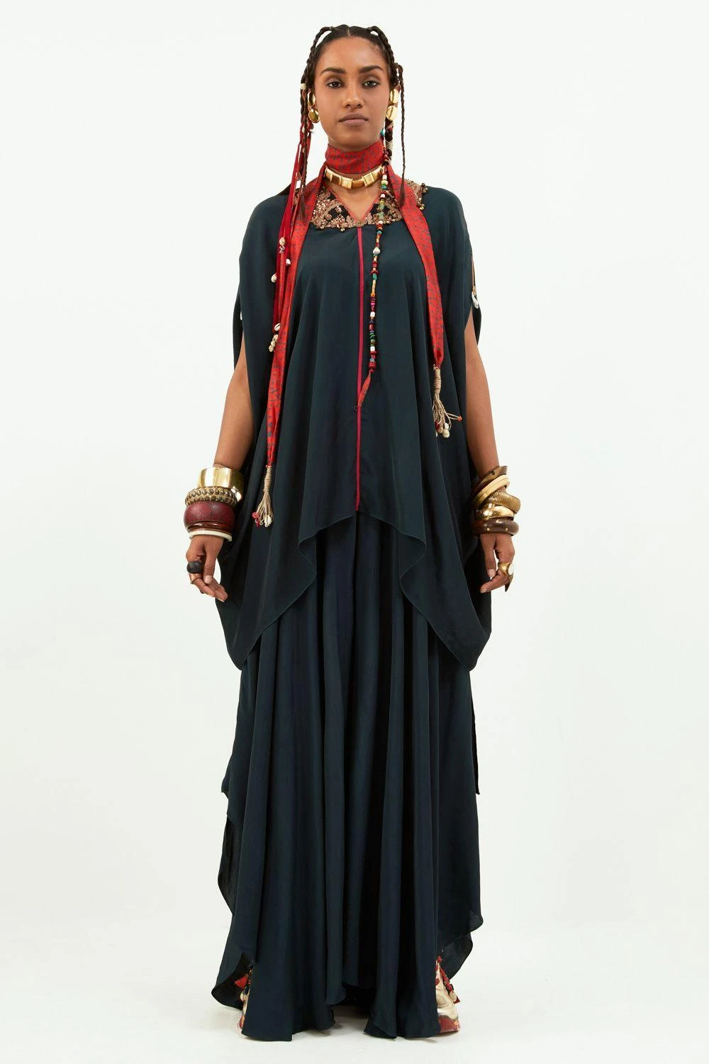 Indulge in the timeless elegance of this tunic, featuring exquisite embroidered detailing. Paired with flared trousers, this ensemble exudes sophistication. The intricate beadwork and meticulous embroidery elevate this ensemble.