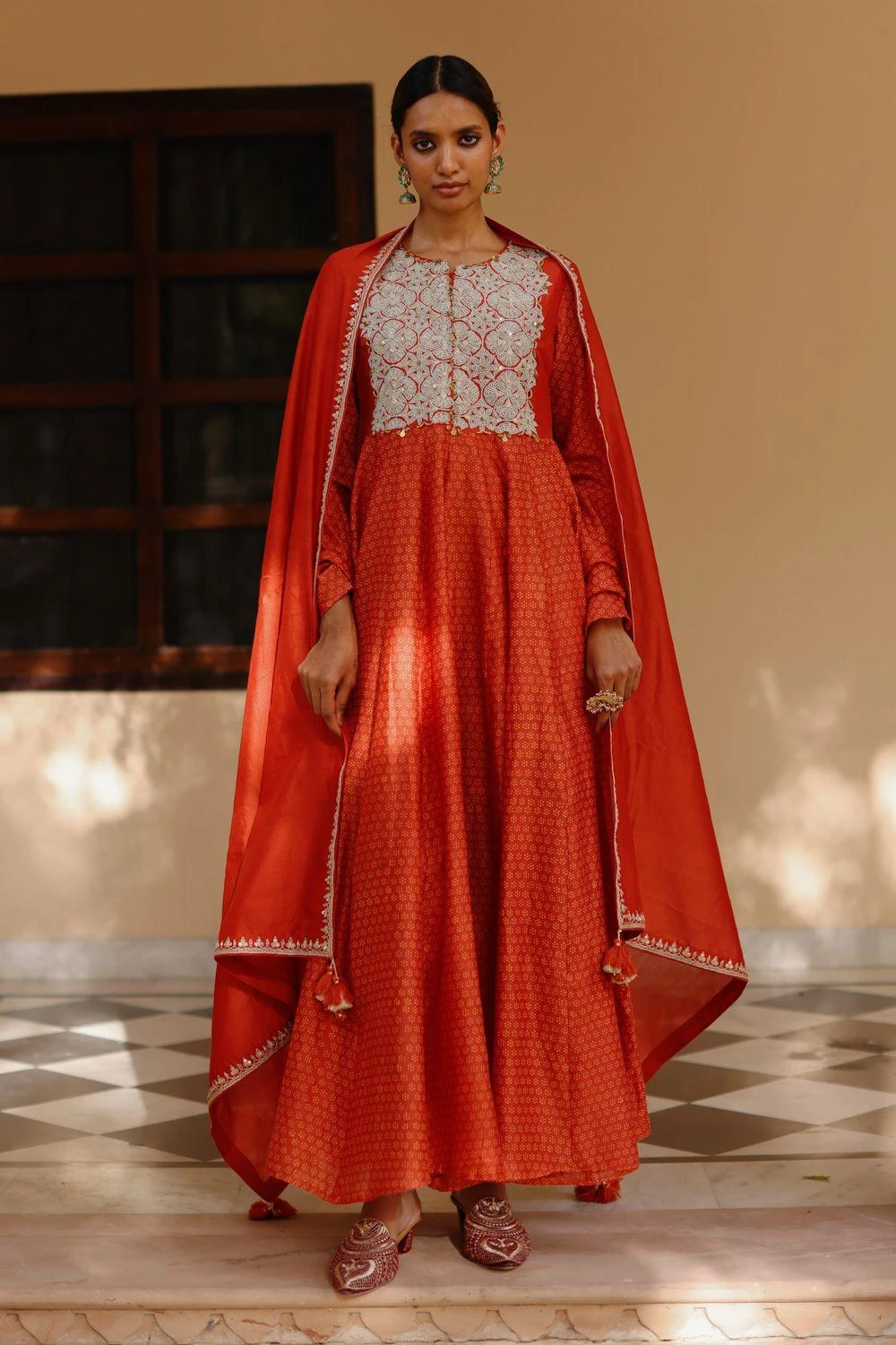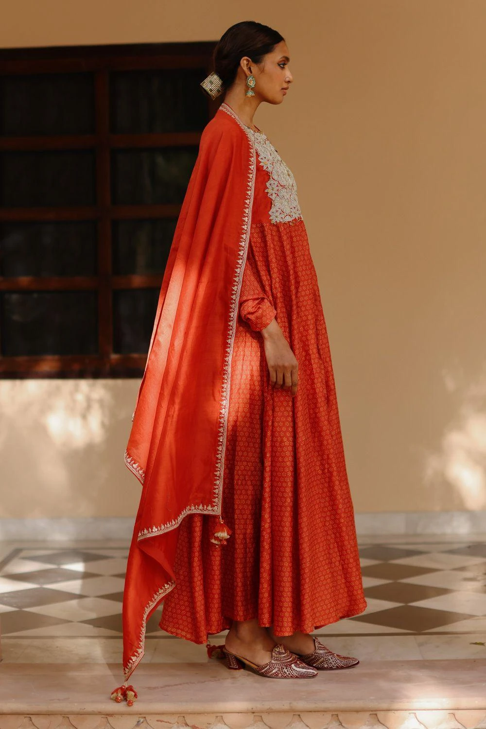 Elevate your style with this handblock printed Anarkali. Its exquisite marodi work yoke adds a touch of sophistication. Complete with a churidar and a matching dupatta featuring intricate work borders, this ensemble is the epitome of elegance.