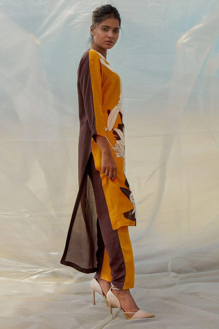 This tunic set falls in the realm of luxe minimalism. Crafted in chanderi and muslin, this set features a statement printed, V-neck tunic paired with a coordinating pants. Add a pair of dangler earrings to complete the look.