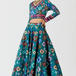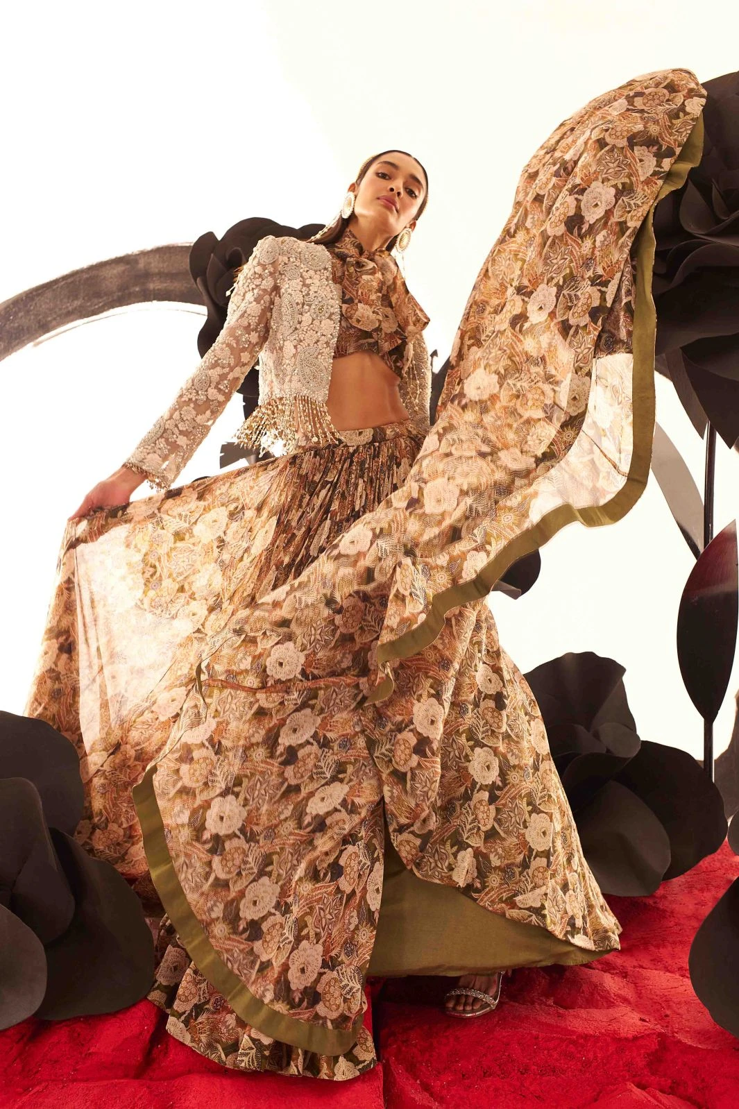 Elevate your style with this abstract floral print bow blouse, harmoniously paired with a matching skirt and crowned with a paisley embroidered tasselled jacket.