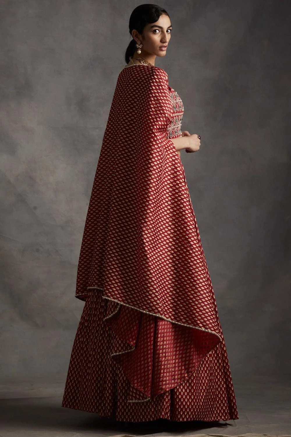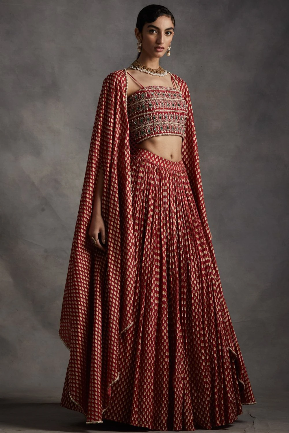 Ace your bridesmaid look in this stunning red lehenga set. It features an organza bindu printed pleated lehenga and an ornate strappy blouse, layered with a matching cape. Style this look with a chic choker & earrings.