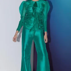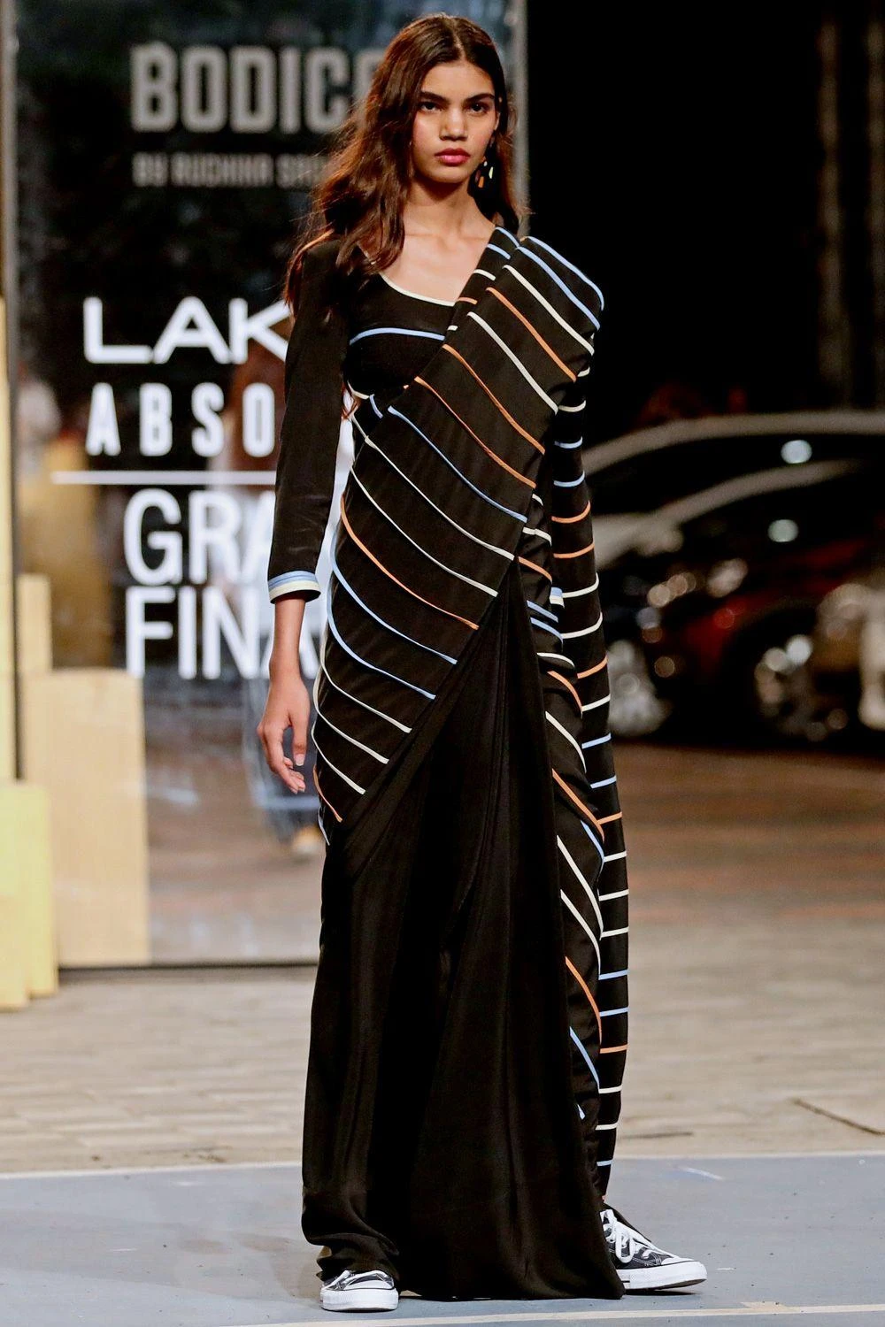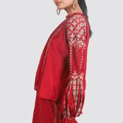 This black silk cropped top will perfectly complement the binded sari from Bodice. It features contrasting coloured stripe details on the sleeves & front. You can style this versatile piece with a pair of pants & skirt as well.