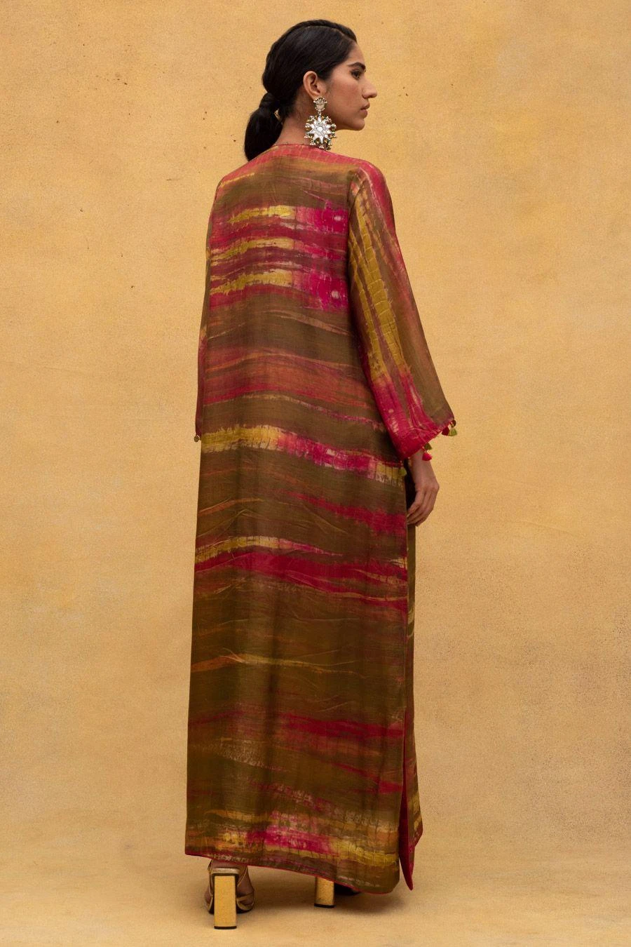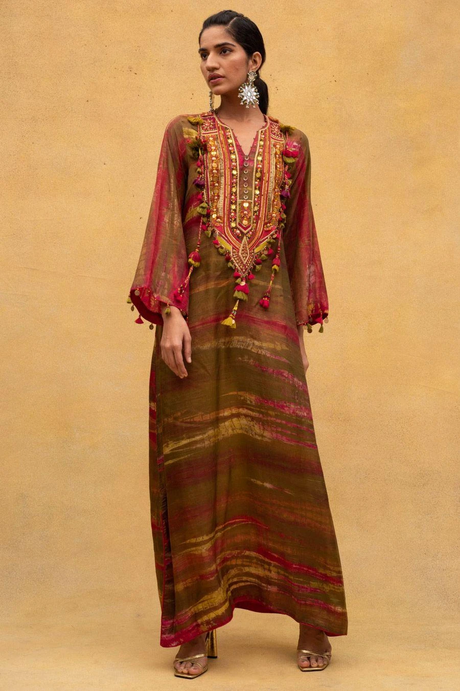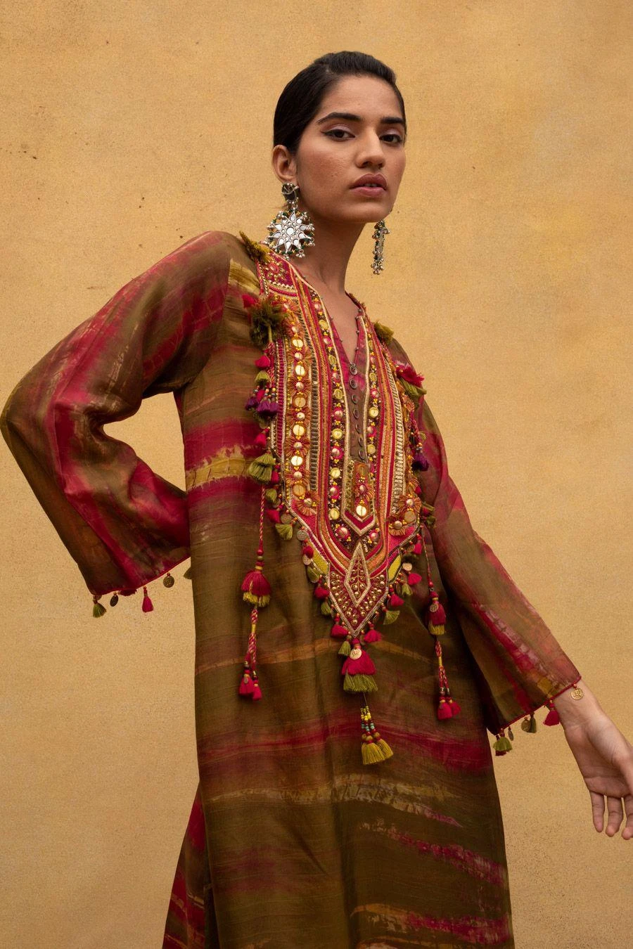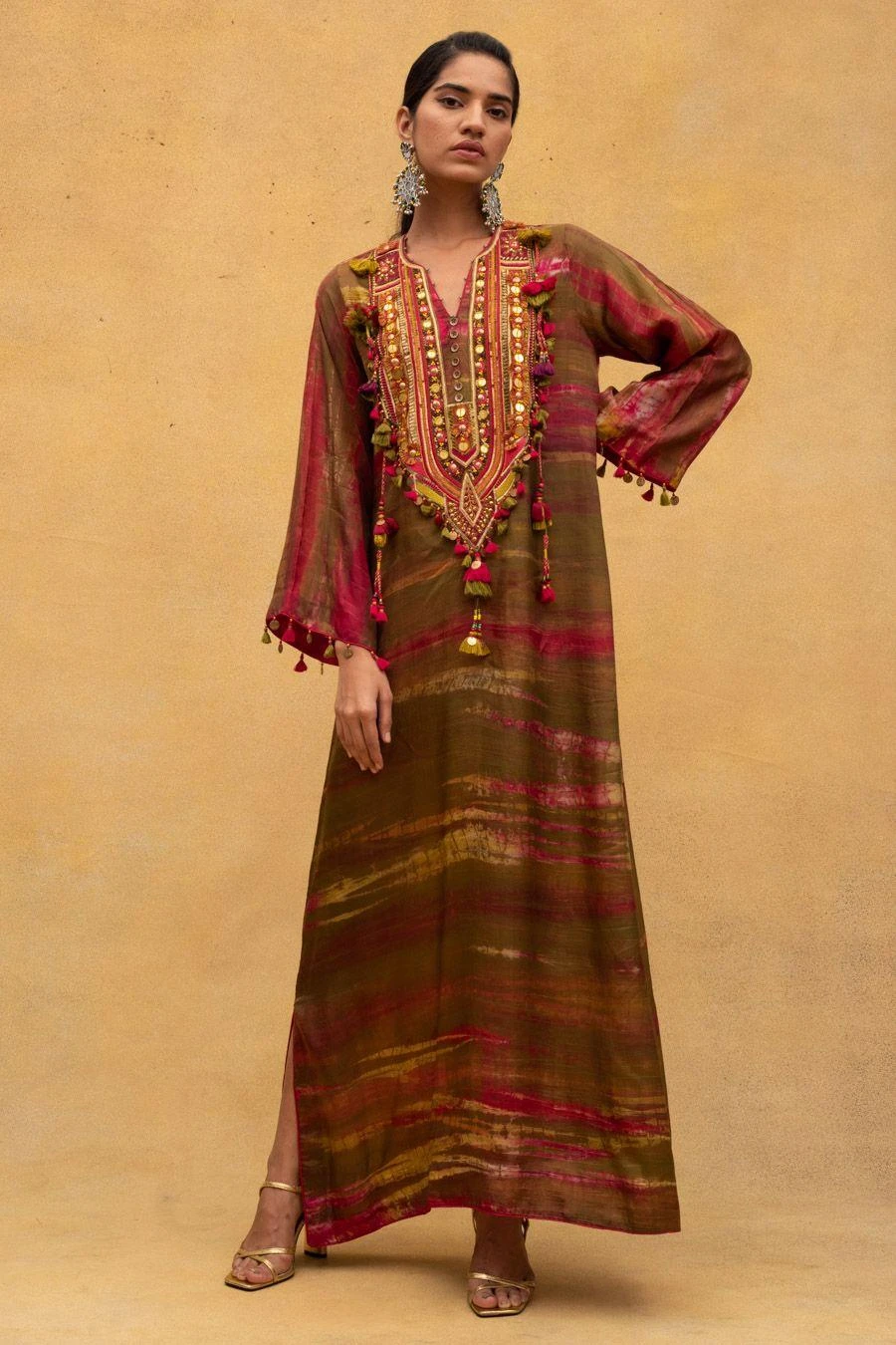 Add a layer of statement and glamour to your resort getaways with this multicoloured dress. Cut in cotton silk, this dress features an embellished yoke and tassels. Style this dress with dainty jewellery to complete the look.