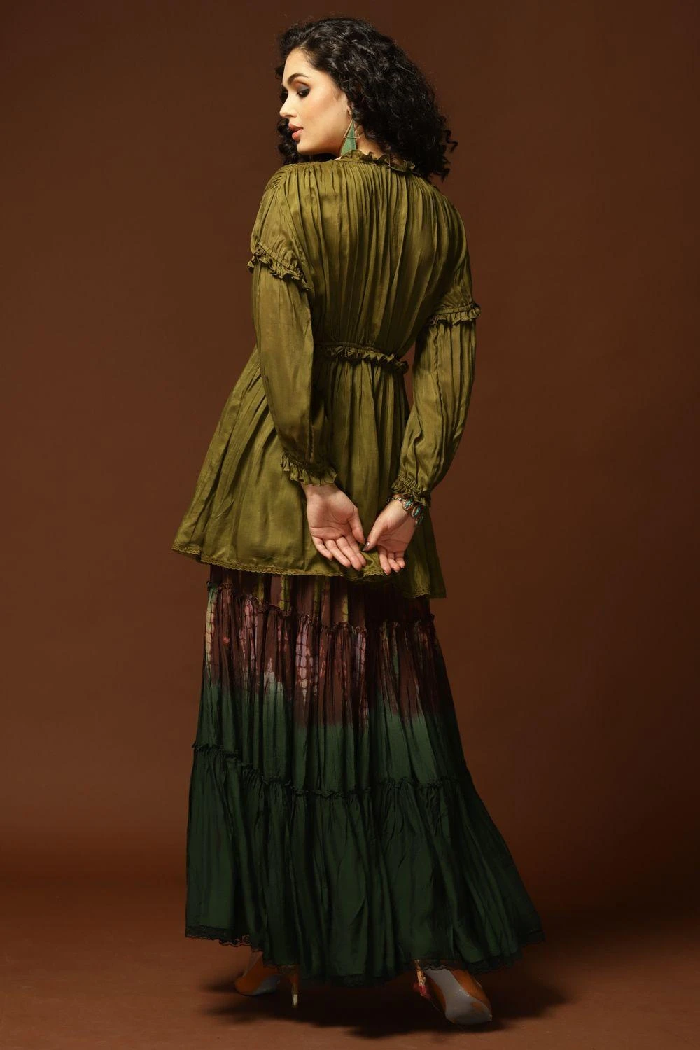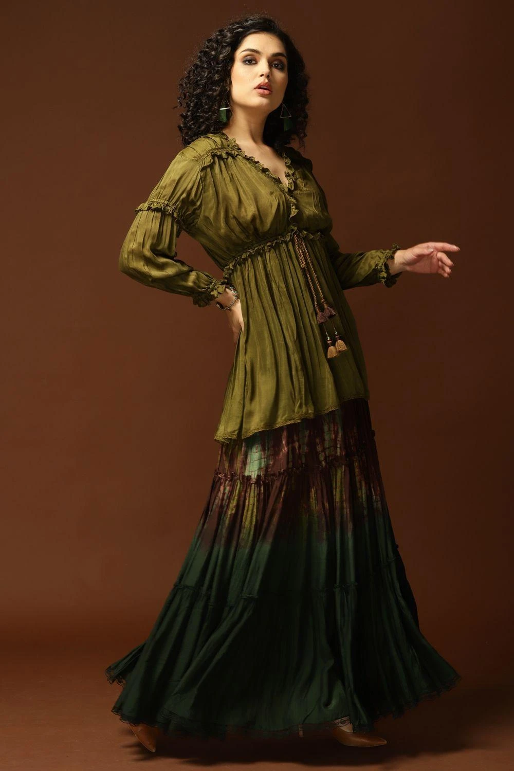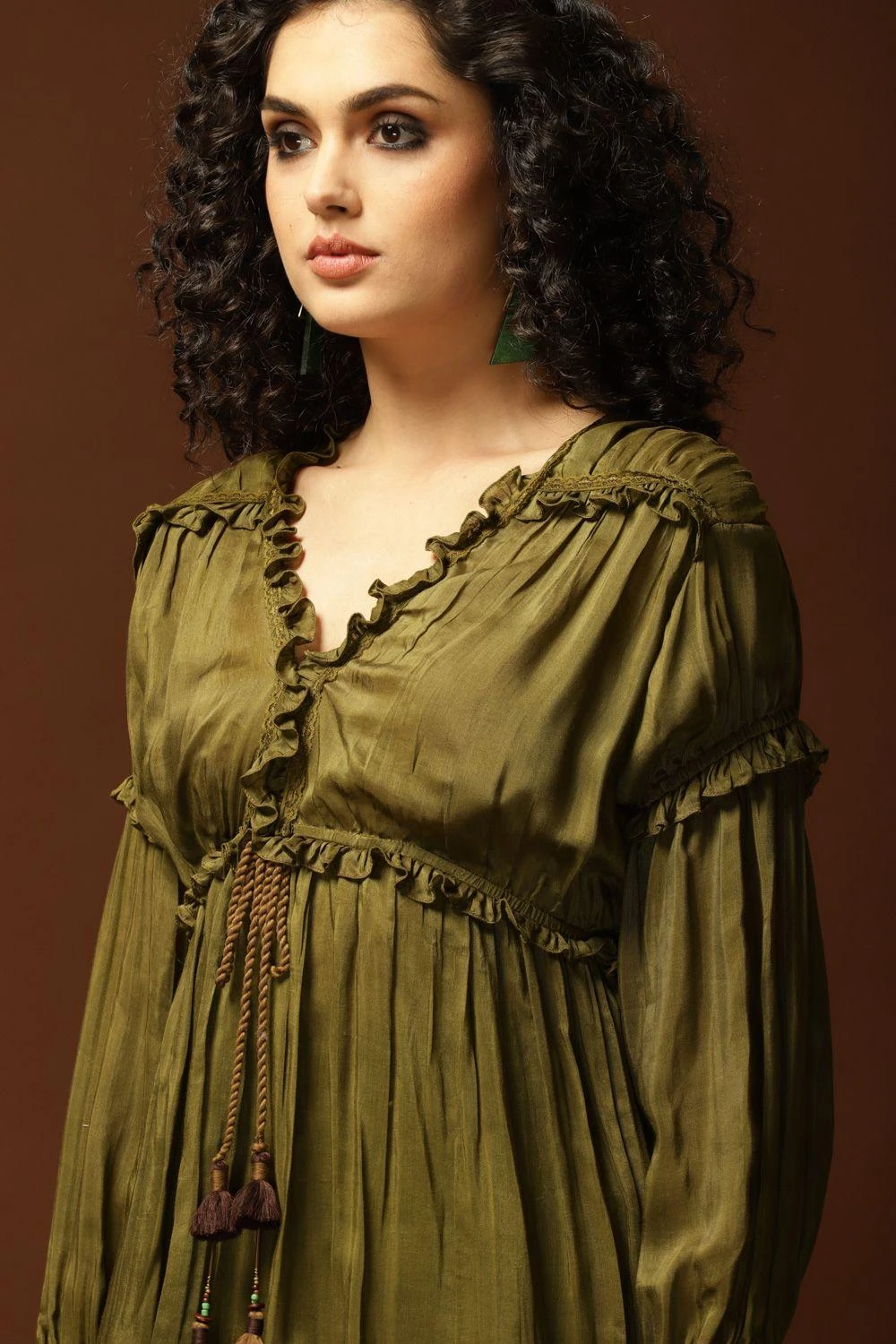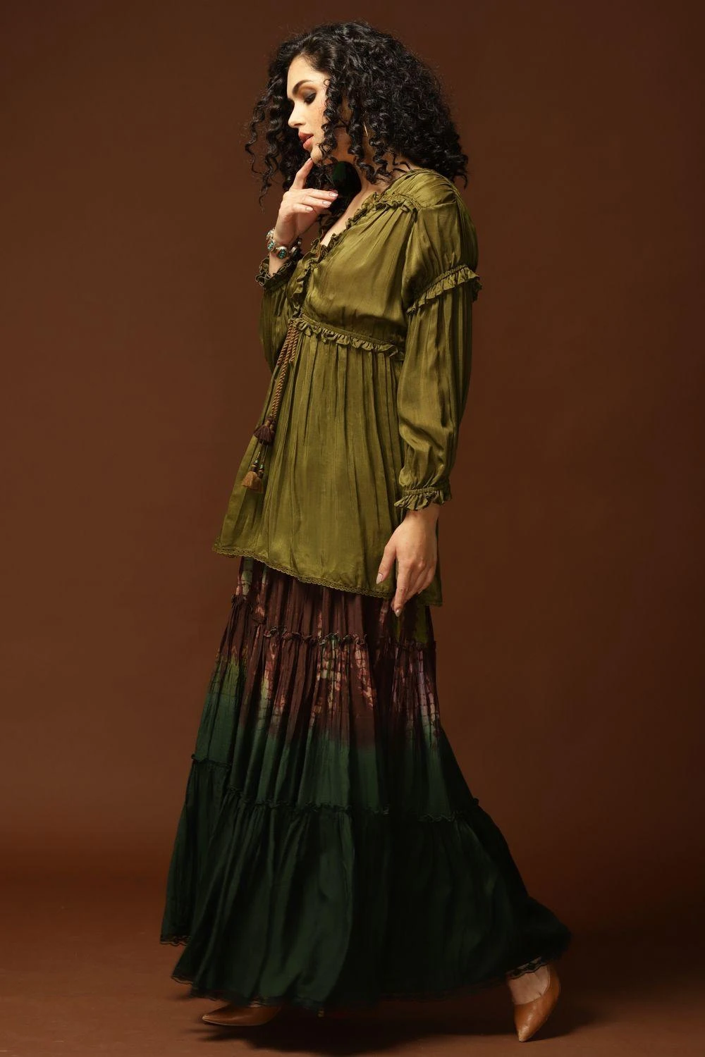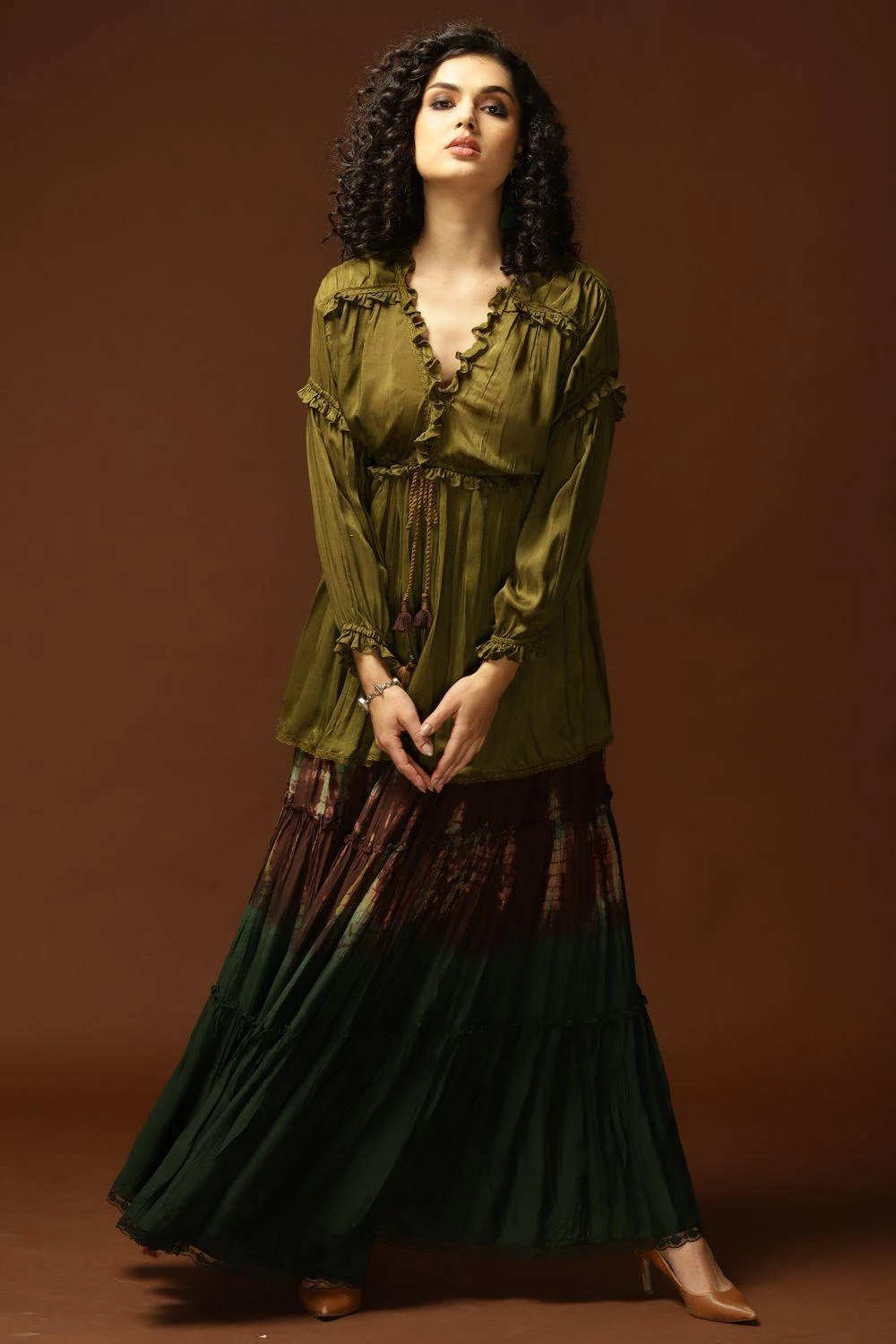 This chic V neck top is cinched at the waist & flares down. It is cut in cotton silk and features gentle ruffle details. Style this piece with flared pants or a skirt for a dressy festive look.
