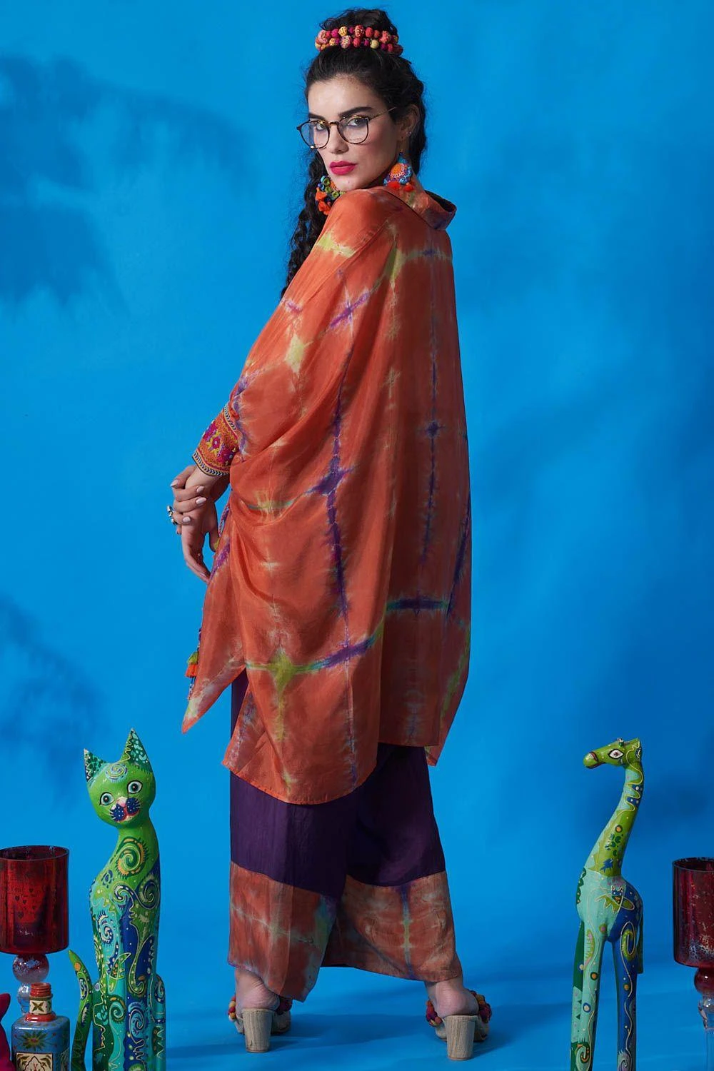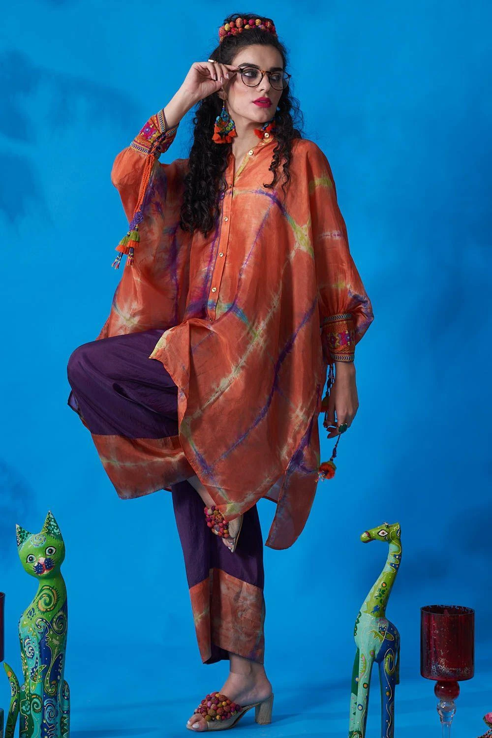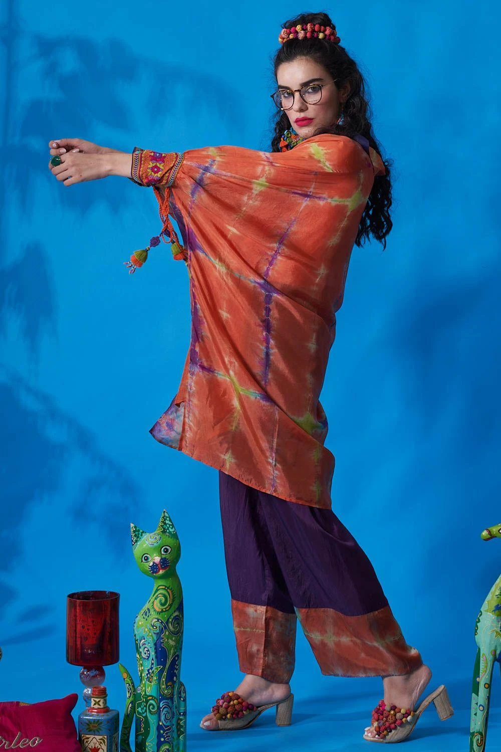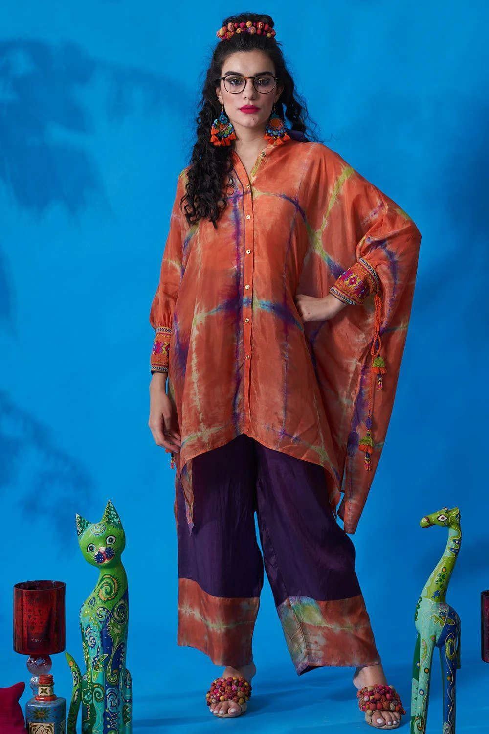 From lounging at home to catching flights, you can always count on this co-ord set. Cut in habutai silk, this set features a shirt collar tie-dye kaftan top with embroidered cuffs & dori string paired with solid straight pants.