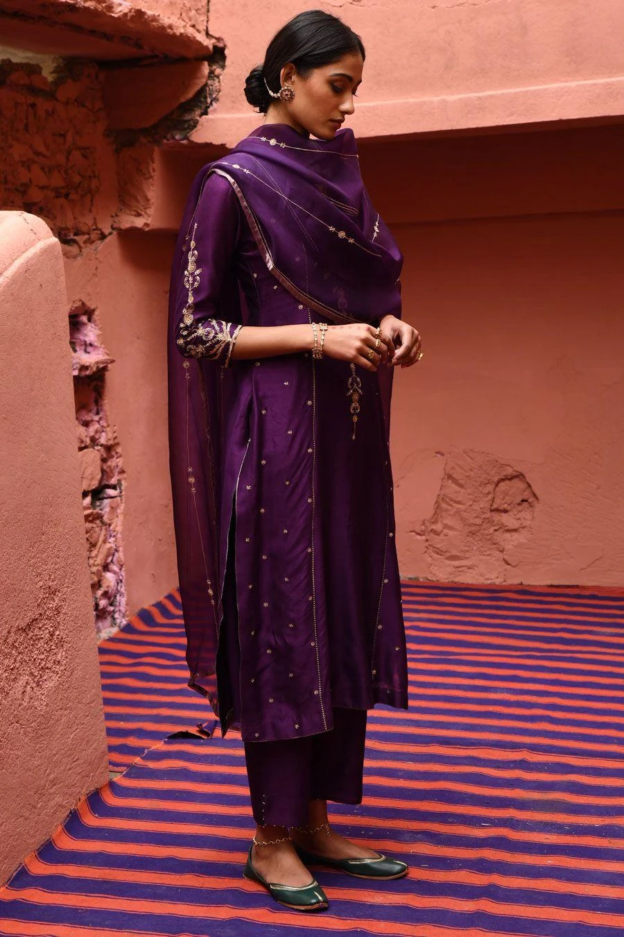 The perfect amalgamation of style & comfort, this set is perfect for a day out. Crafted in chanderi, this set features a boota embroidered kurta paired with straight pants & an embellished dupatta.