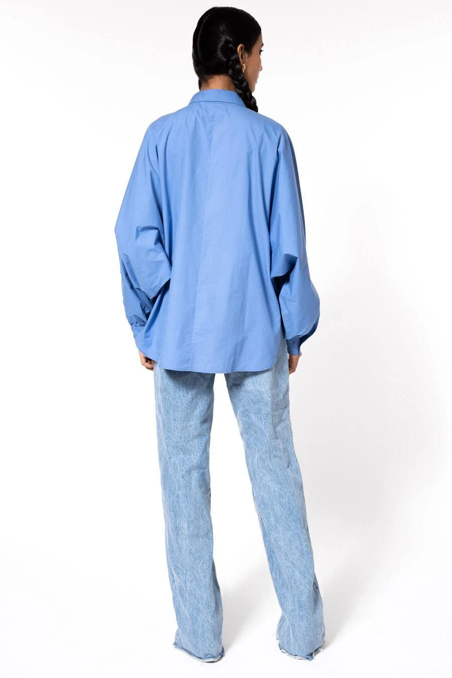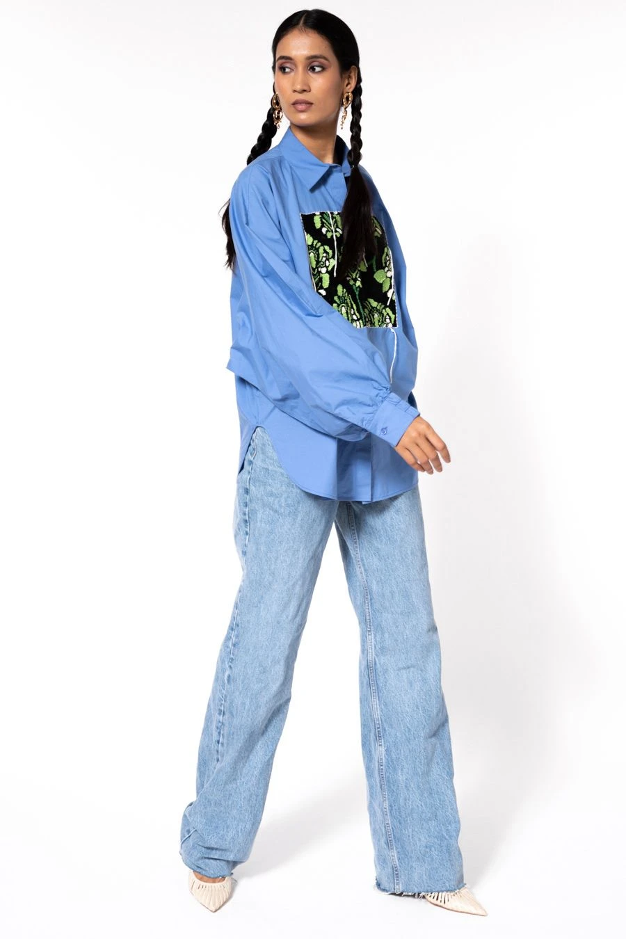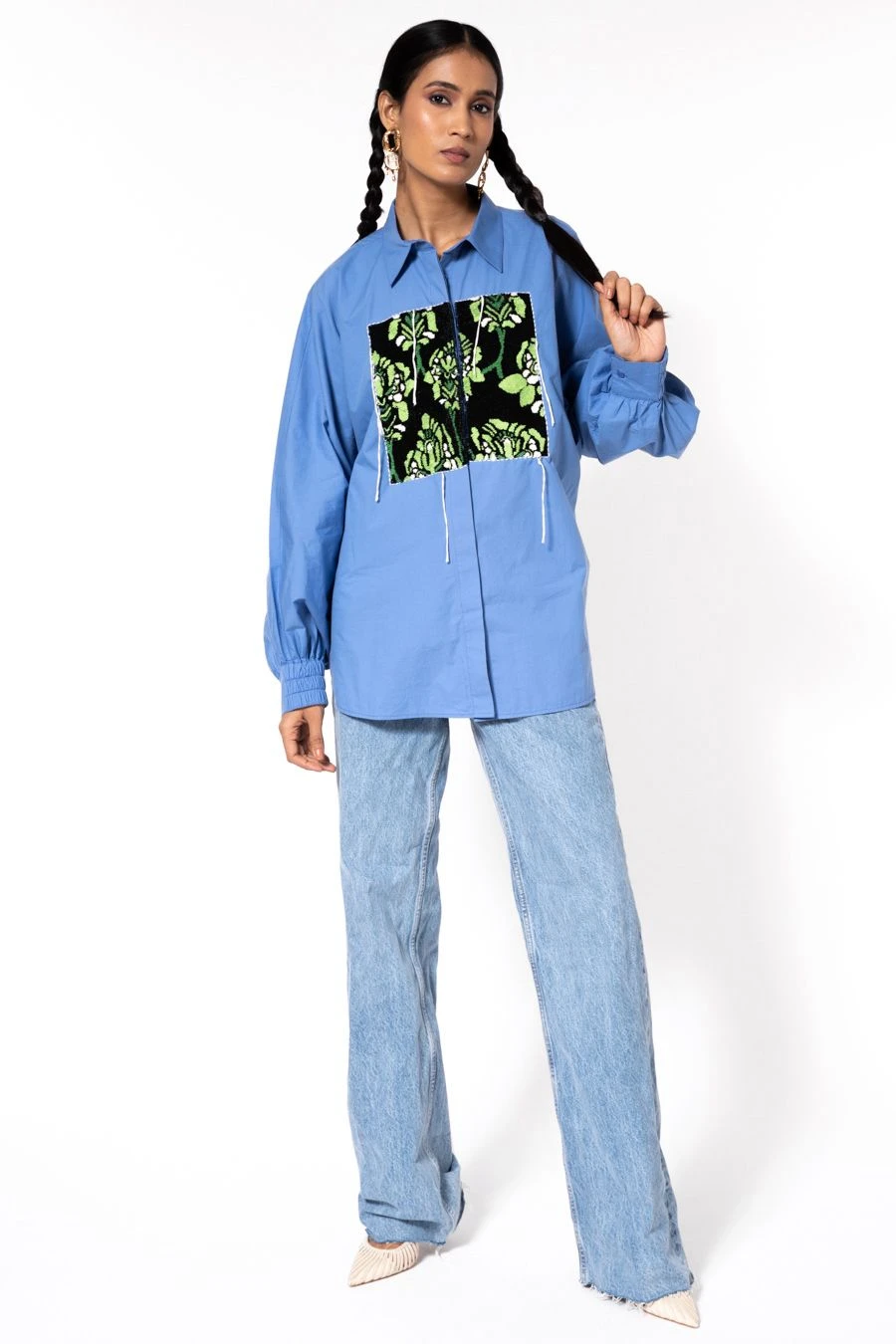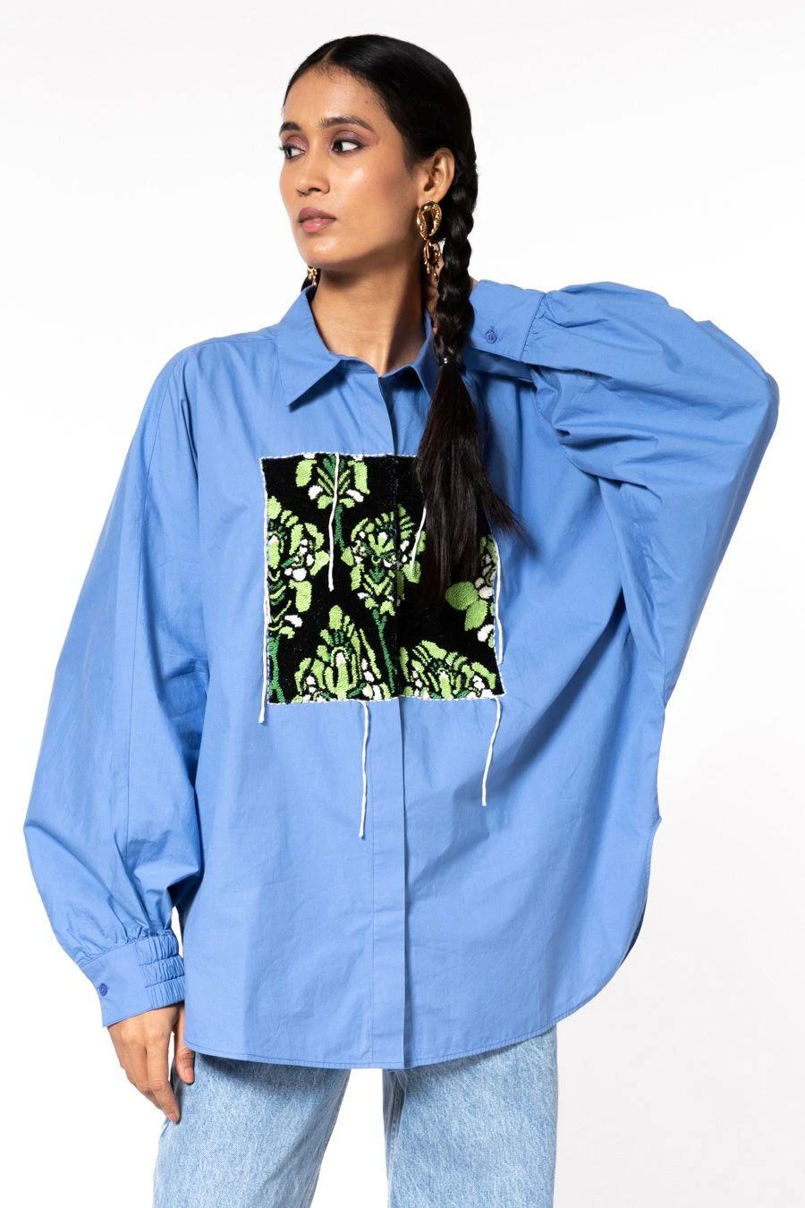 This stylish hand embroidered batwing sleeve shirt is set in a cotton fabric. It has a patchwork floral embroidered detail and elasticated cuffs.