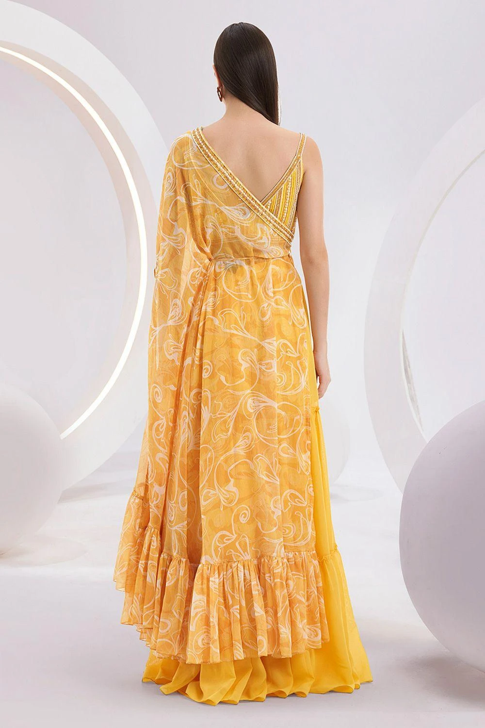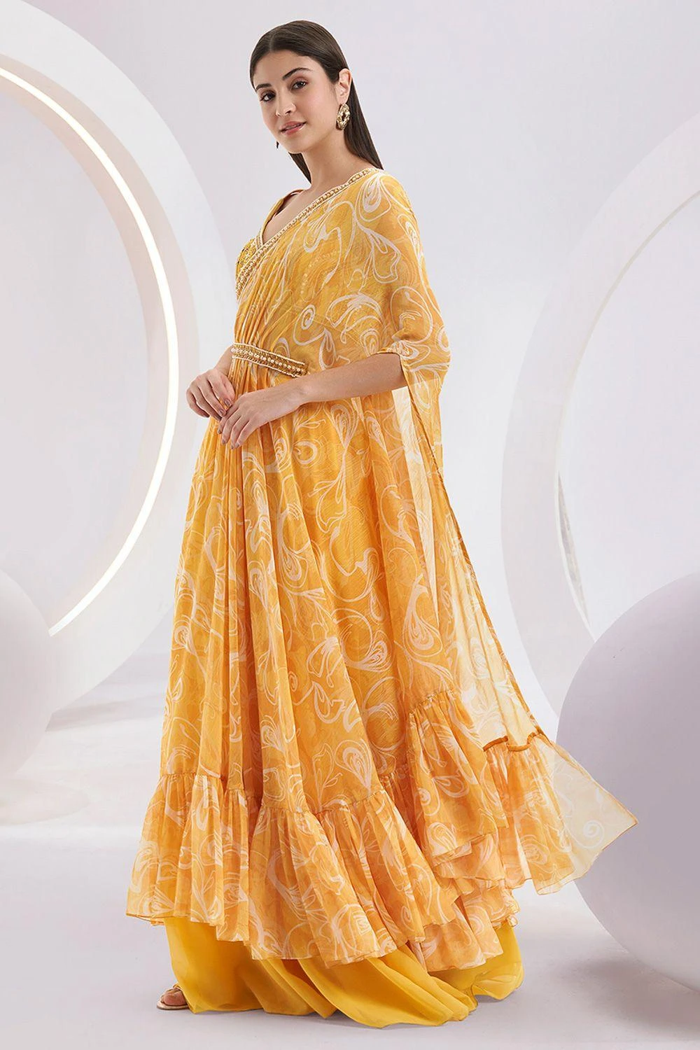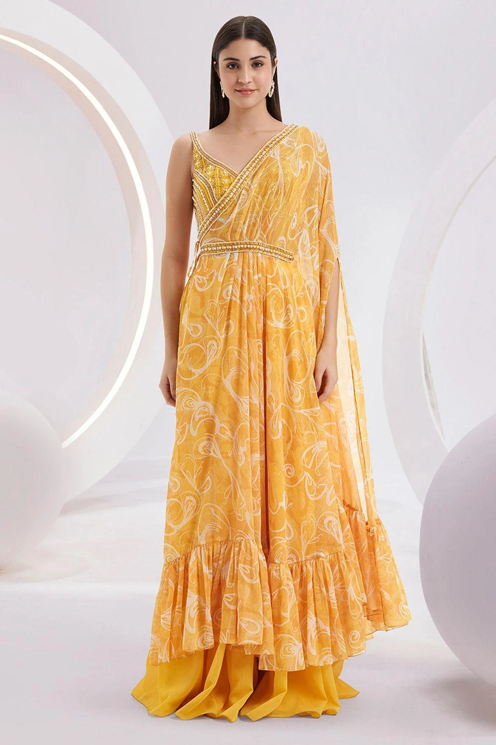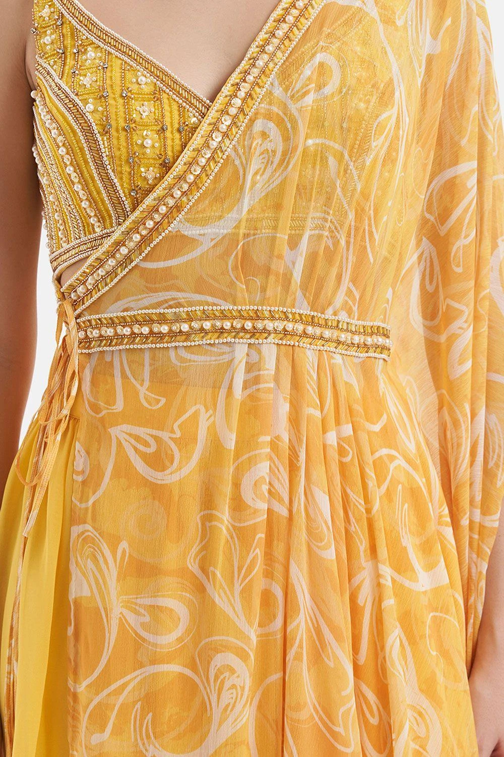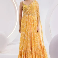 Experience fluid couture in the Moana Cape Setùa pinnacle of craftsmanship. A printed one-shoulder cape, hand-embellished blouse & solid tiered skirt unite in exquisite fashion, redefining elegance & sophistication.
