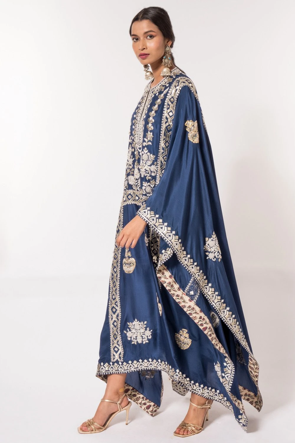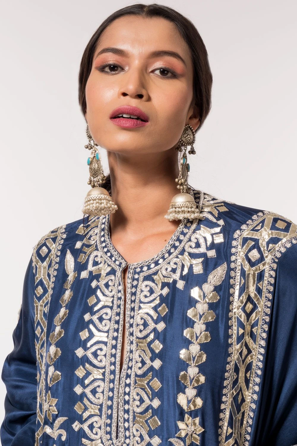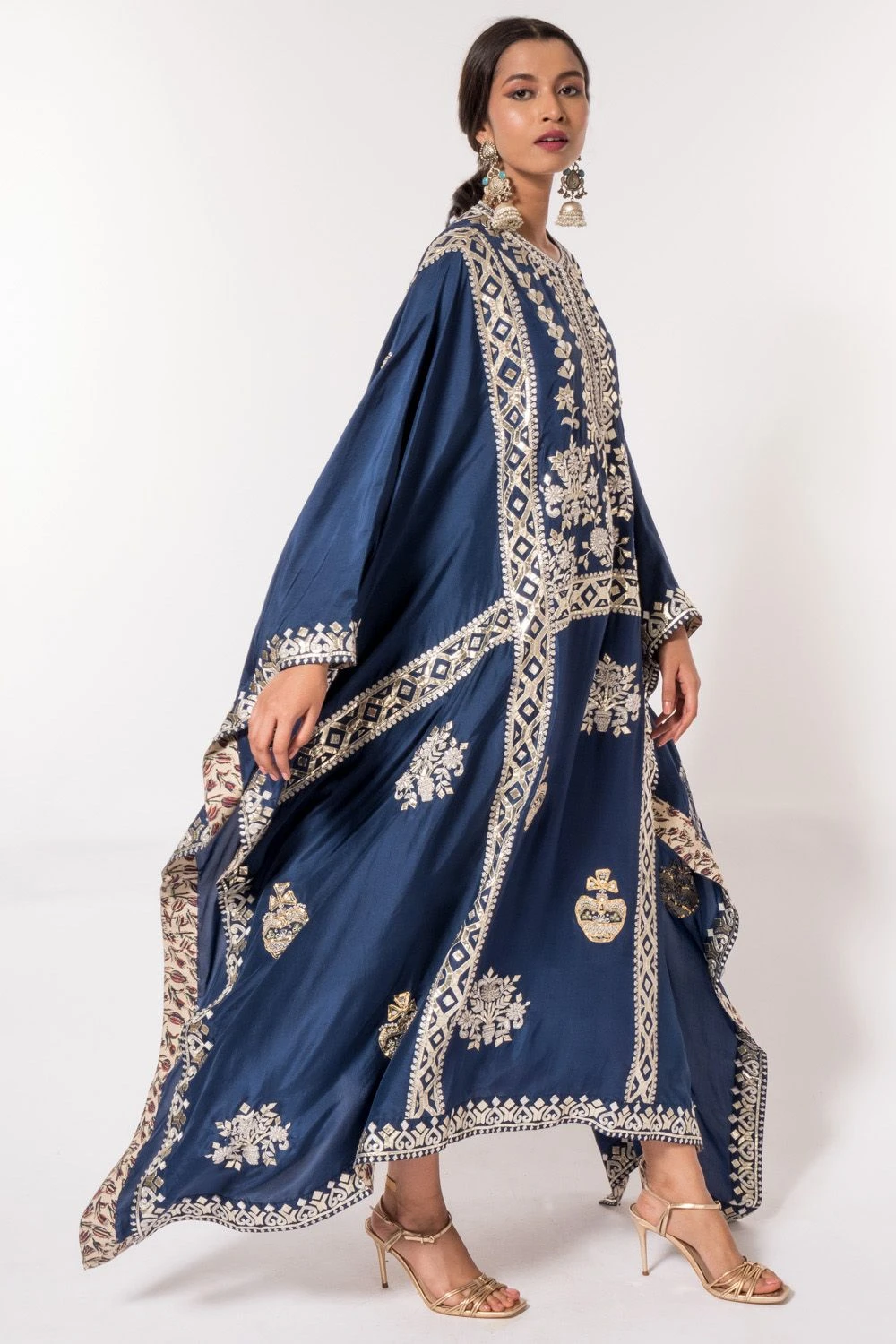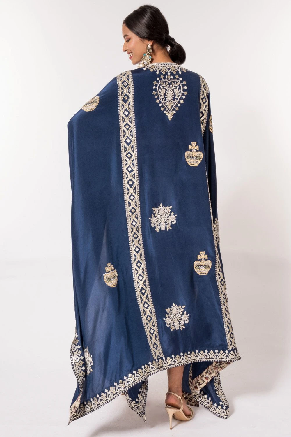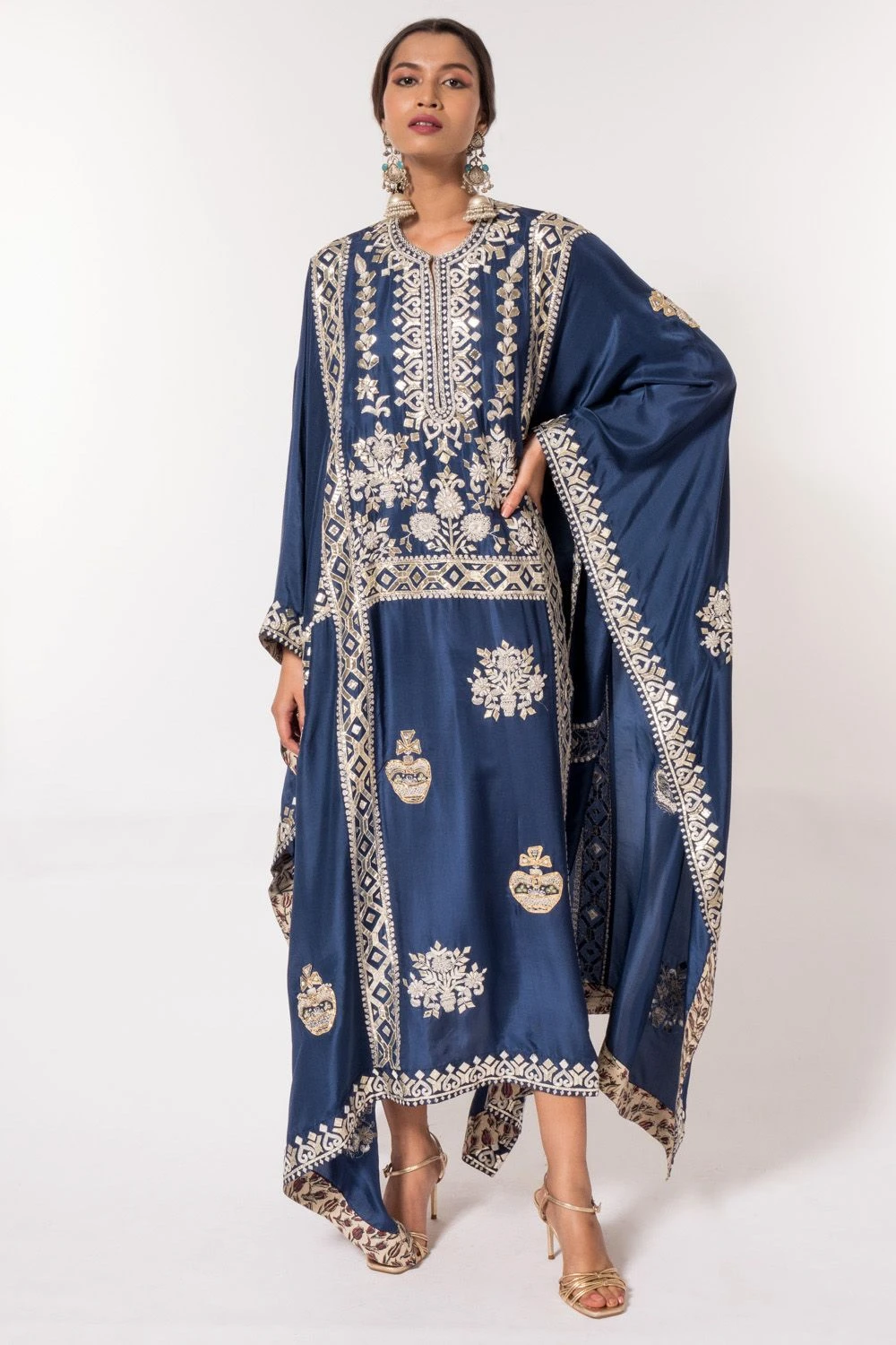 Bringing tradition into the spotlight with this ravishing indigo kaftan. It is cut in sumptuous silk fabric and adorned with exquisite embroidery all over. You can style it with a pair of silver studs and a clutch.