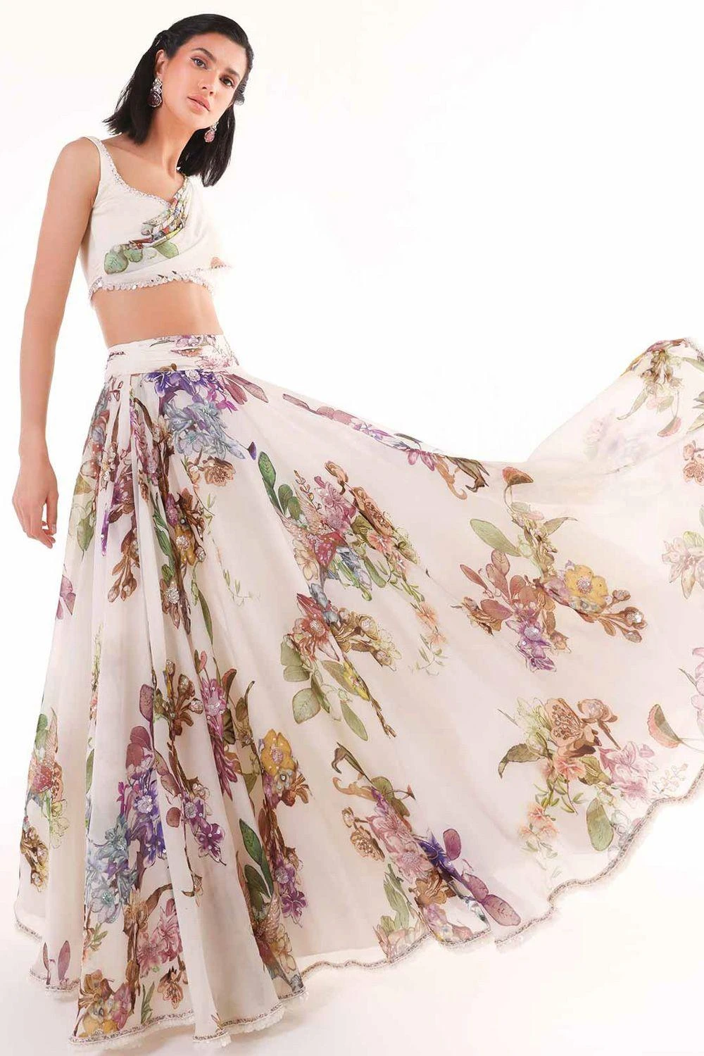 Experience elegance with this Lehenga and Draped Blouse adorned in captivating print embellishments. This ensemble redefines modern glamour, effortlessly blending sophistication and style for a truly captivating look.