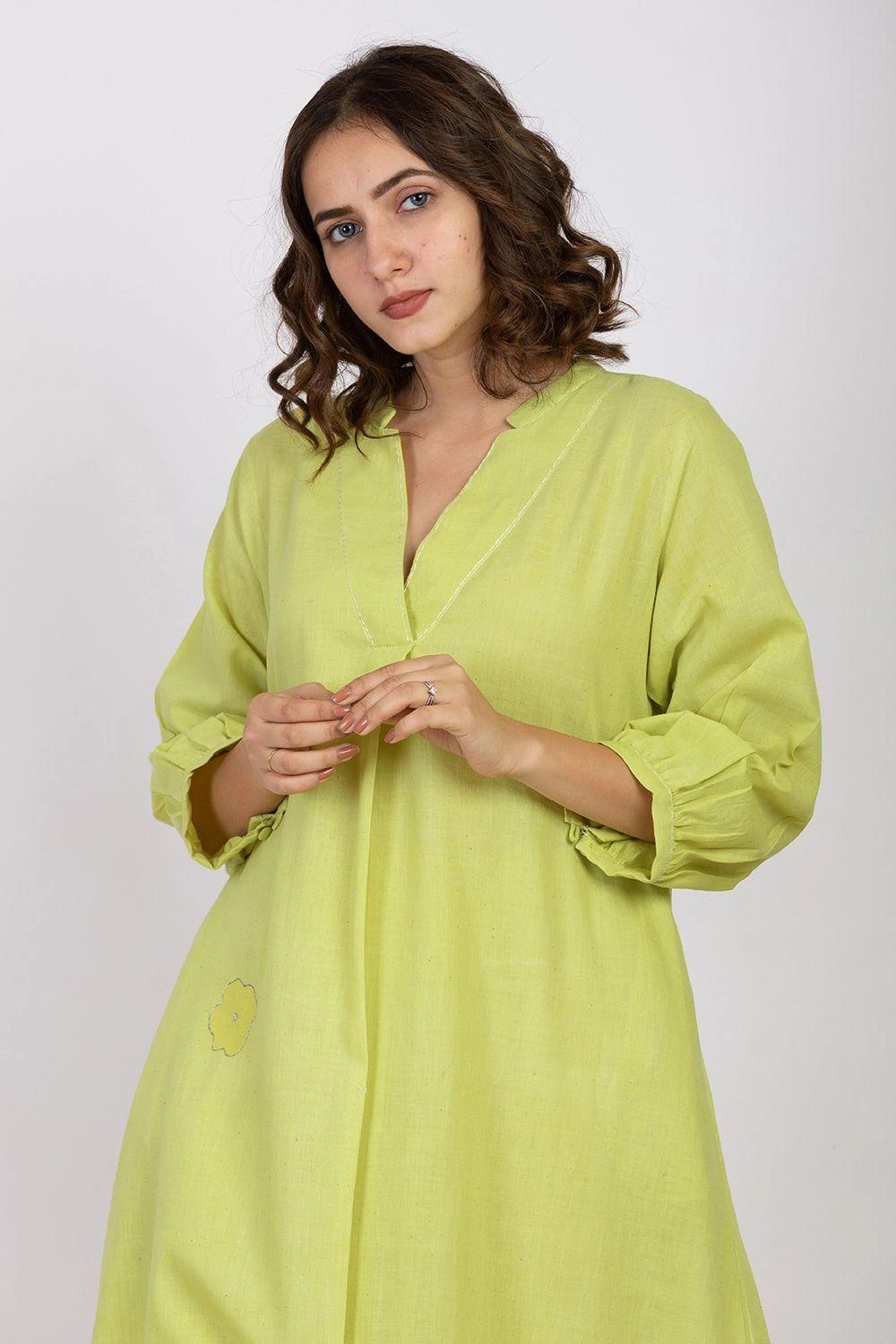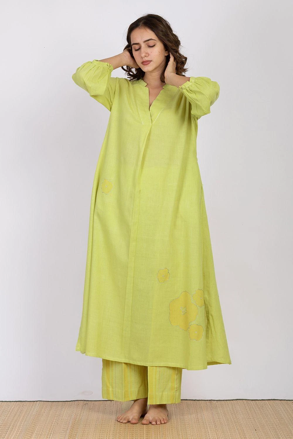 Maximise the life of your wardrobe with this roomy tunic. Crafted in hadwoven cotton crepe, it features floral block prints highlighted with hand embroidery. It comes with pants cut in handwoven cotton.