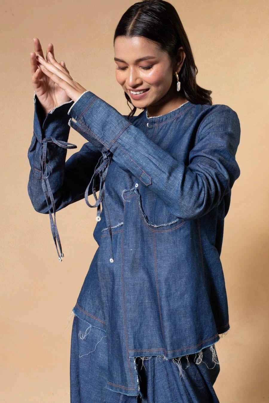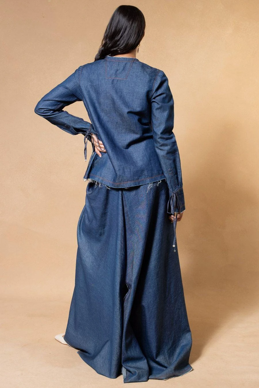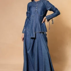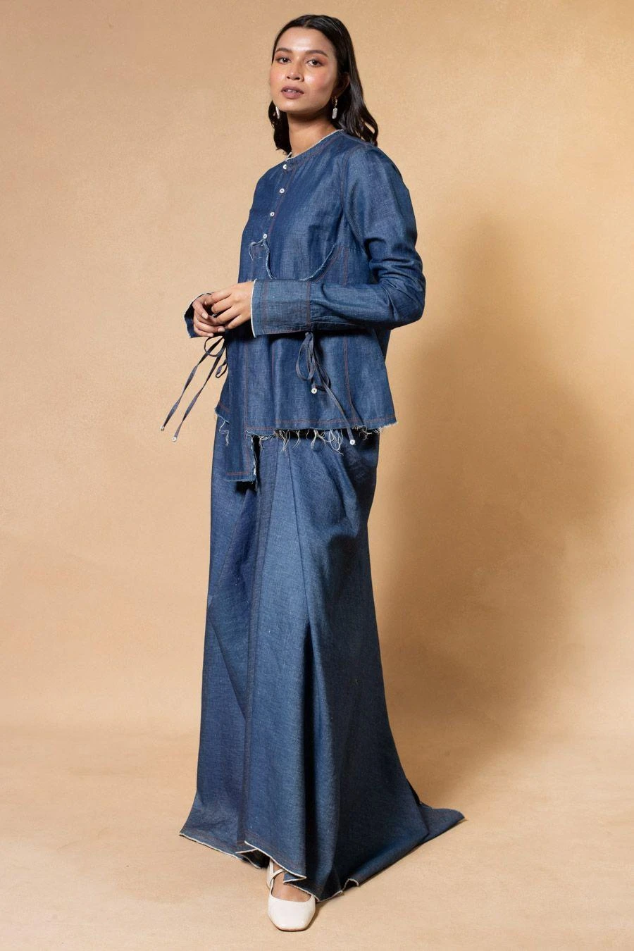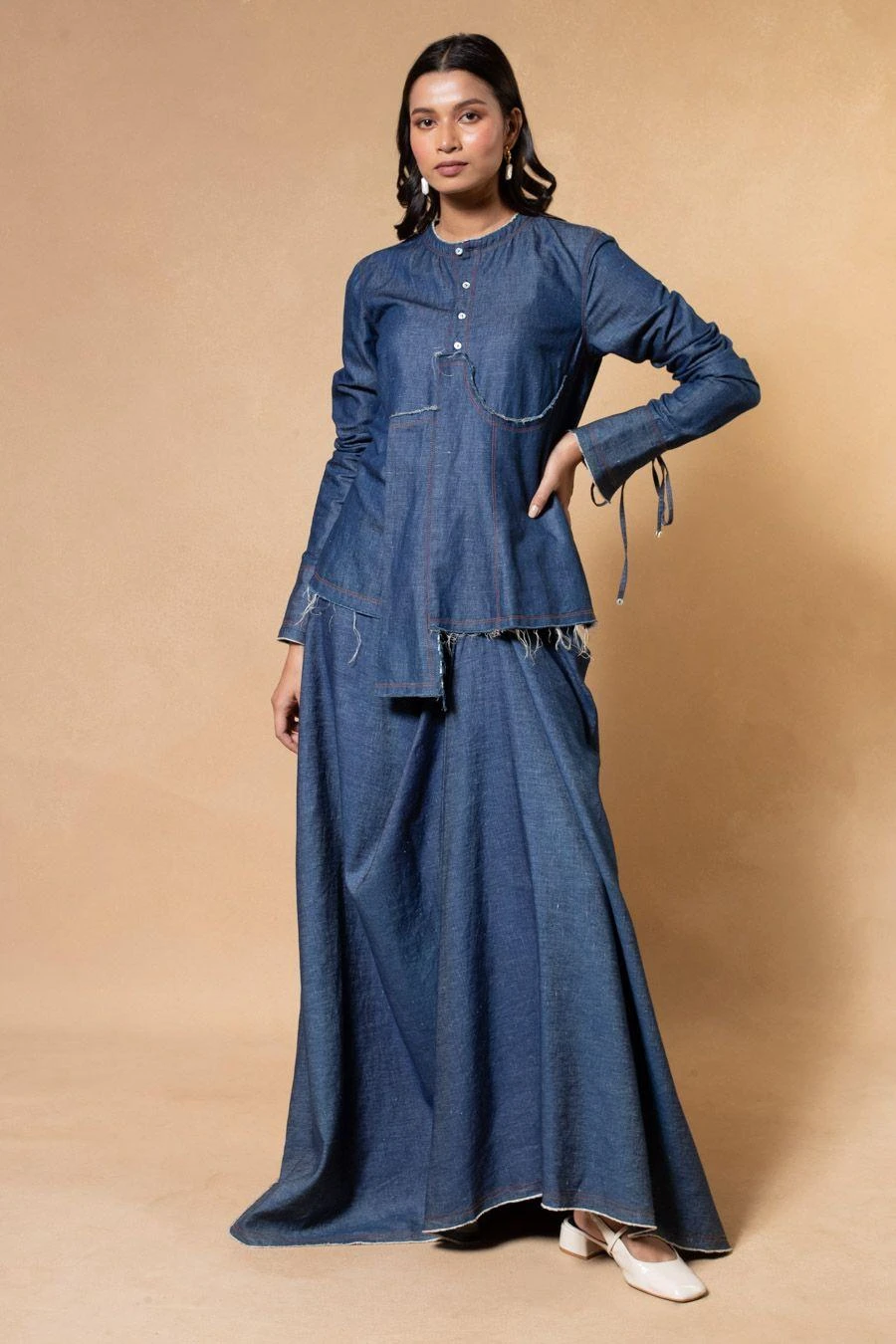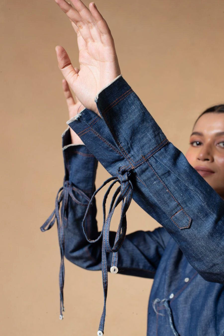 The captivating allure of this denim top, a veritable masterpiece that encapsulates the very essence of casual chic. Boasting a voluminous silhouette that drapes elegantly over the body, this top is an exquisite amalgamation of comfort and style