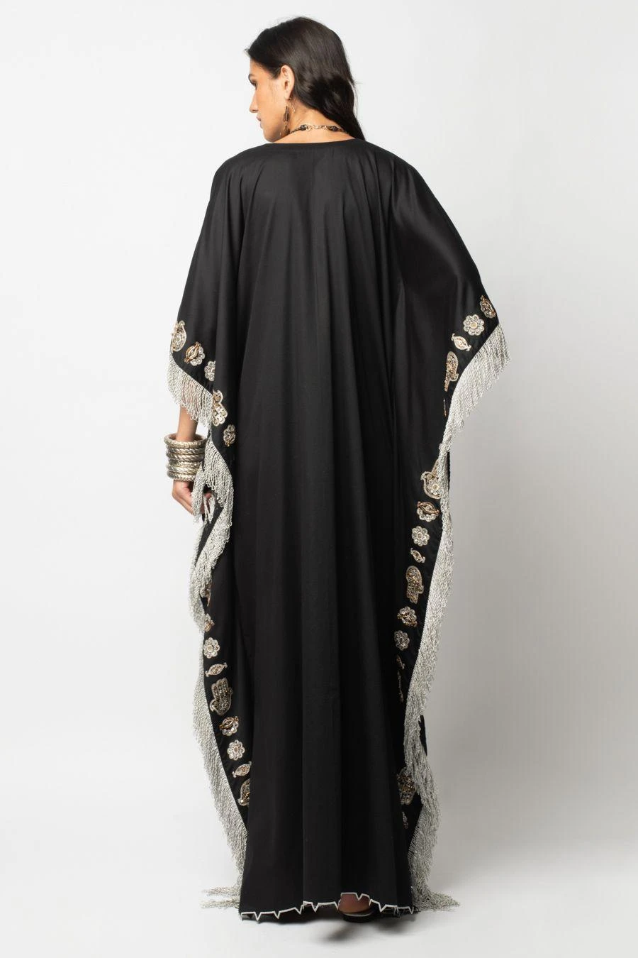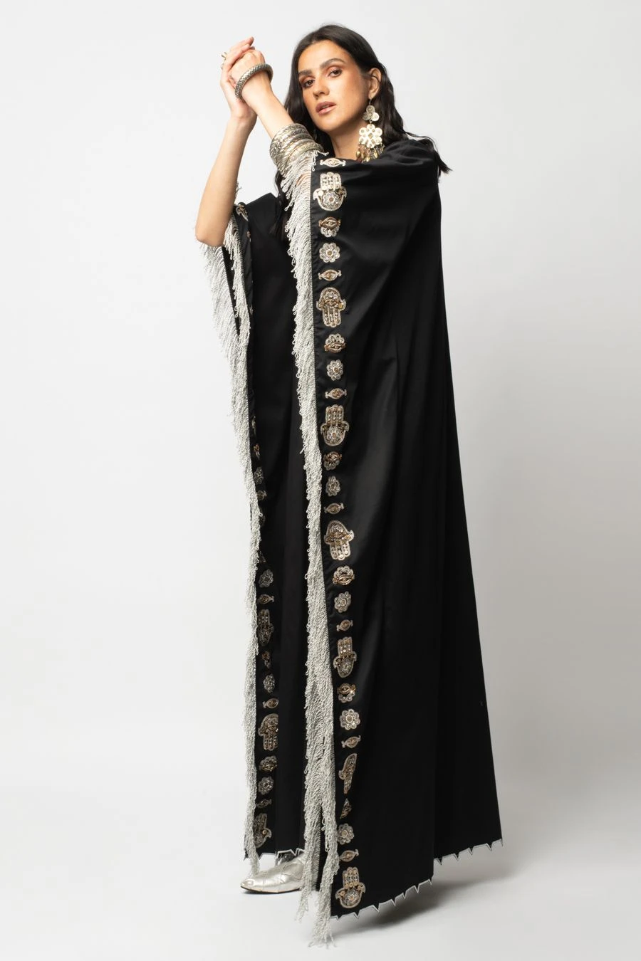 Give your party outfit a fashionable spin with this kaftan. This black kaftan set in cotton satin is adorned with gold fringed lace & hand embroidered golden hamsa motifs in aari & dabka work.