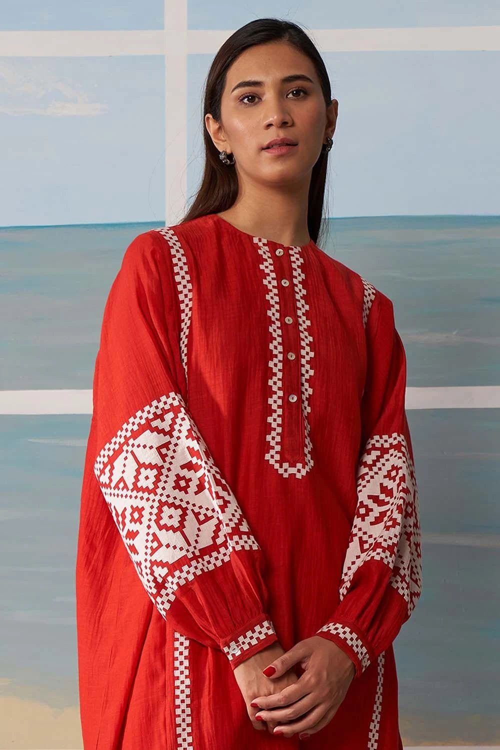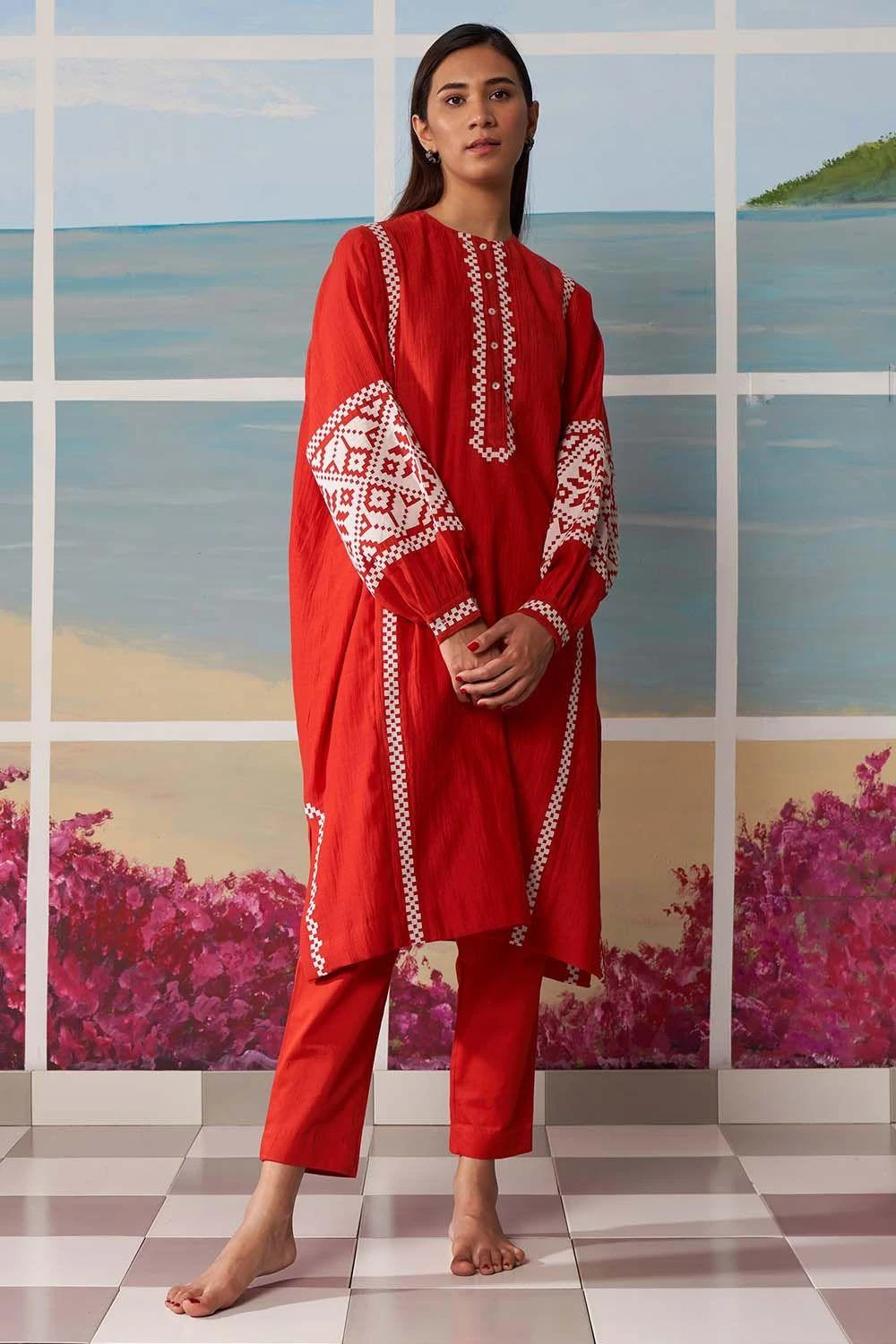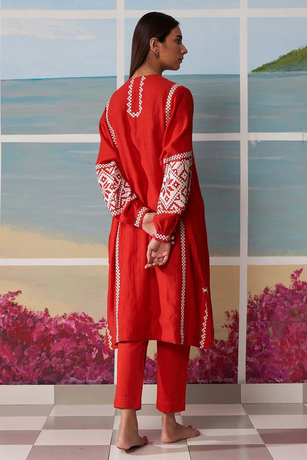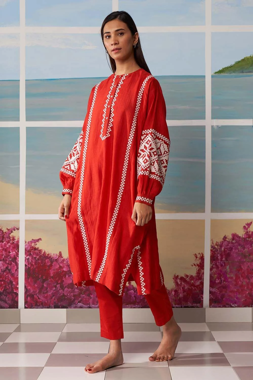 Make an impression in this scarlet red kurta set. Crafted in luscious chanderi fabric, this panelled kurta is enhanced with hand cut applique and and intricate tribal work whereas the pants are kept simple. A striking pick for your occassions.