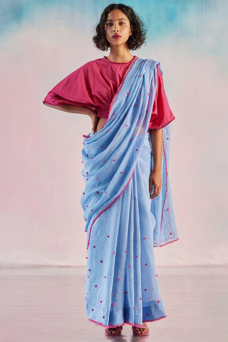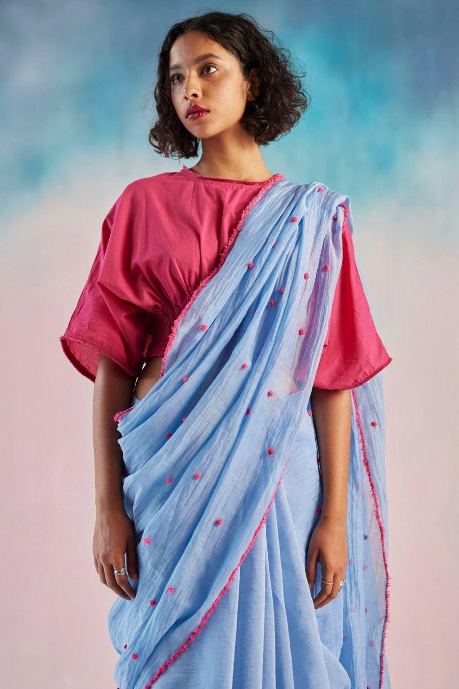 Experience the effortless charm of this fuchsia balloon top, crafted from the finest cotton mul fabric and hemmed using a smocking technique for a comfortable and chic fit. Pair it with the Blue Heather sari to complete the set.