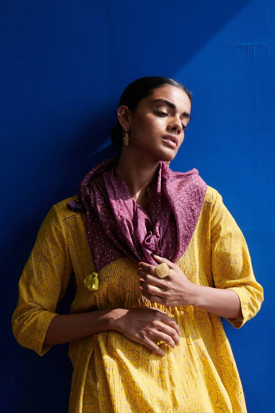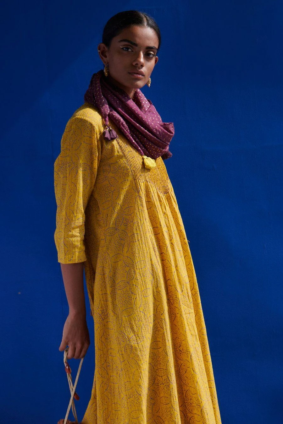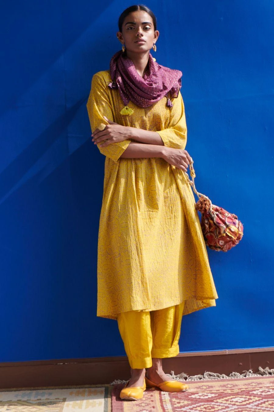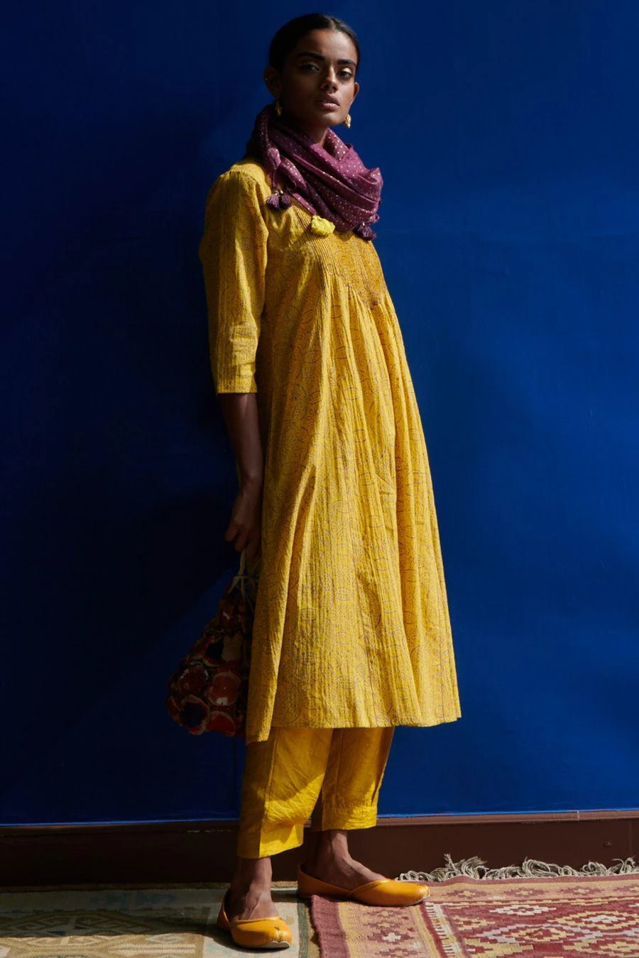 The kurta in fine mulmul features a gold hand block print and fine stitching paired with pleated salwar pants. The band collar and pin-tucked details add to the style quotient and rephrase the modern kurta.