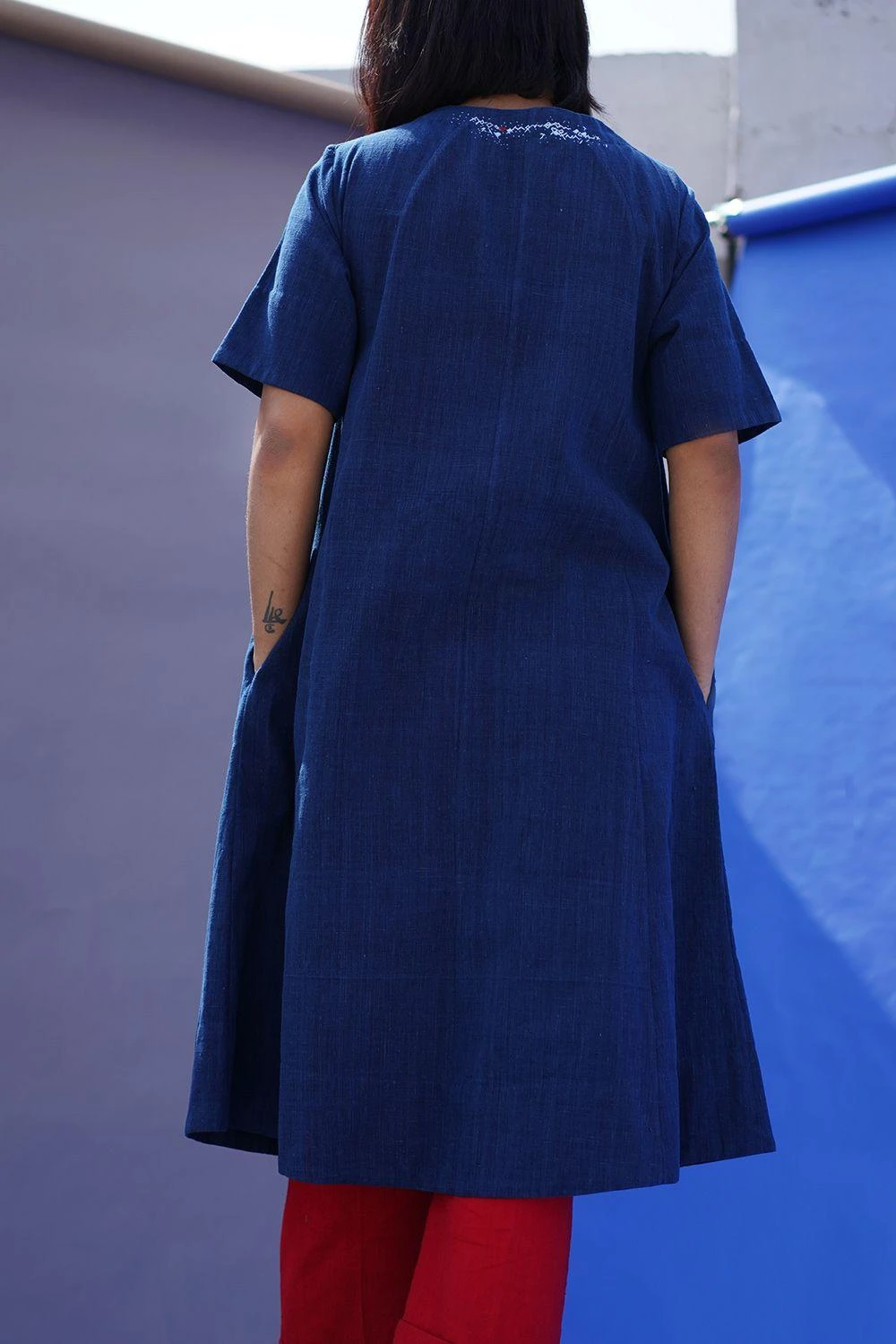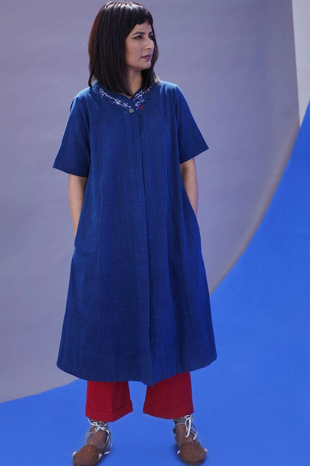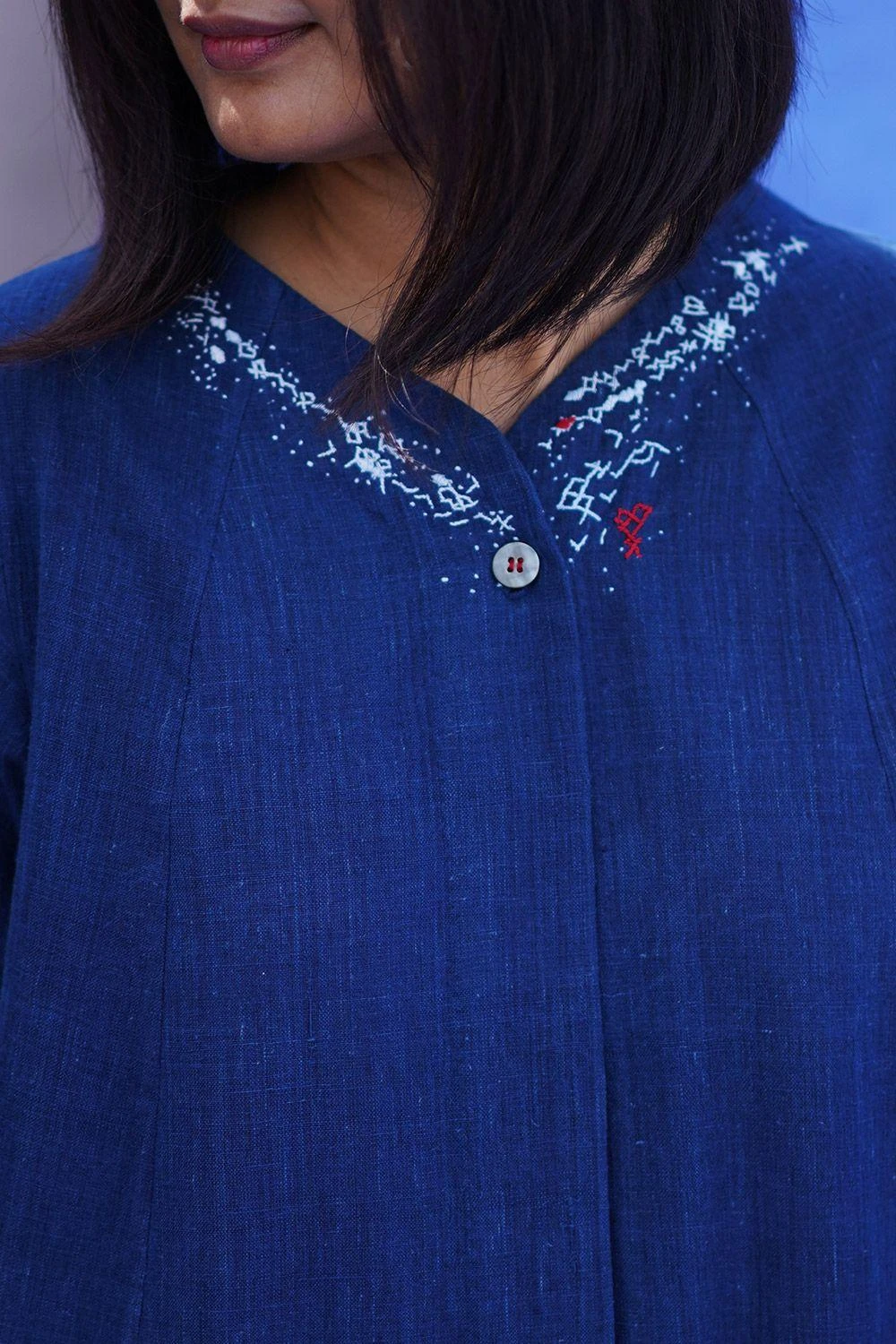 This A-line kalidaar front open tunic is handspun in natural dyed cotton. It is enhanced with hand embroidery on the neckline with mother of pearl buttons. Its relaxed silhouette allows you to go from day to night in ease.