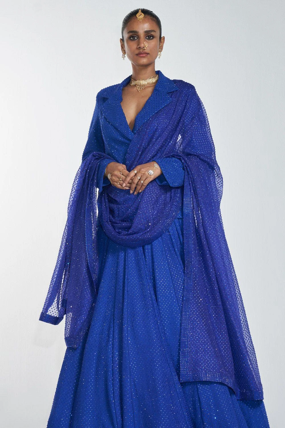 This breath-taking blue lehenga set heralds the beginning of Indian wear for the new age women. Its luxe fabrication & edgy silhouette makes it perfect for sangeet evening. The lehenga & blazer are made in crepe, while the dupatta is set in organza.
