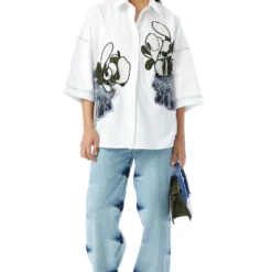 Indulge in effortless elegance with this white oversized embellished shirt. The intricate embellishments add a touch of glamour and sophistication to this classic piece. Pair it with denim for a chic and stylish look that is perfect for any occasion.