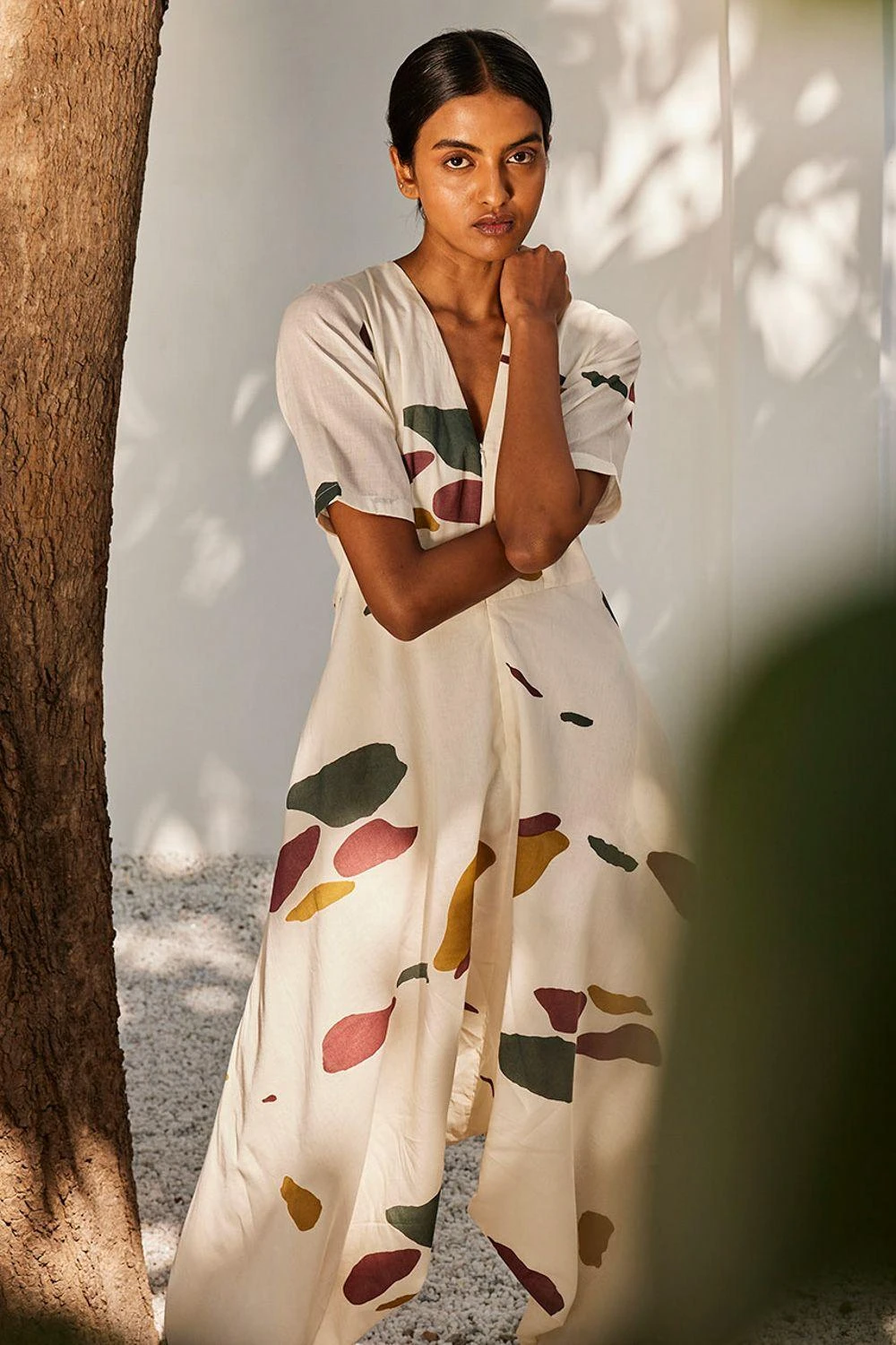 Step into elegance with this ecru terracotta print jumpsuit. A concealed zipper, attached lining, and stylish half sleeves make this a must-have for your sophisticated wardrobe.