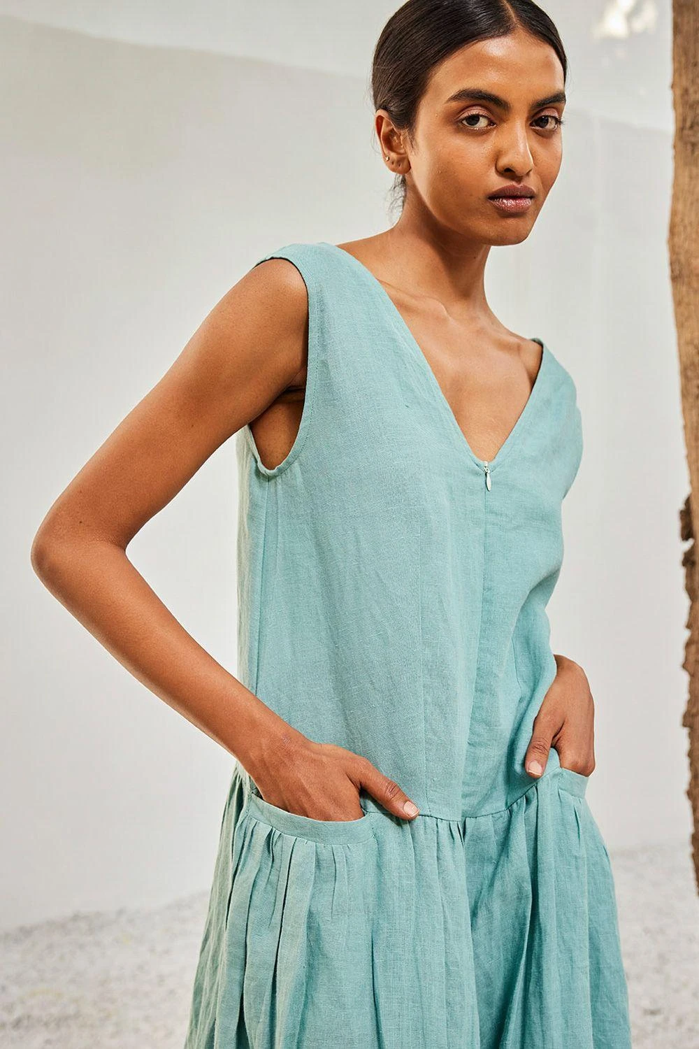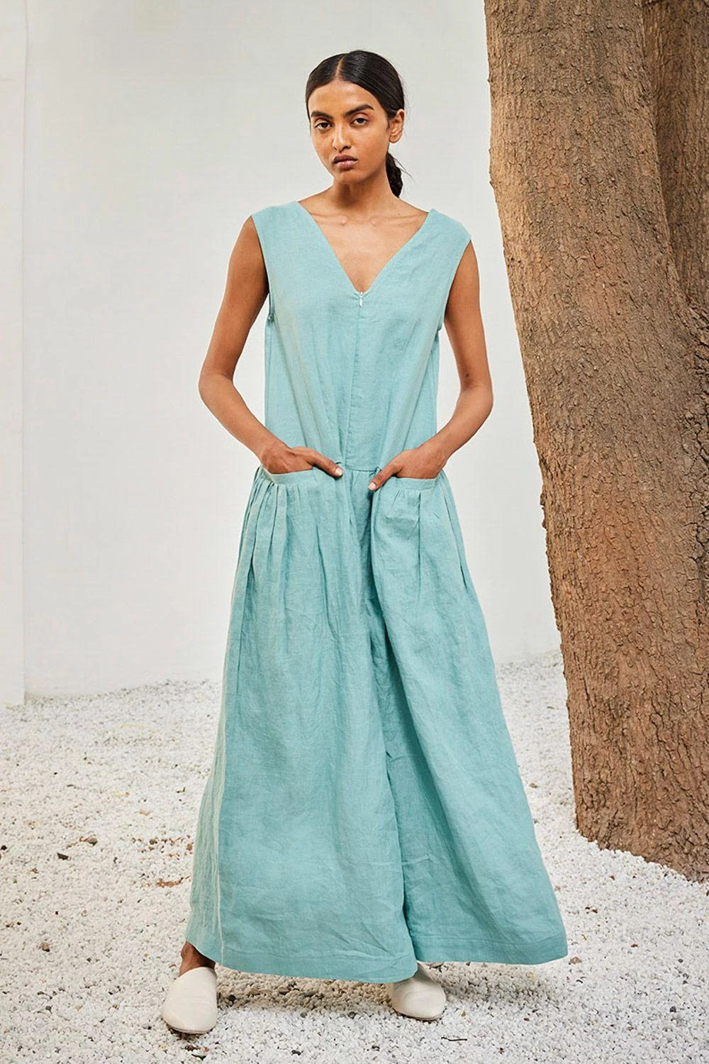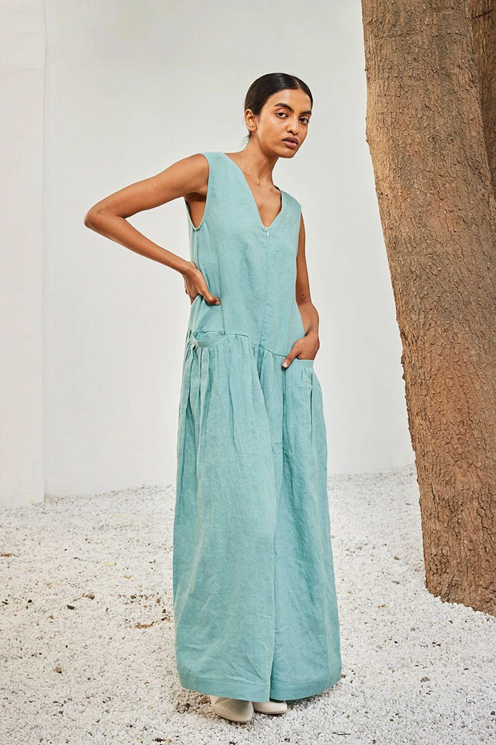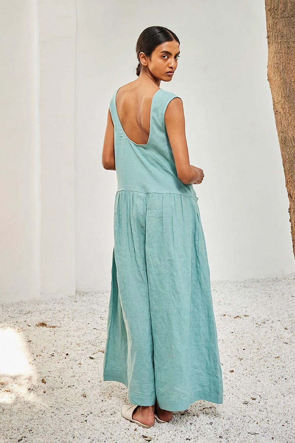 Elevate your style with this sage blue linen jumpsuit. Gathers at the waistline, a discreet front zipper, and a chic low back neckline make this piece perfect for summers