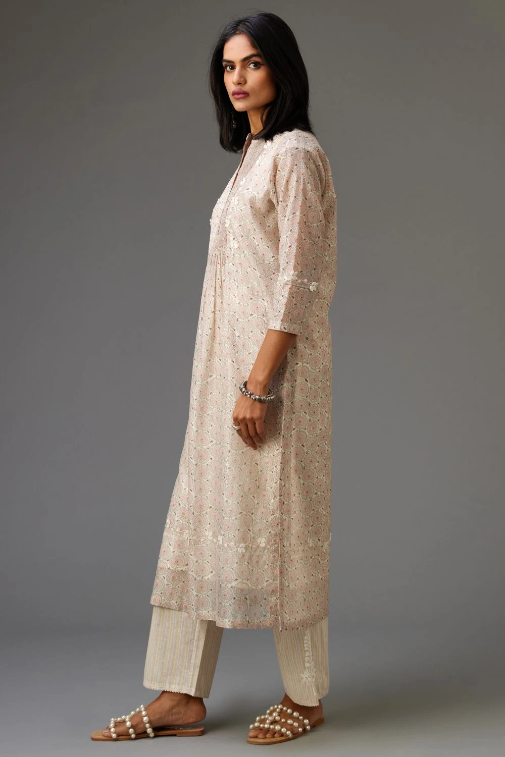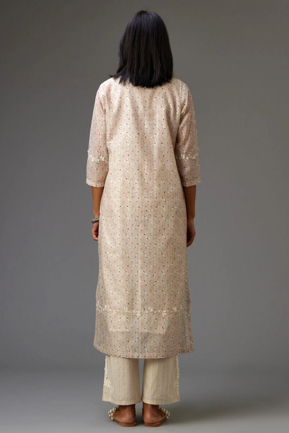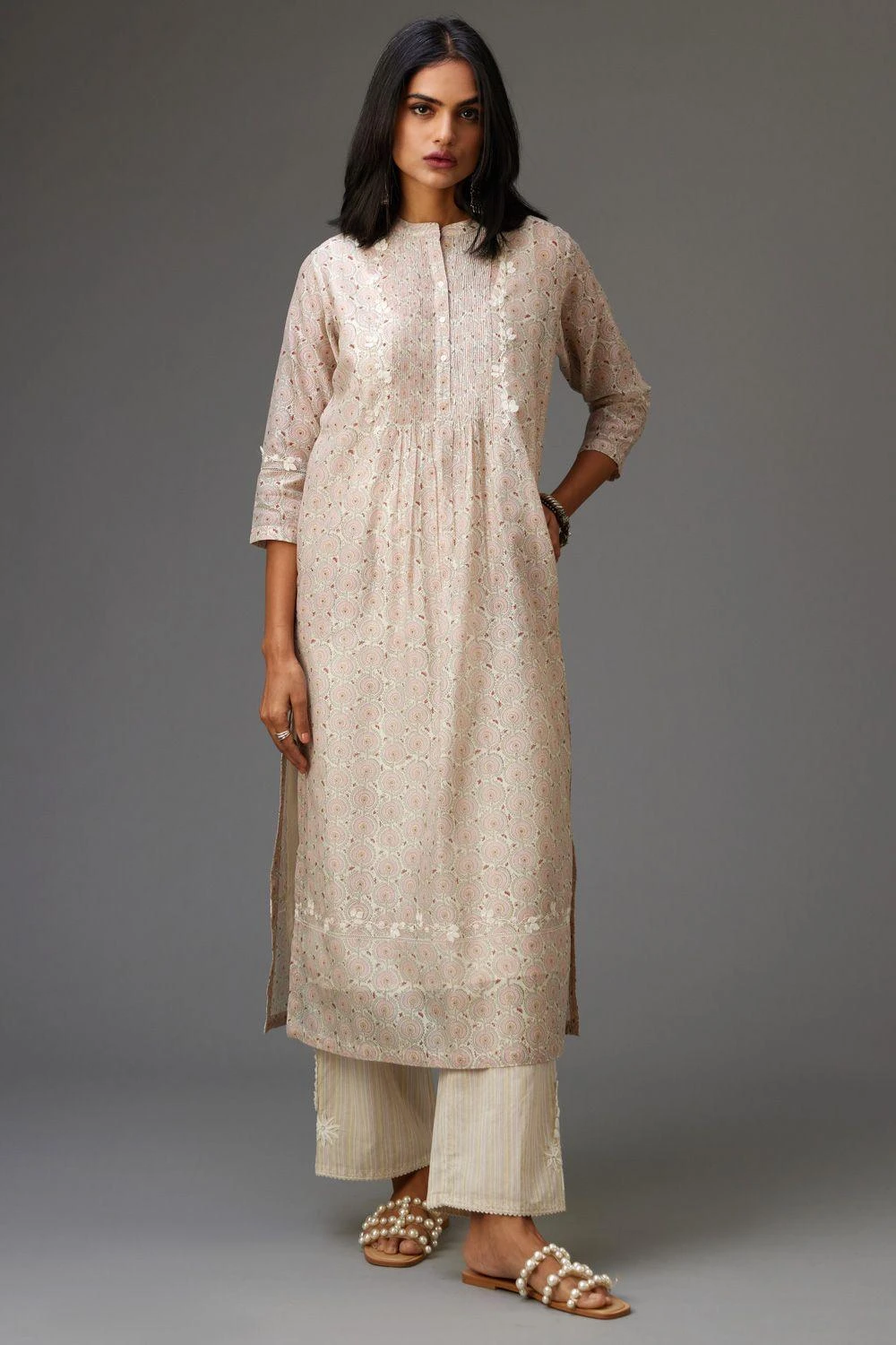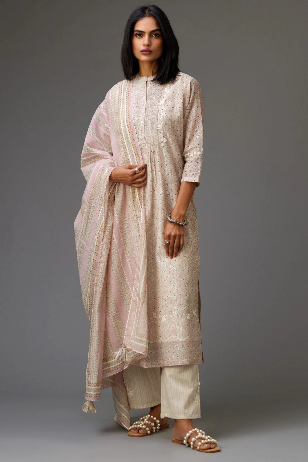 The perfect amalgamation of style and comfort, this kurta set is perfect for a day out. Crafted in silk chanderi, this set features a hand block printed kurta paired with coordinating straight pants and a floral dupatta.