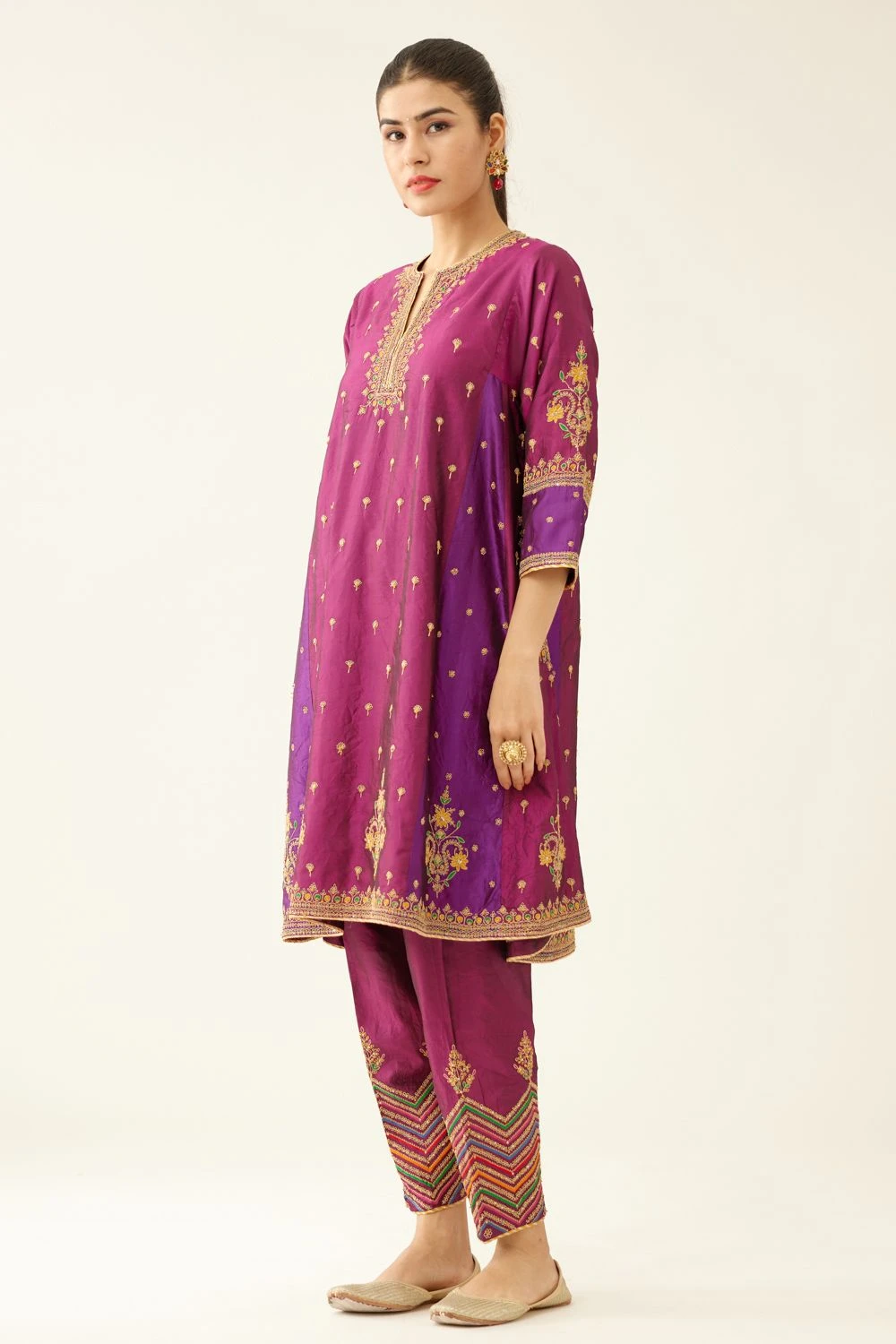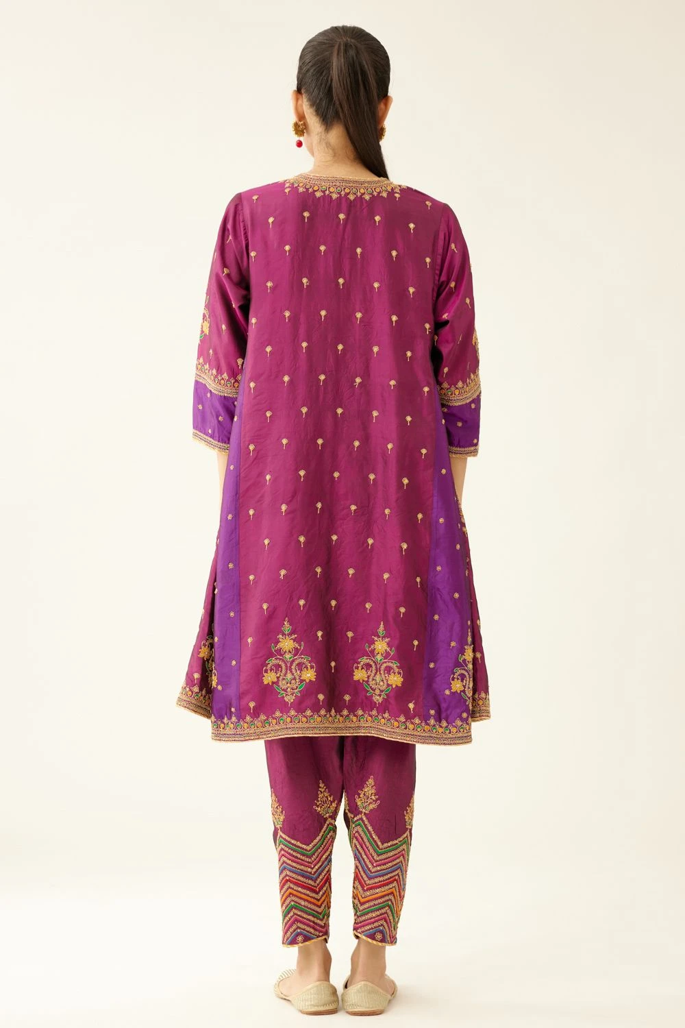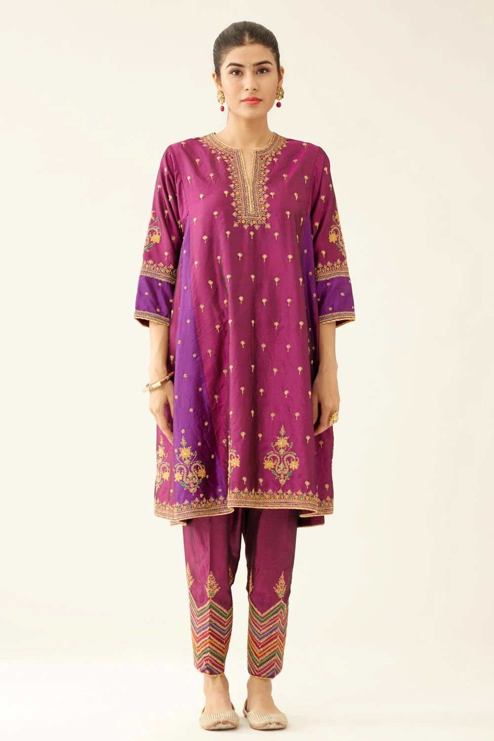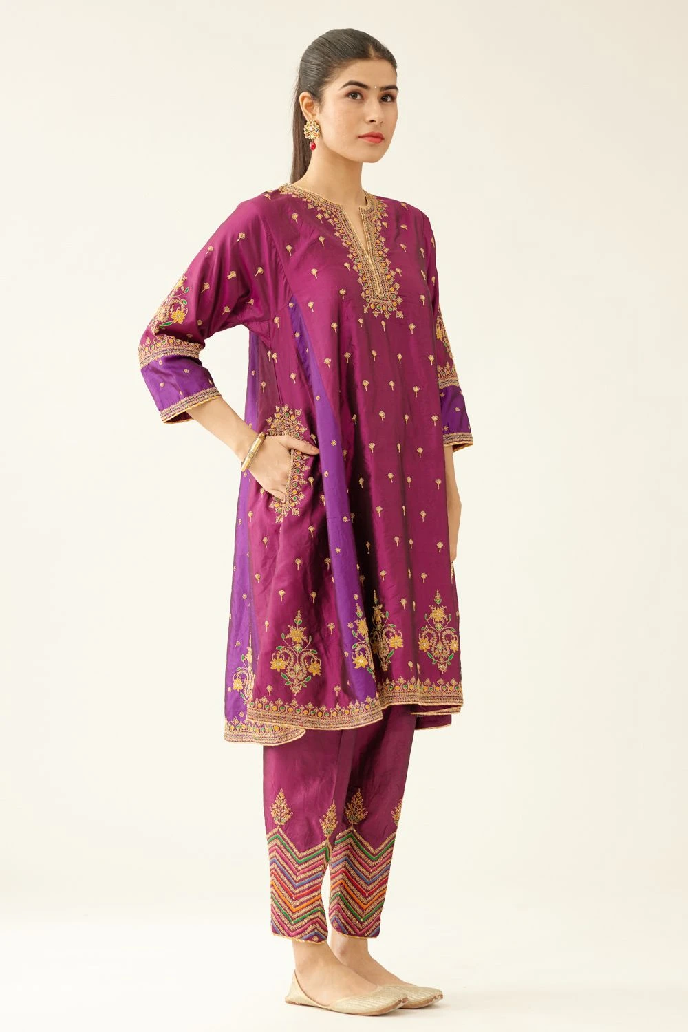 Make a statement with this Silk Kurta set. The kalidar kurta features intricate dori & silk thread embroidery adorned with sequin work. Paired with a matching salwar, this ensemble is completed with a dupatta, highlighting the exquisite embroidery.