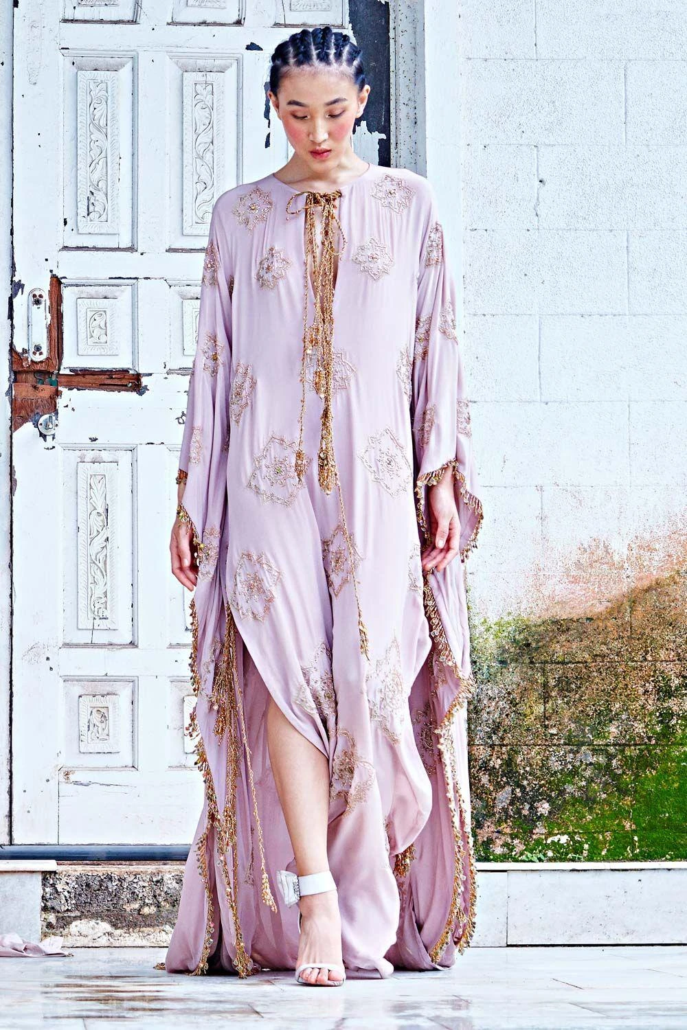 Step into luxury with this Pure Habutai Silk Kaftan, a testament to craftsmanship with 423 hours of intricate handwork. Lined with exquisite georgette, this opulent piece drapes you in elegance.