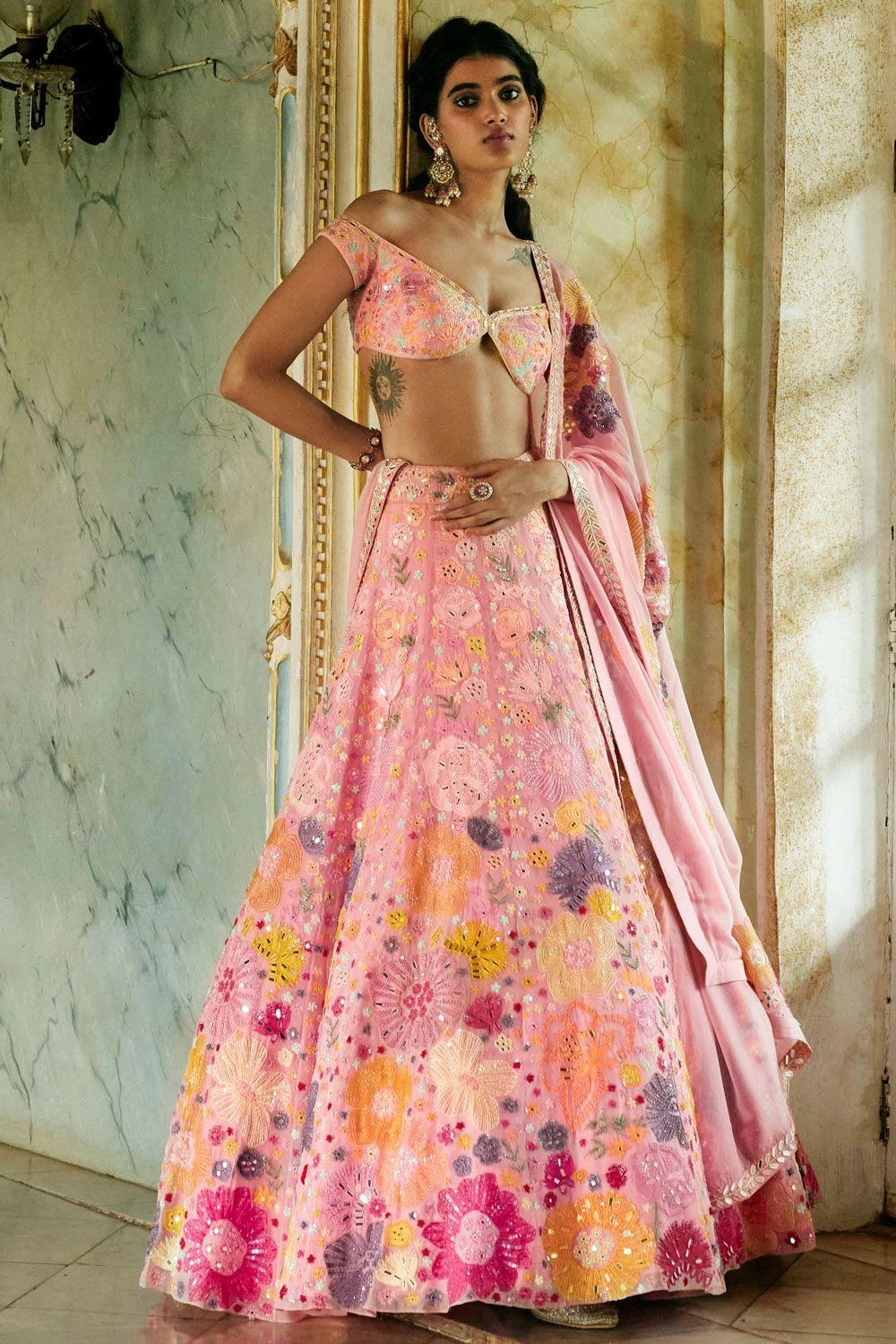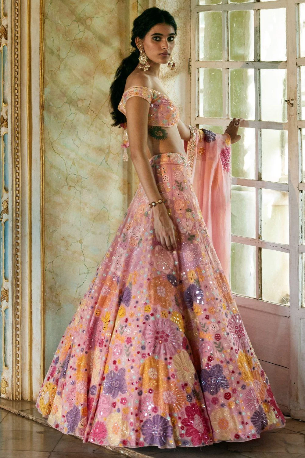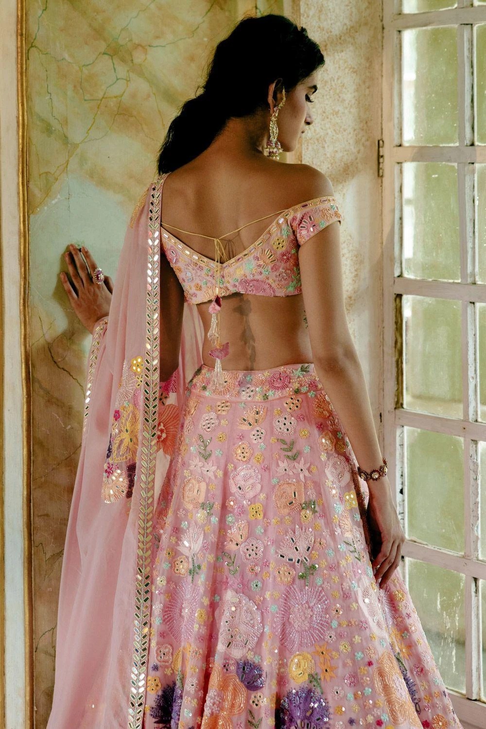 This blush pink embroidered lehenga set exudes magnificence with its every bit. The lehenga is cut in organza and adorned with precious flower embroidery covering every inch. It is paired with an off shoulder chanderi blouse & mirror work dupatta.