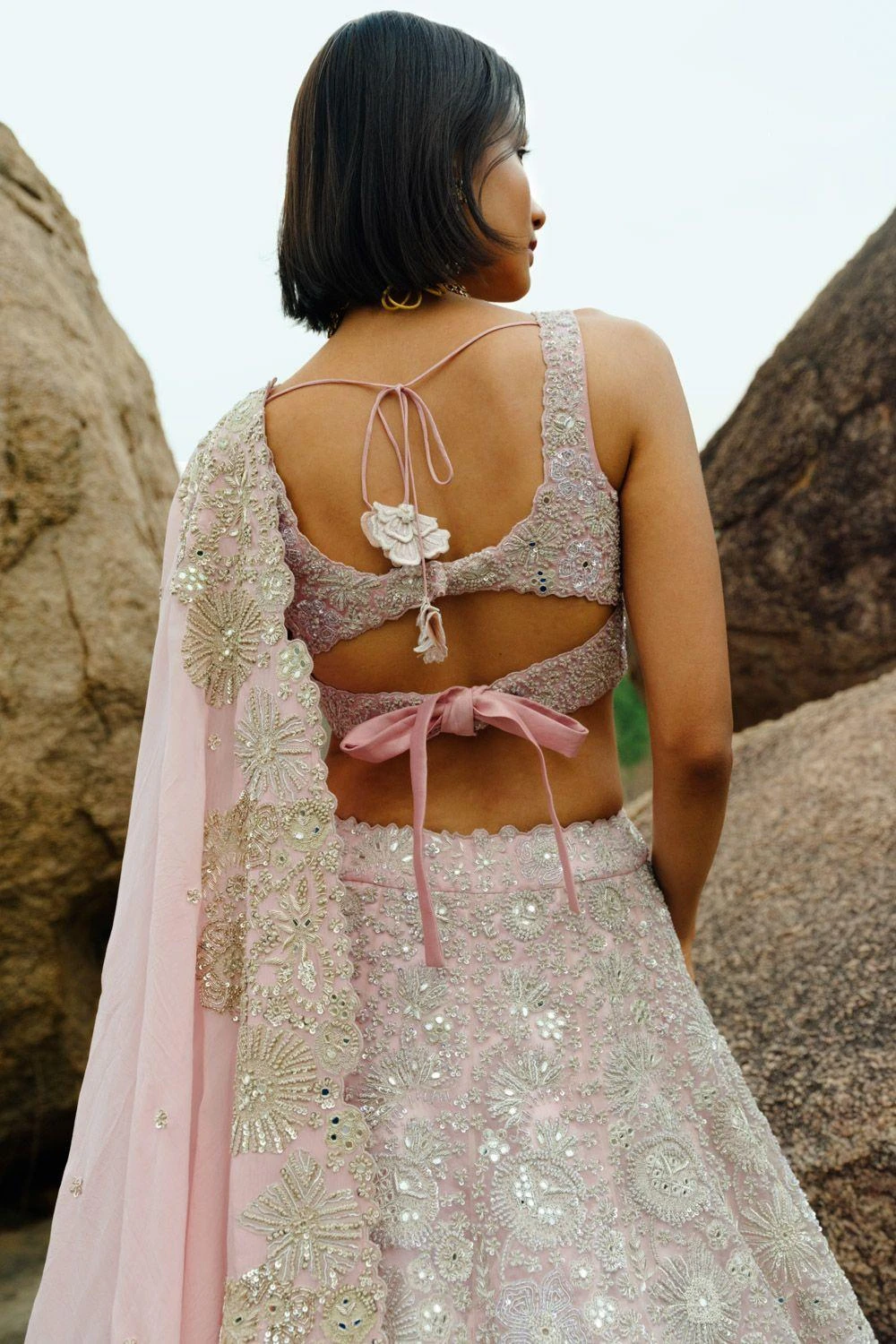 This pink lehenga set will see you through all kinds of festivities. It features a floral embroidered lehenga paired with a blouse & dupatta. This set is hand embroidered with silk threads, zari, french knots, mirror and sequin work.