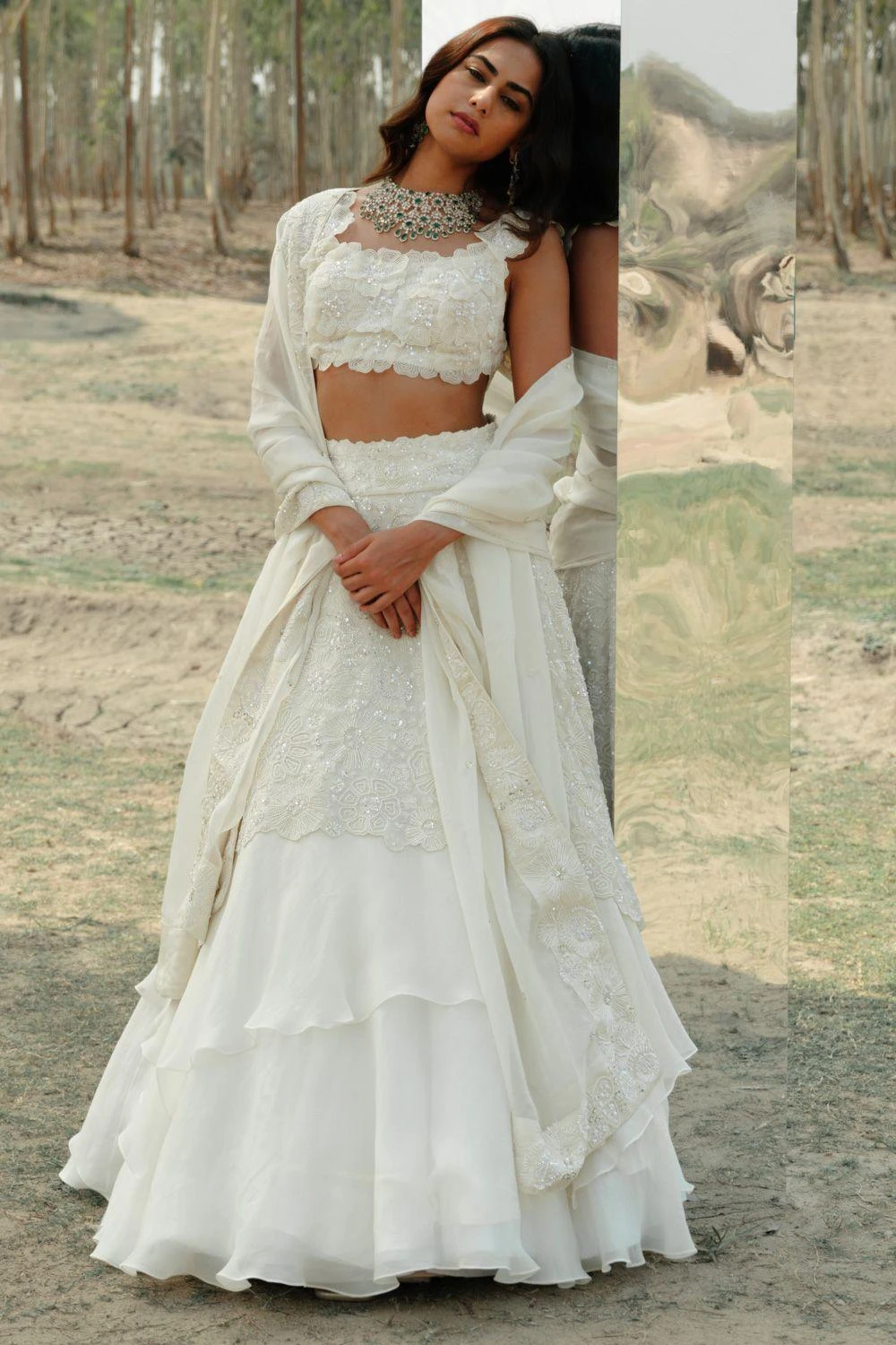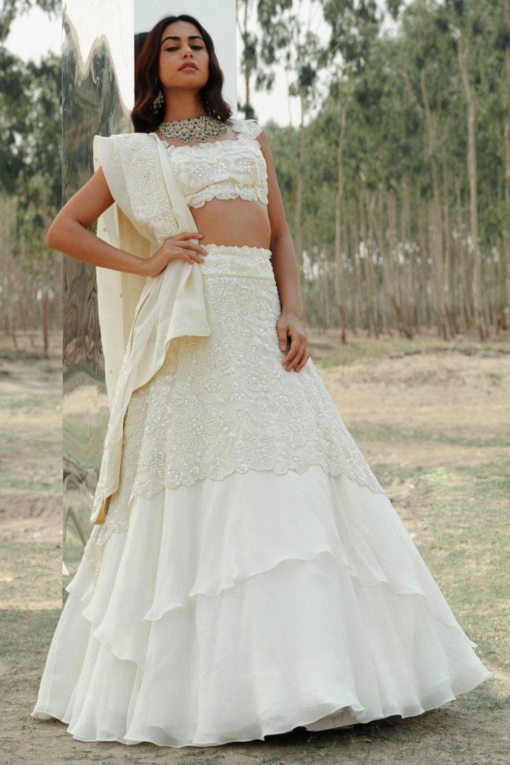 This lehenga set will see you through all kinds of fesivities. It features an embroidered lehenga paired with floral embroidered blouse and dupatta. This set features hand embroidery finished with silk threads, cutdana and sequin work.