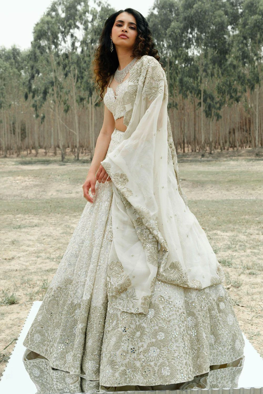 This lehenga set will see you through all kinds of fesivities. It features an embroidered lehenga paired with floral embroidered blouse and dupatta. This set features hand embroidery finished with silk threads, cutdana and sequin work.
