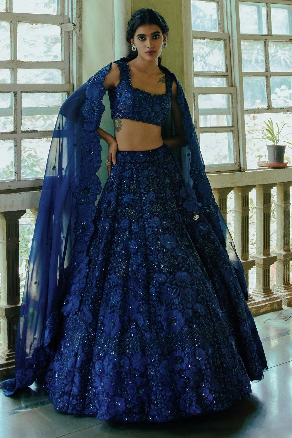 Nothing speaks of glamour more than this navy blue embroidered lehenga set. The lehenga is deftly designed in organza base and uplifted with floral embroidery. It is paired with a square neck scalloped blouse & organza dupatta.