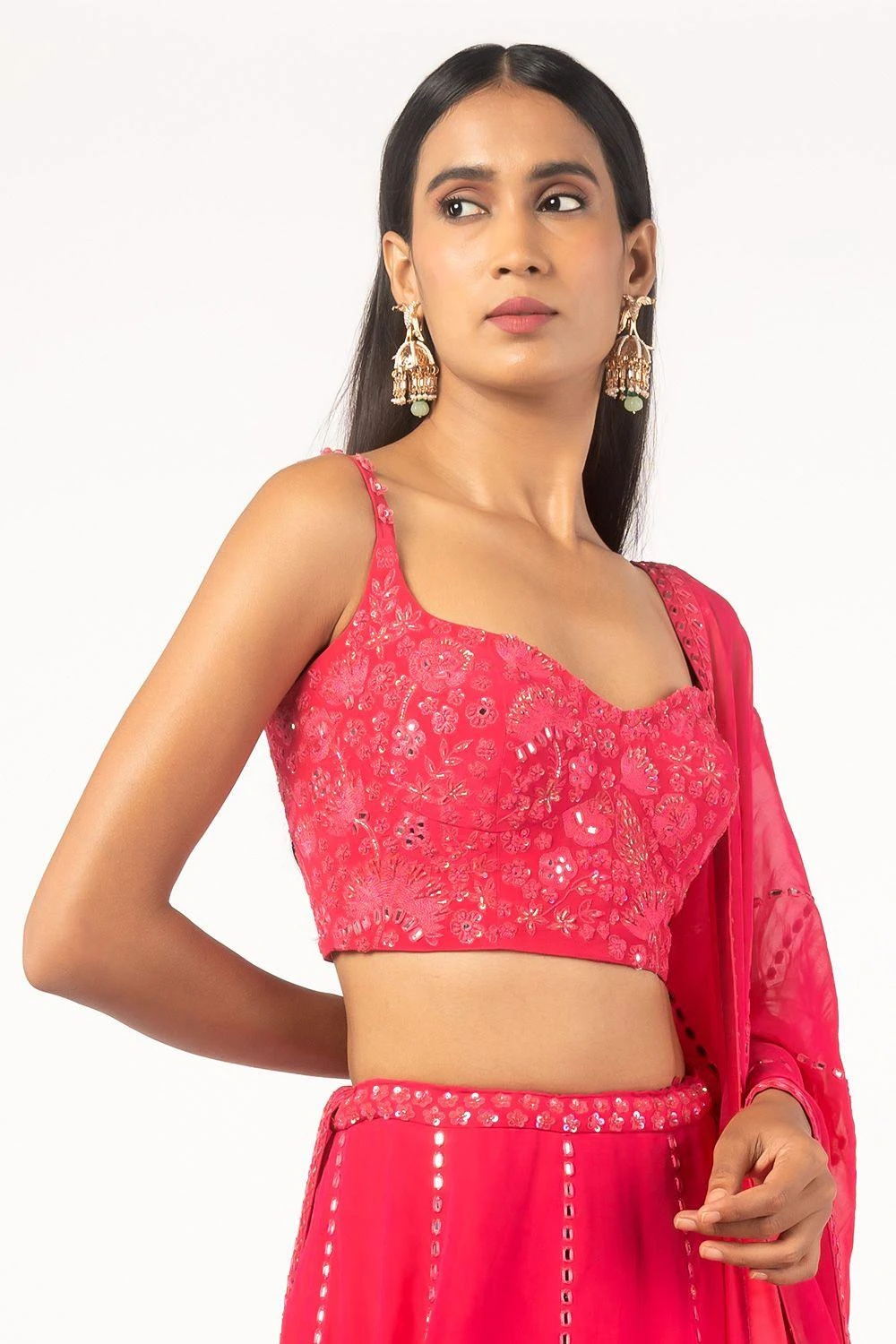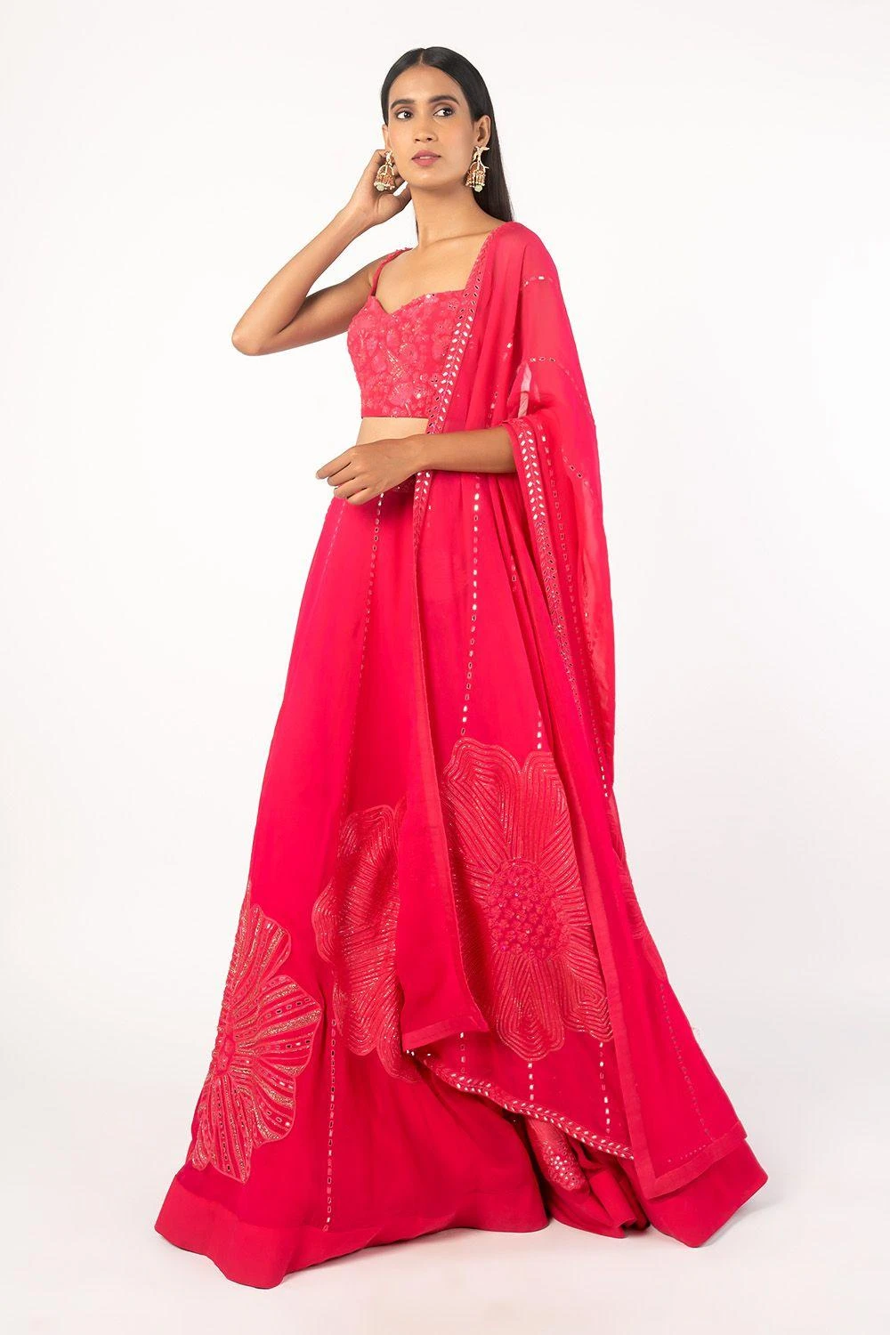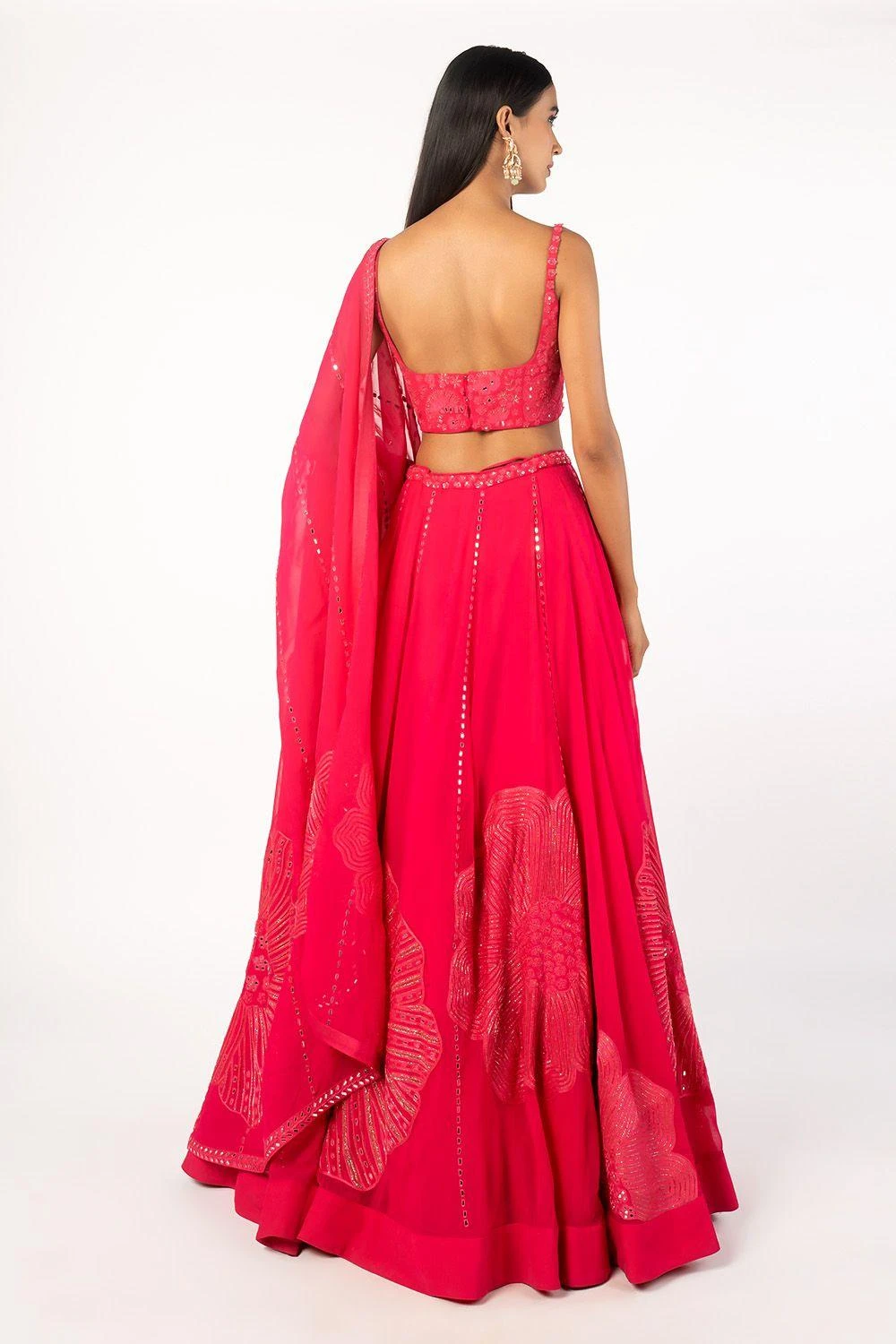 This pink embroidered lehenga set will see you through all kinds of celebrations. It features mirror work and floral embellishments on the blouse and lehenga. Add an elegant necklace with this look for your reception or sangeet.