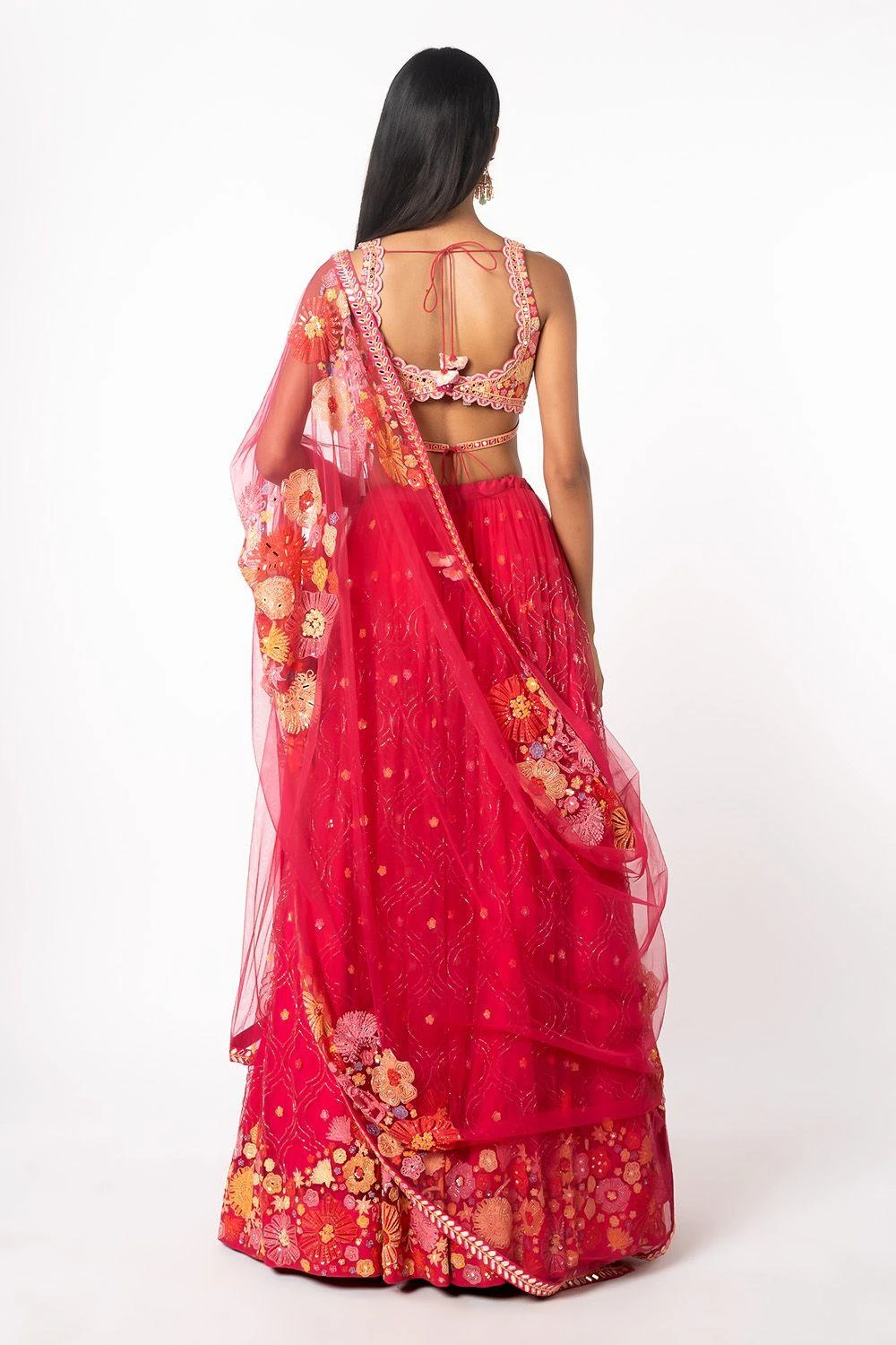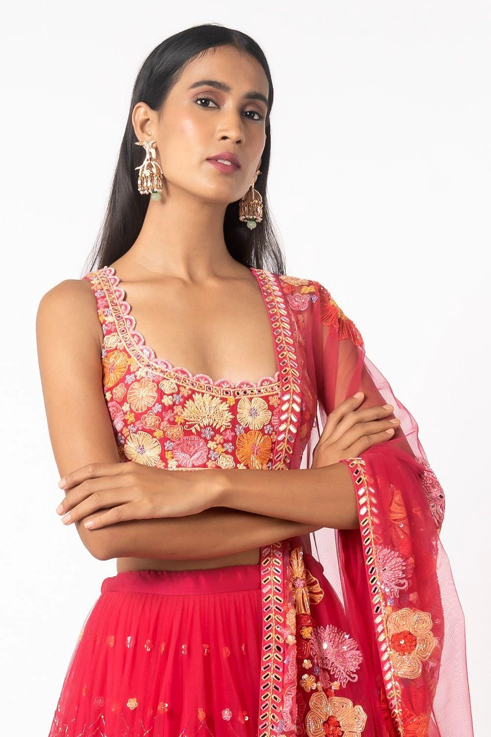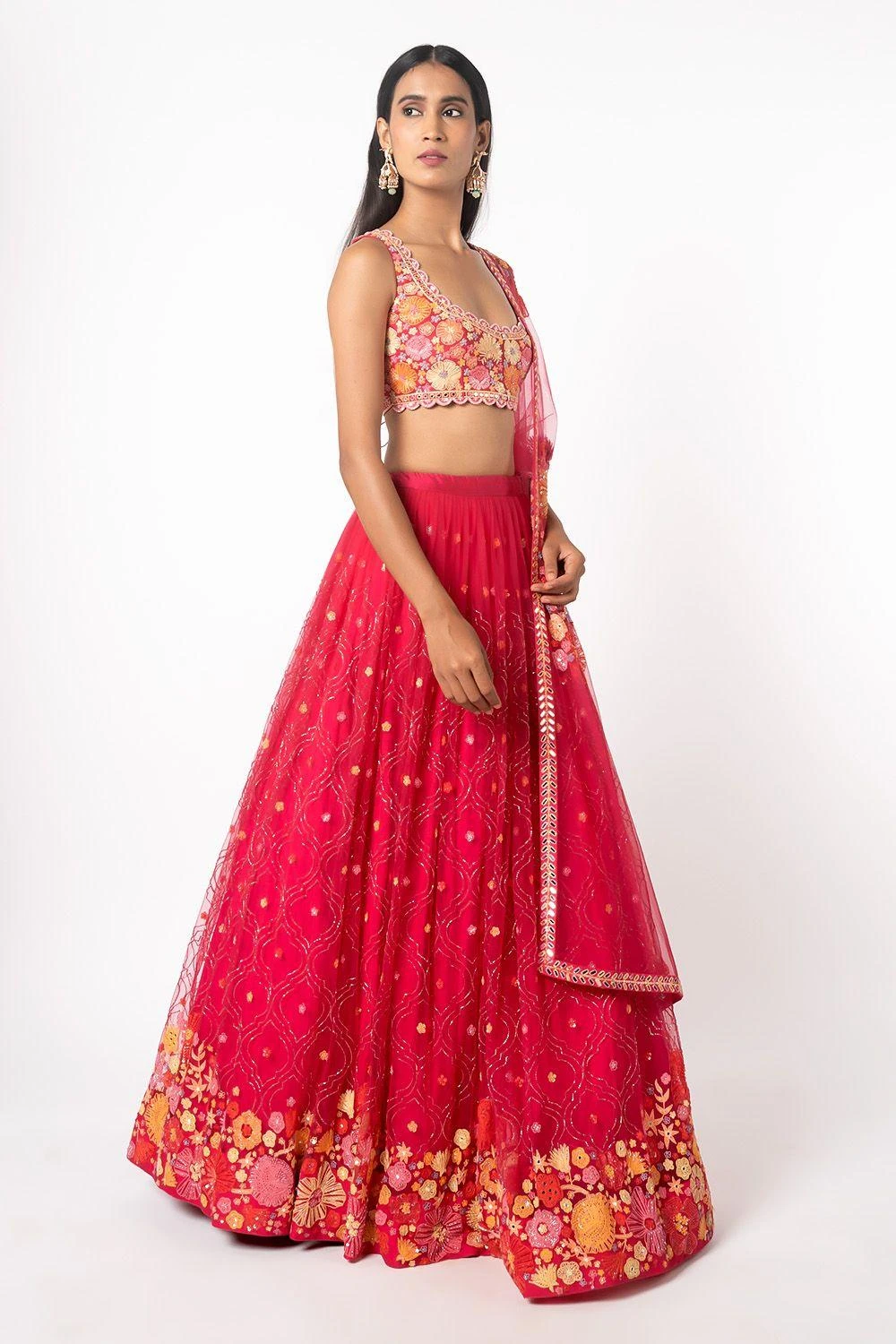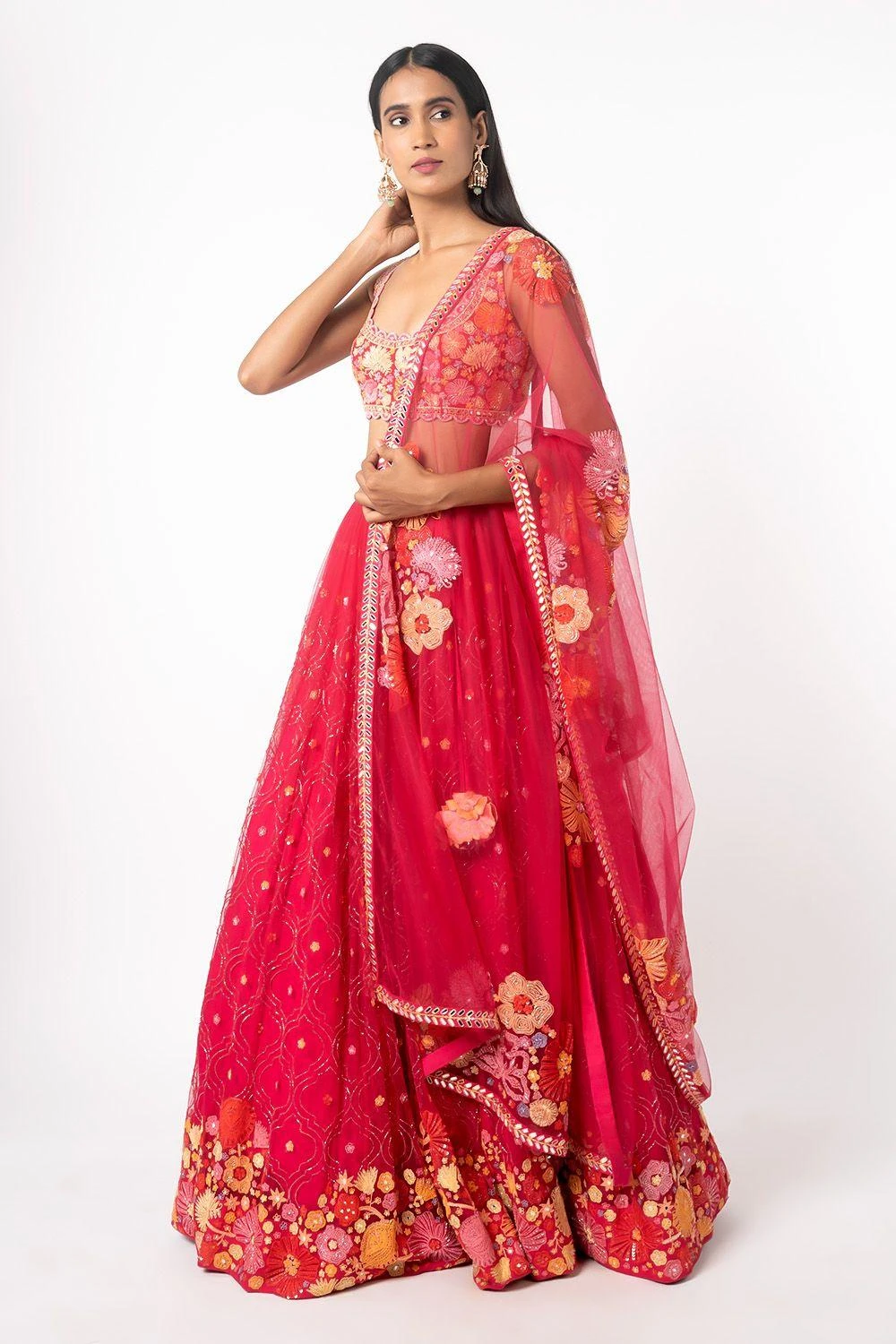 This pink embroidered lehenga set will see you through all kinds of celebrations. It features crystal and floral embellishments on the blouse and lehenga. Add an elegant necklace with this look for your reception or sangeet.